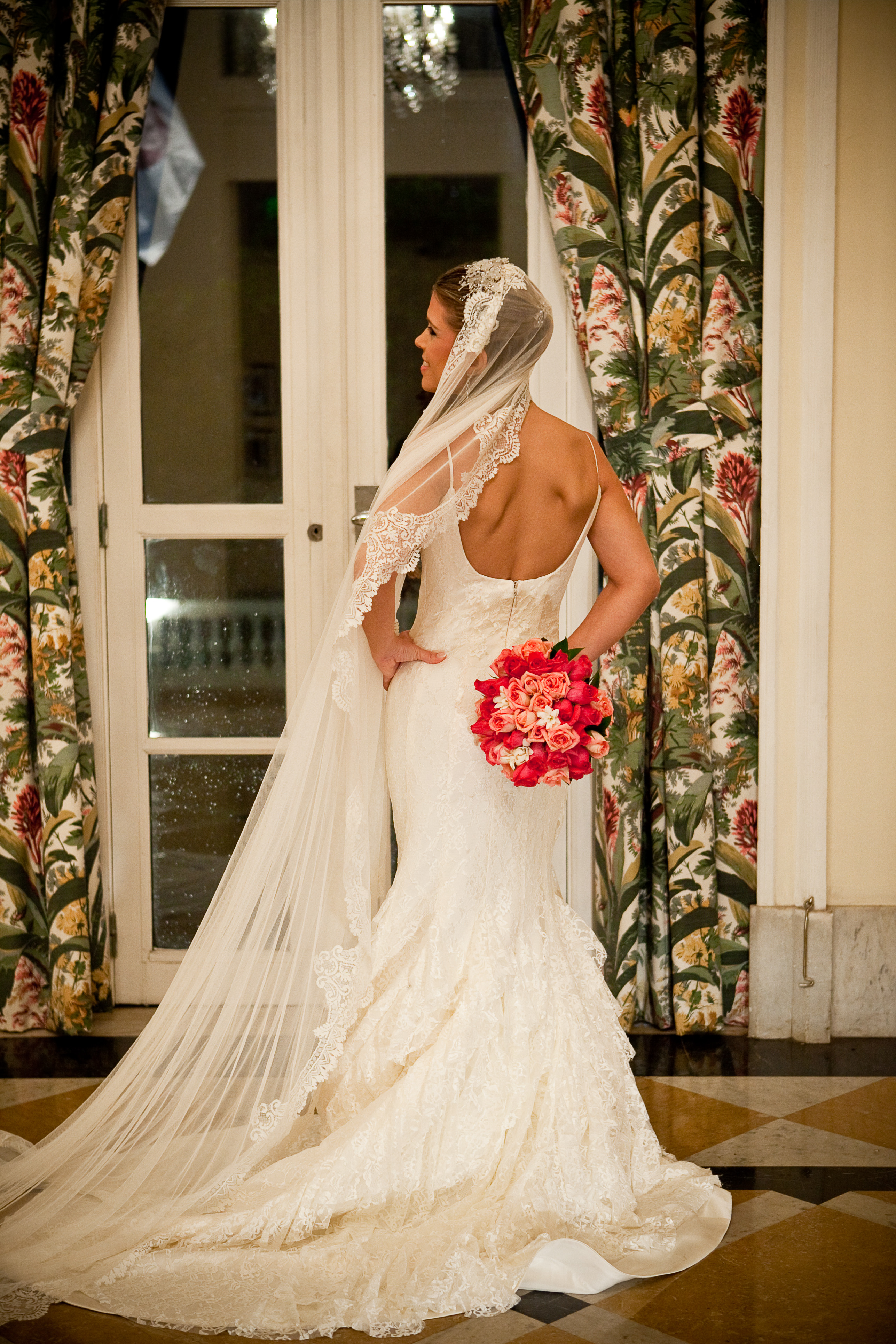 Vestido de renda Espanhola com laço. Mantilha sevilhana de tule de seda.