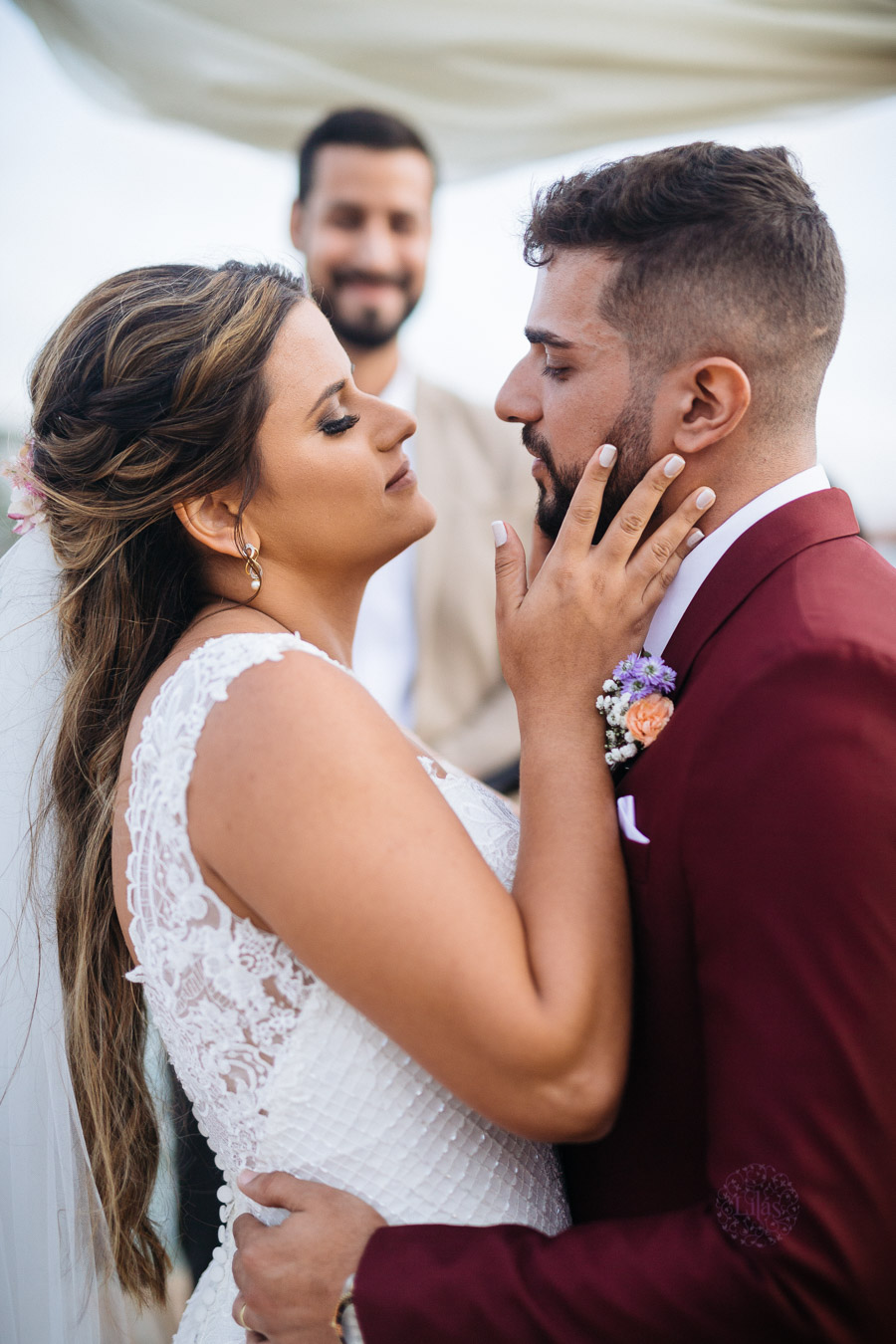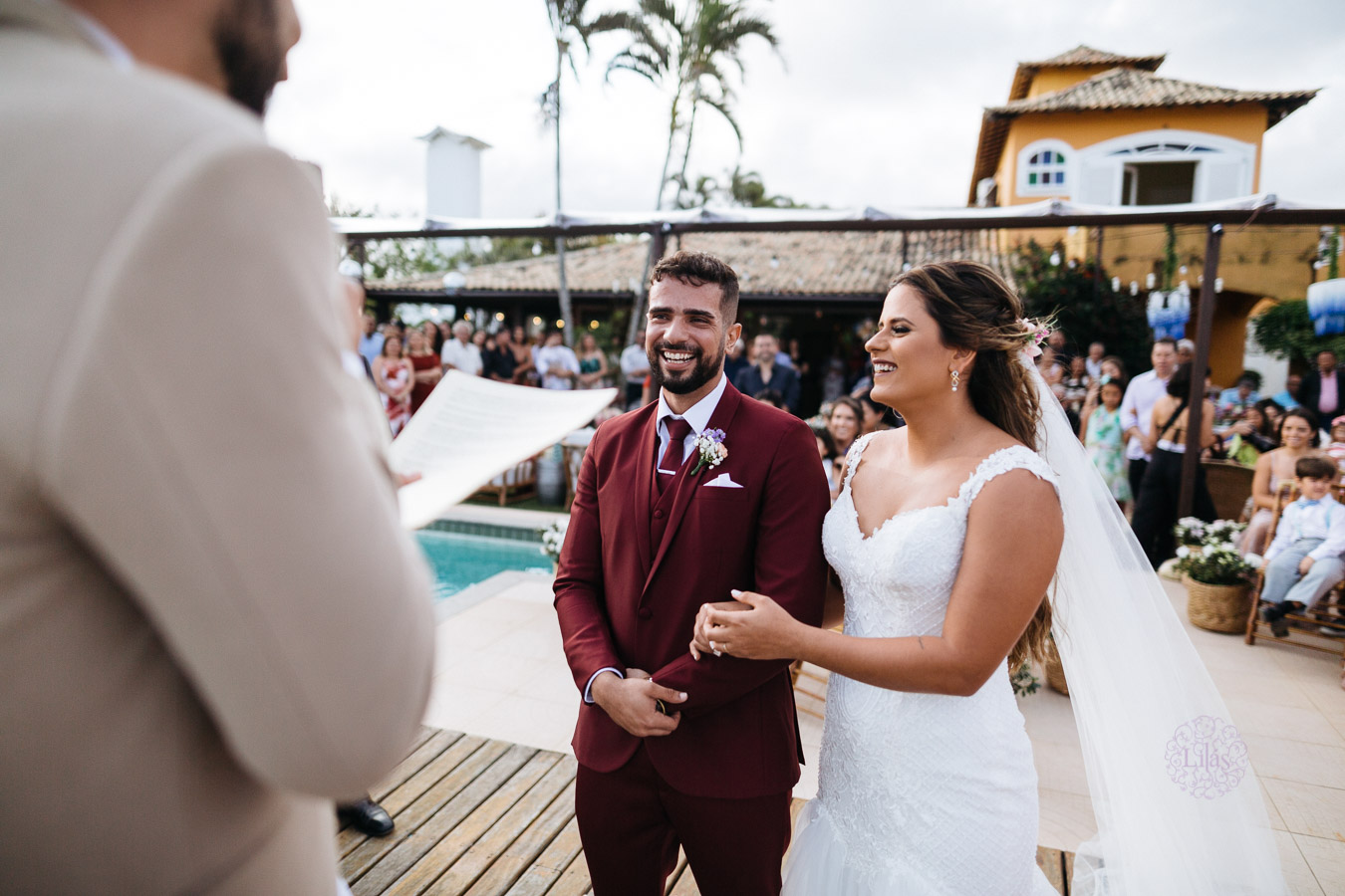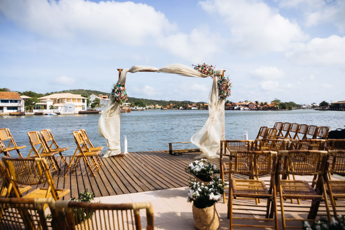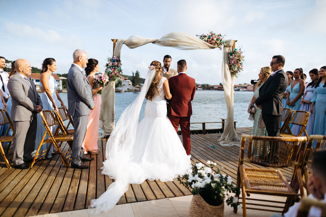 A cerimônia na praia, com tudo que uma noiva tem direito: convidados que torcem pela felicidade do casal, muito amor envolvido, decoração impecável e uma vista que parecia de filme.
