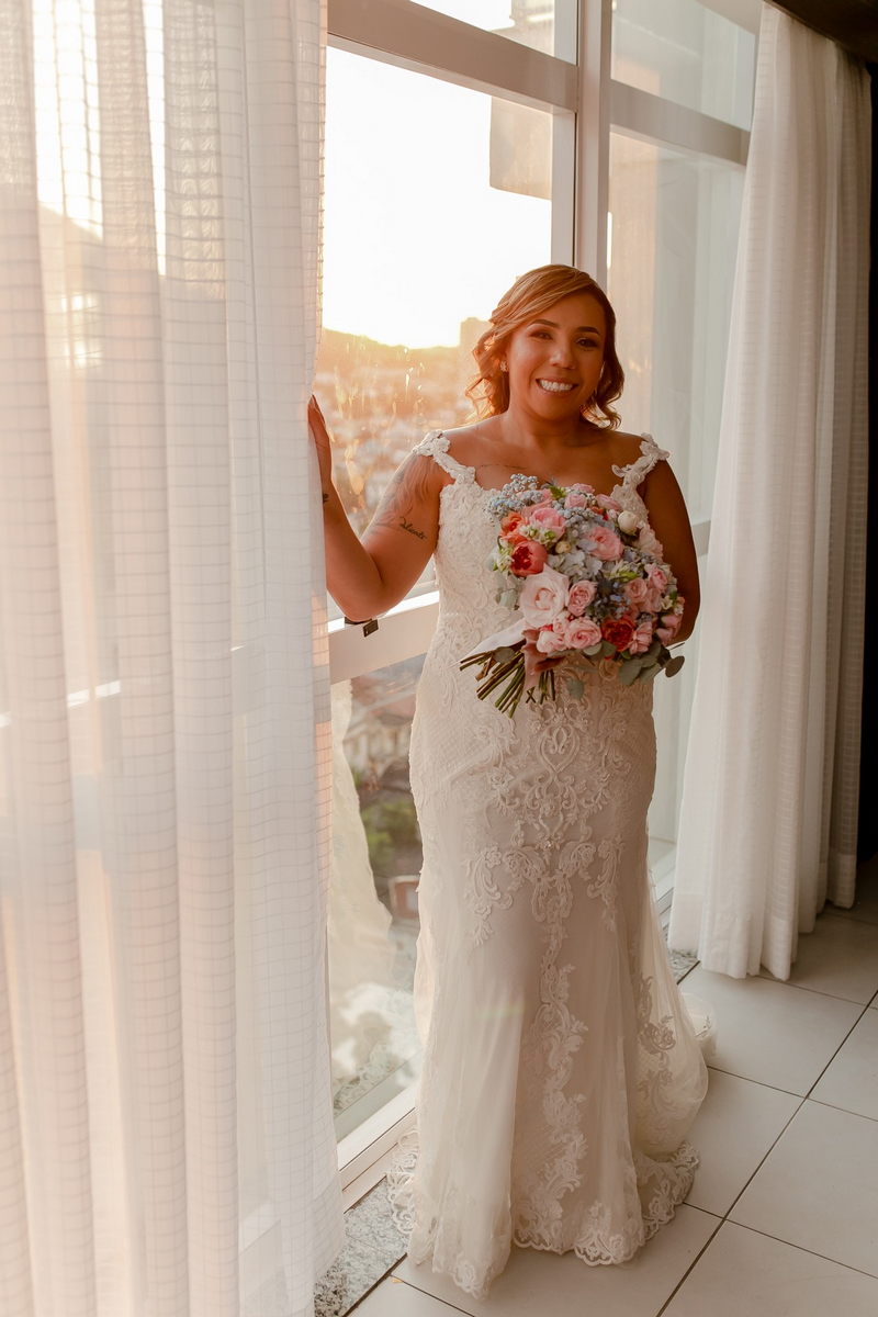 Nem precisamos falar que ela ficou ainda mais maravilhosa e encantadora, a renda trouxe romantismo e o decote sensualidade ao look. Ela estava vestida como uma verdadeira princesa em seu vestido de noivas Internovias!