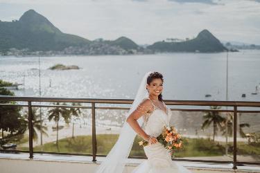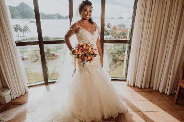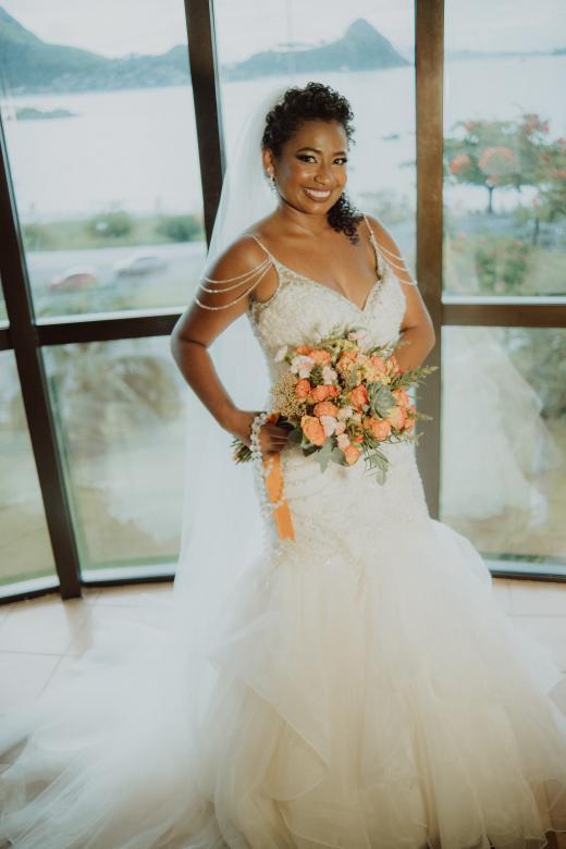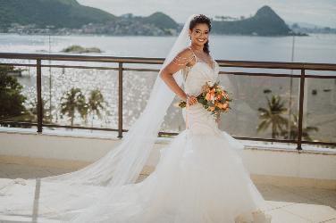A beleza da Tay é impossível de descrever, ela estava deslumbrante usando seu vestido noiva Internovias rendado e com decote especial nas costas cheio de detalhes em correntes e pedrarias, realçando ainda mais a sua beleza. Seus passos, que lembravam o de uma verdadeira princesa, encantaram a todos os convidados.