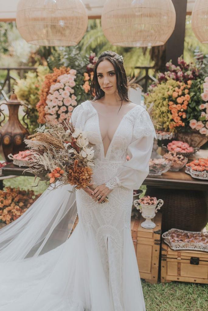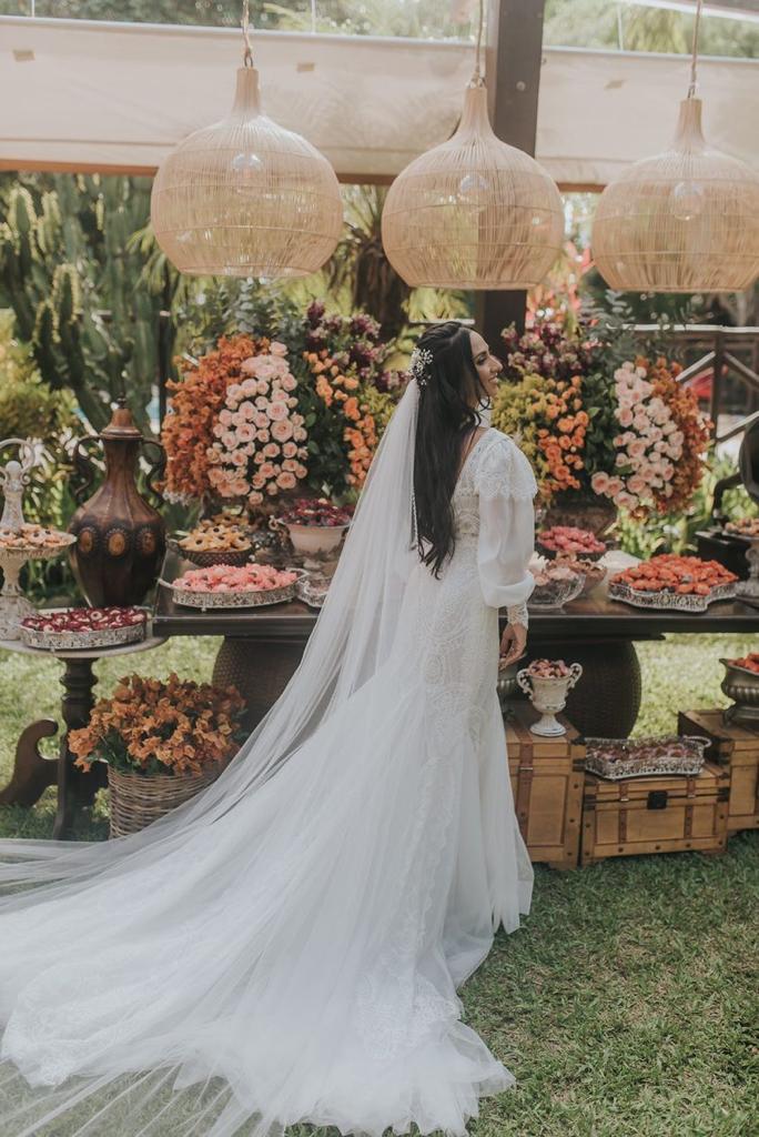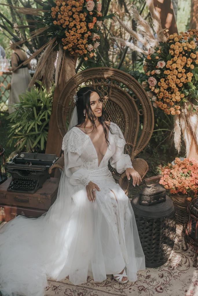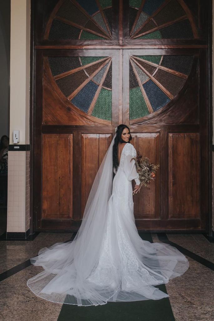 A Maria estava simplesmente deslumbrante, por onde passou despertou os mais belos sentimentos. Nossa noiva escolheu um vestido de noiva Internovias divino, com um incrível decote frontal, manga bufante e um caimento perfeito que realçou ainda mais a sua beleza e seu alto astral!