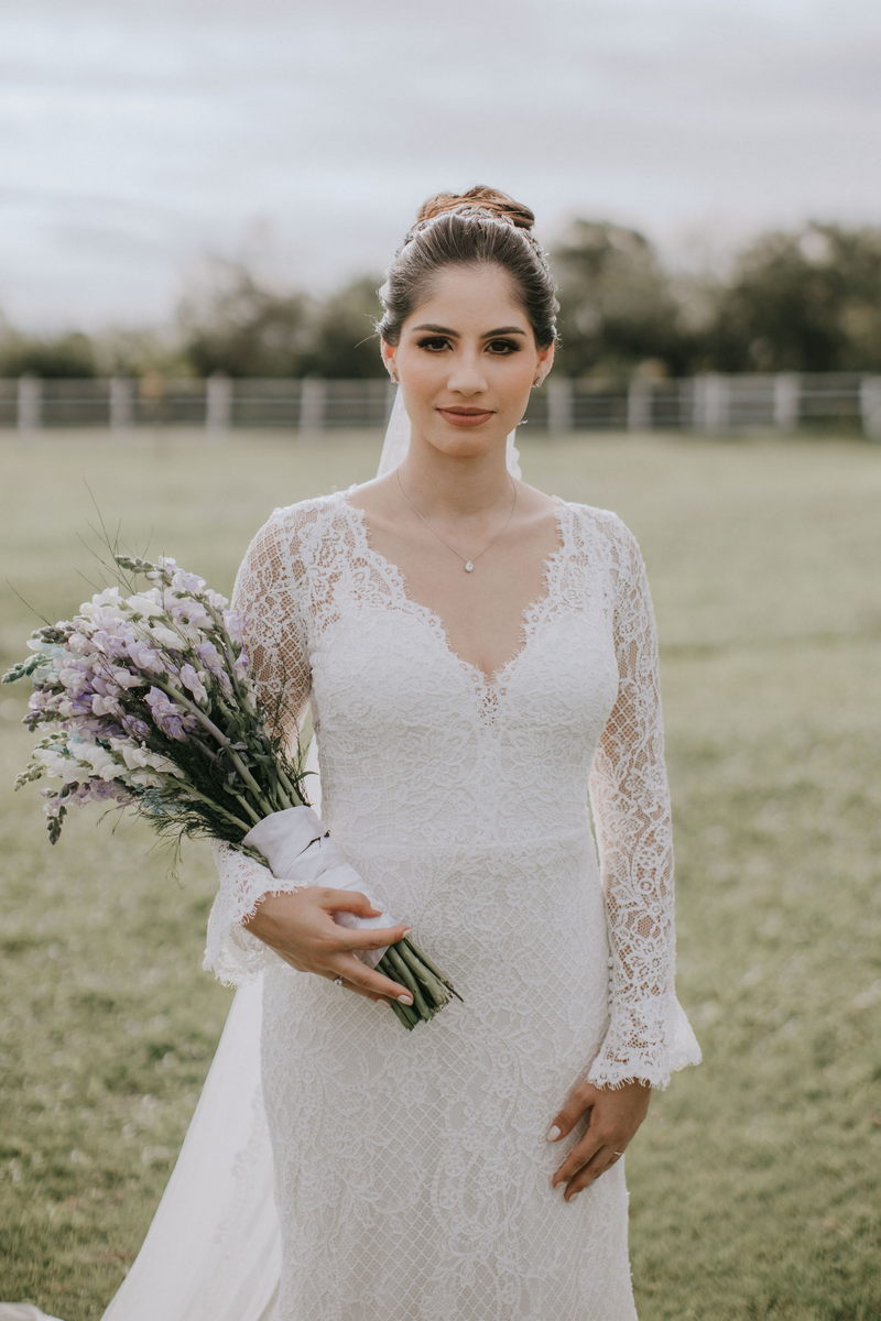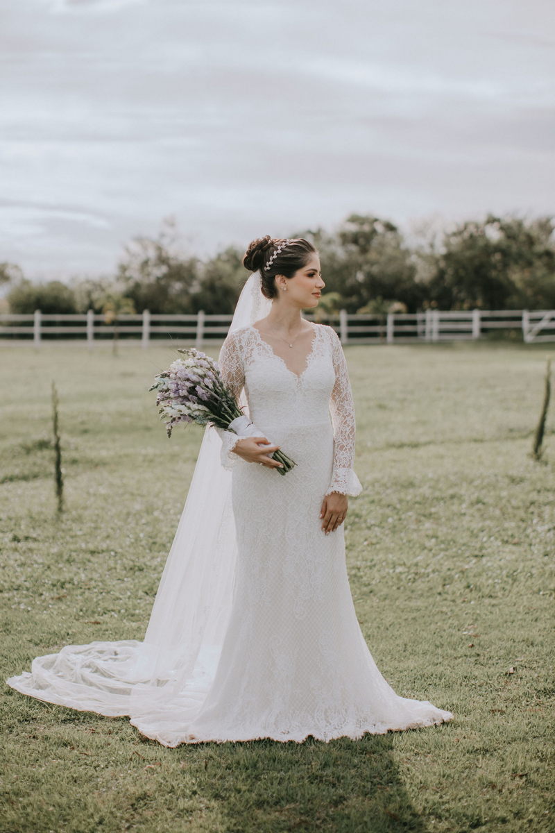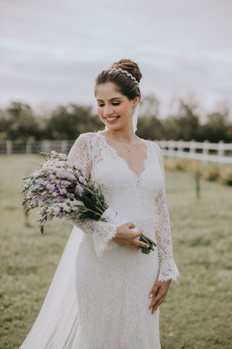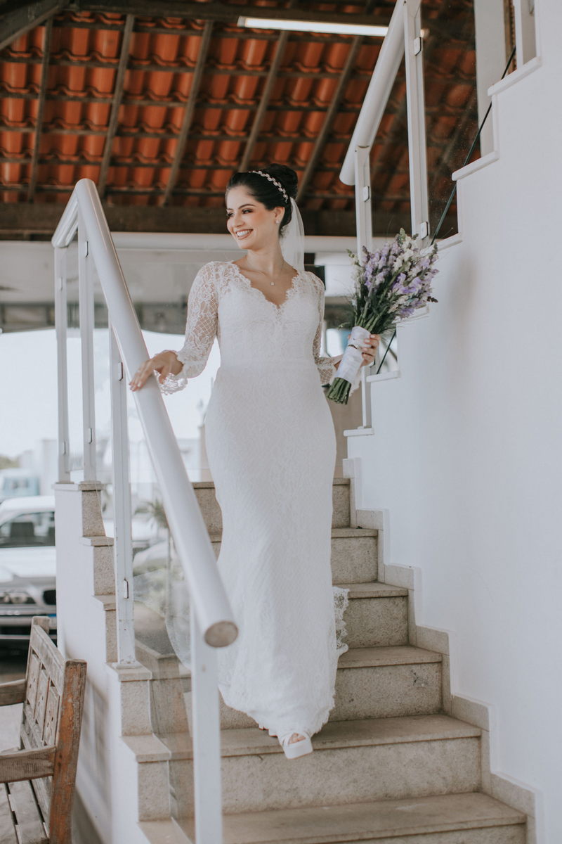 A Carol se casou com um modelo Internovias bem delicado, com manga longa, trabalhado em renda diferenciada e tecido super romântico. O look foi complementado pelo seu inspirador buquê, e pela maquiagem e cabelo impecáveis feitos pelas mãos talentosas da @rfbstudio. Tudo perfeito a fez brilhar ainda mais!