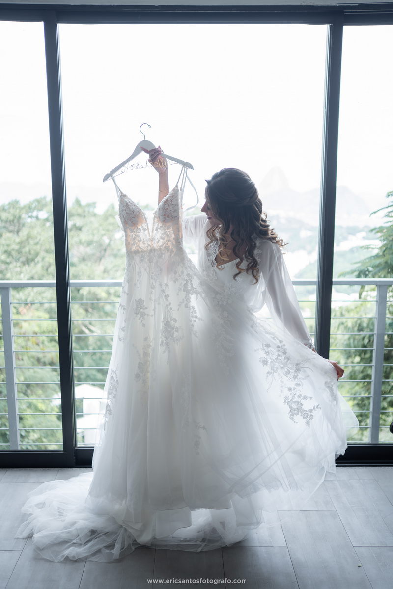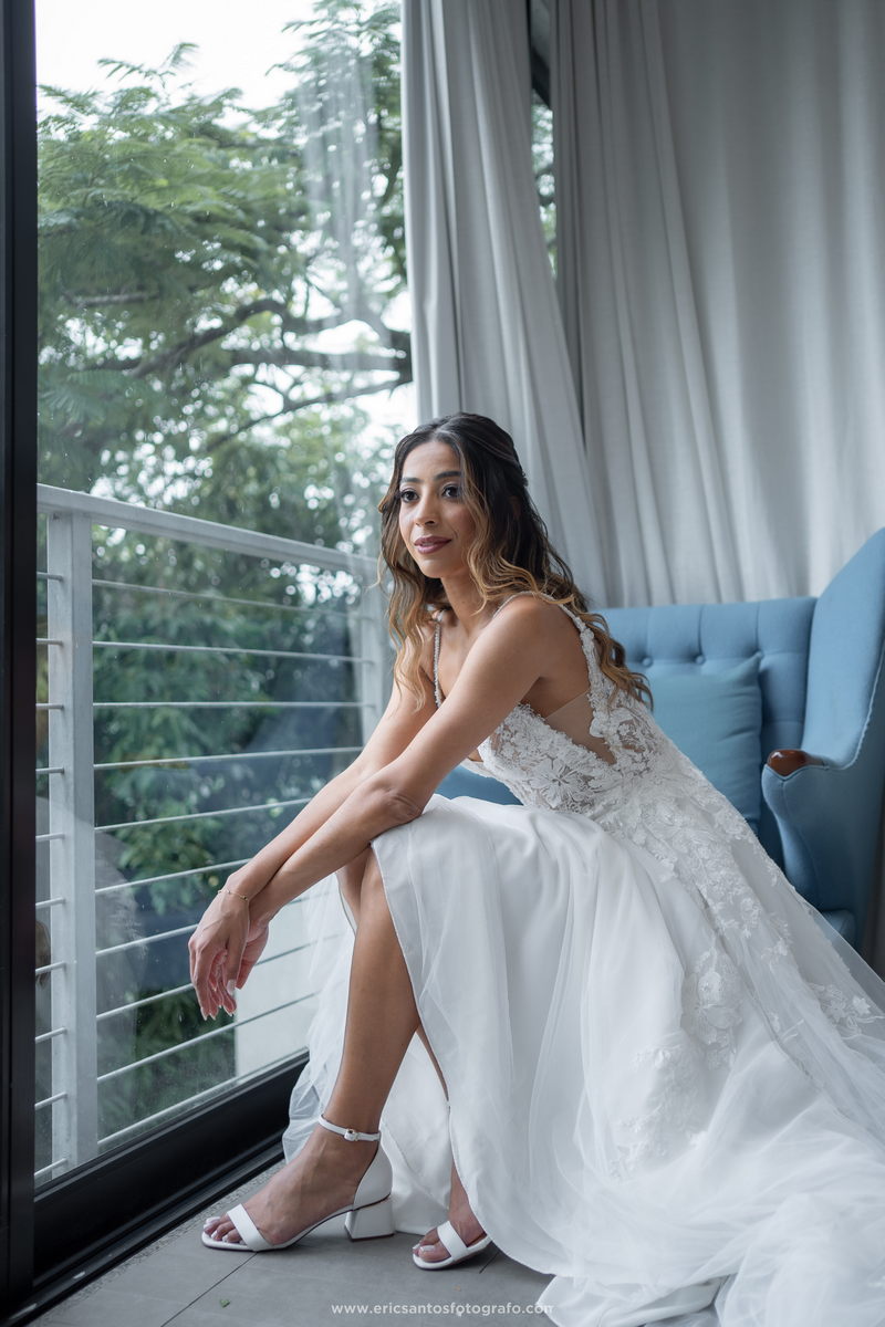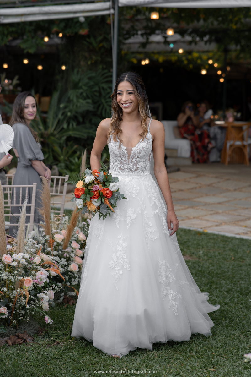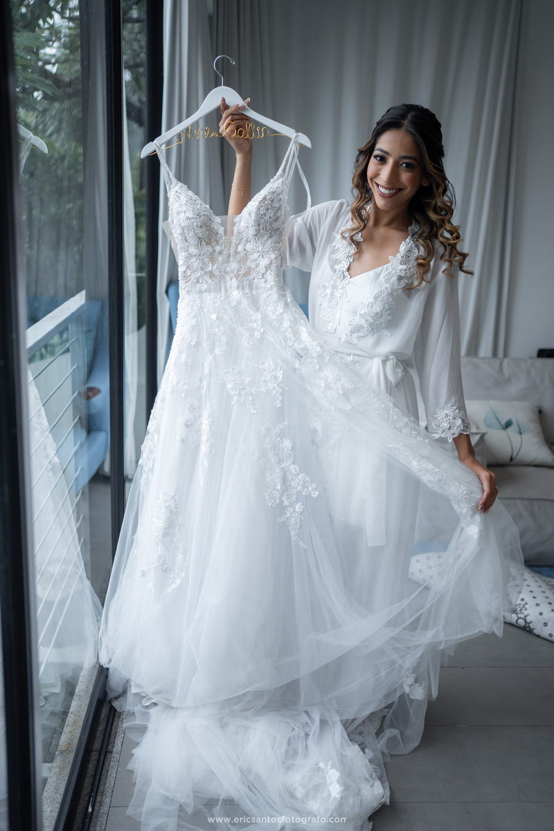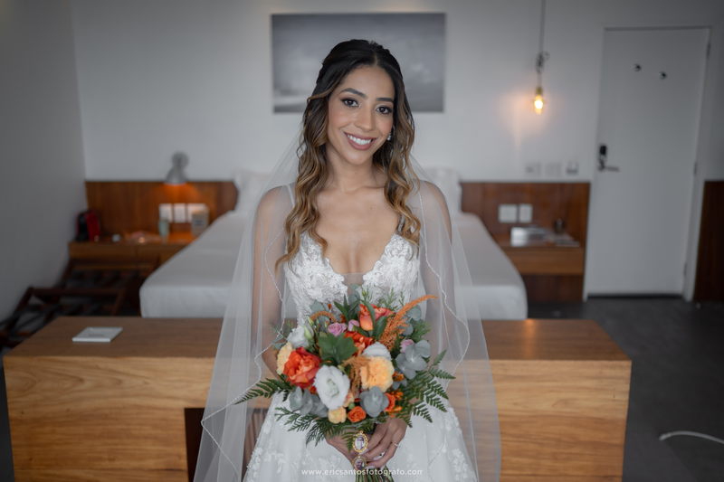 A noiva, Amanda, estava simplesmente radiante em seu vestido de noiva Internovias. O modelo estilo princesa, delicado e sofisticado, contava com um belíssimo trabalho em renda e um detalhe perfeito em transparência nas laterais, realçando a silhueta da noiva de forma elegante. O modelo foi a escolha ideal para a nossa noiva que queria se sentir uma verdadeira princesa em seu dia especial. Para completar o visual deslumbrante, Amanda contou com o talento da renomada @natimakeup, responsável pelo cabelo e maquiagem. O resultado foi um look natural e ao mesmo tempo glamouroso, que valorizou a beleza da noiva e a deixou ainda mais radiante.