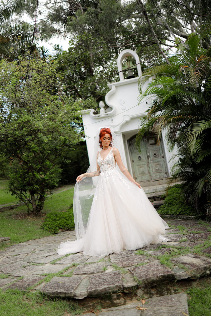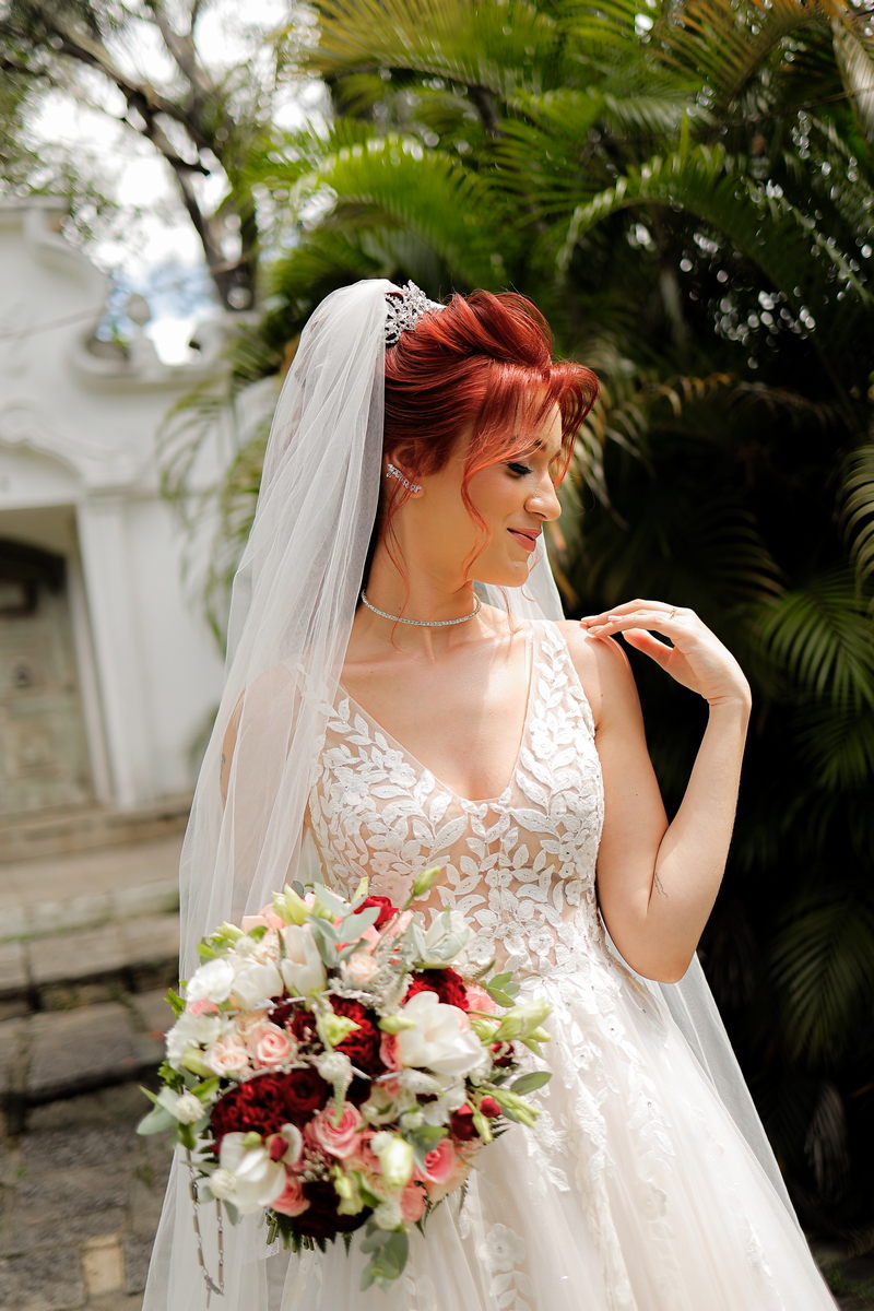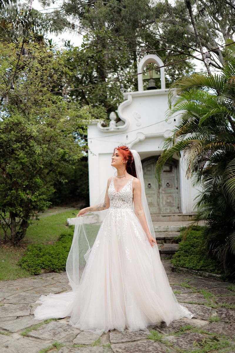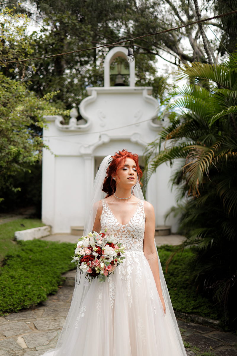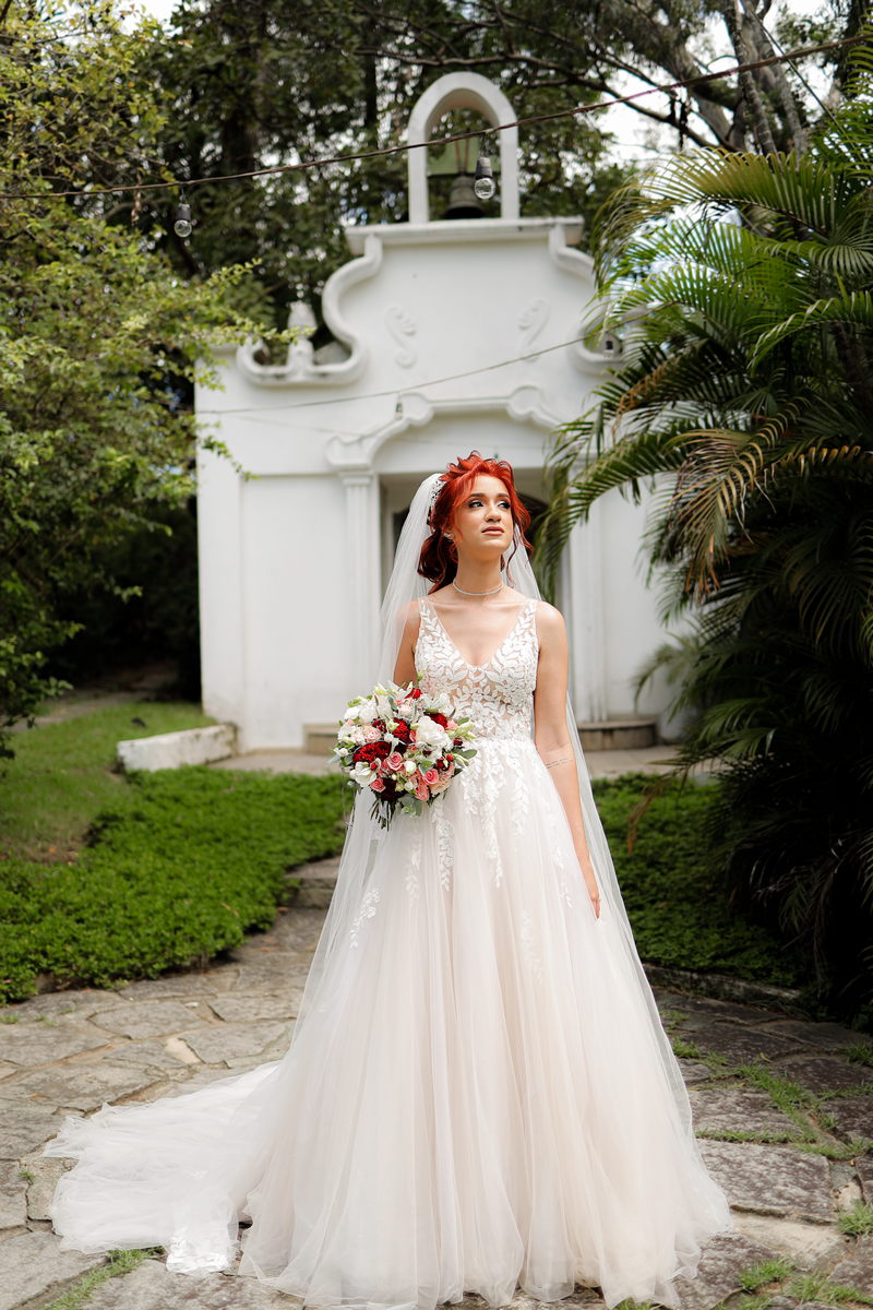 Quando falamos de casamento, o vestido da noiva é um dos grandes protagonistas. A Rayssa escolheu um modelo que combinou perfeitamente com o cenário romântico. Com uma renda belíssima, o vestido estilo princesa realçou a sua beleza natural, trazendo delicadeza e sofisticação na medida certa. Para completar o visual impecável da noiva, o @atelierbrunaguimaraes cuidou da maquiagem e do penteado, ressaltando sua beleza de forma sutil e elegante, resultando em uma noiva deslumbrante e radiante.