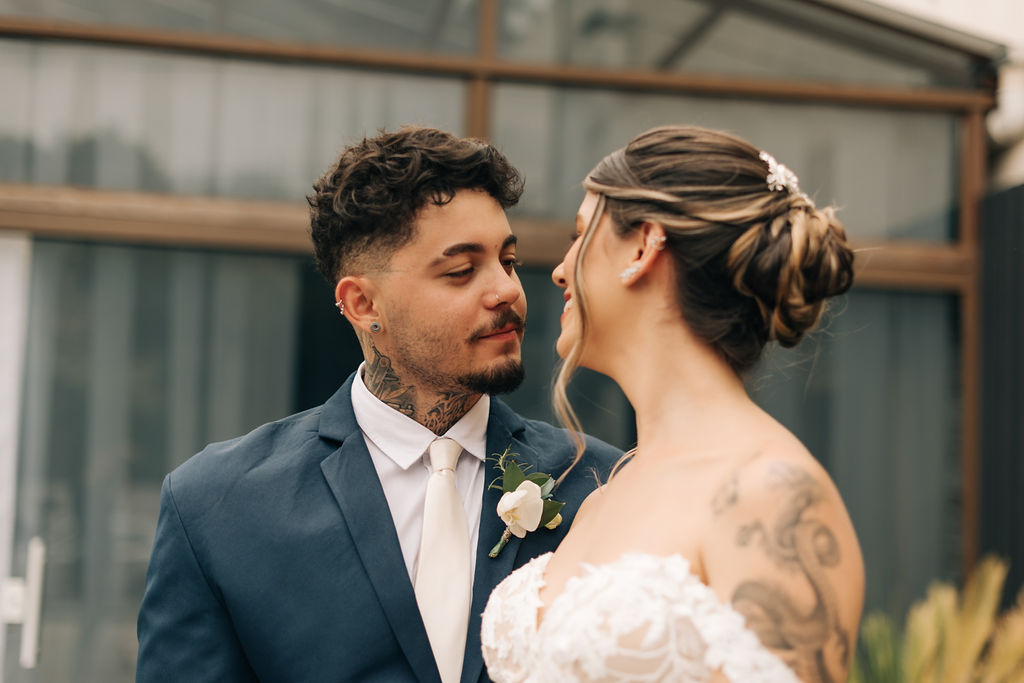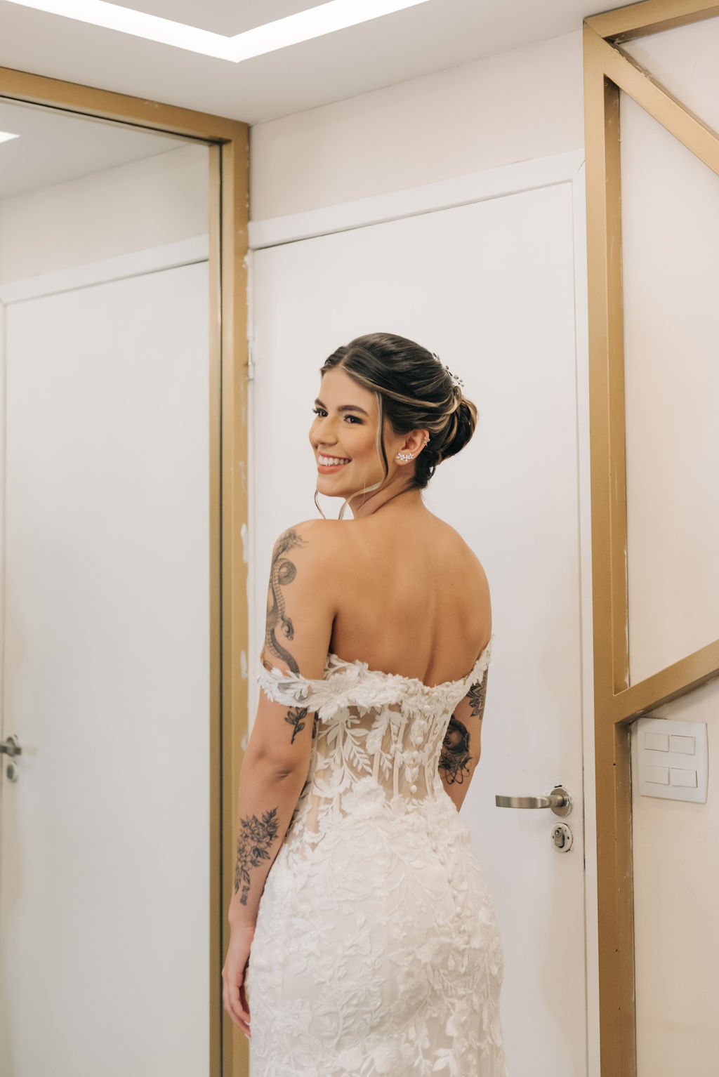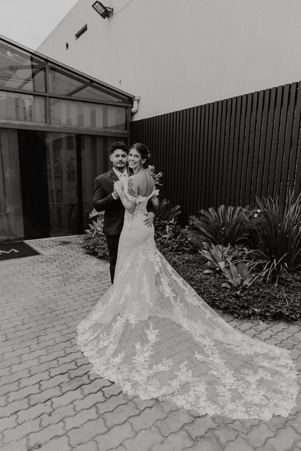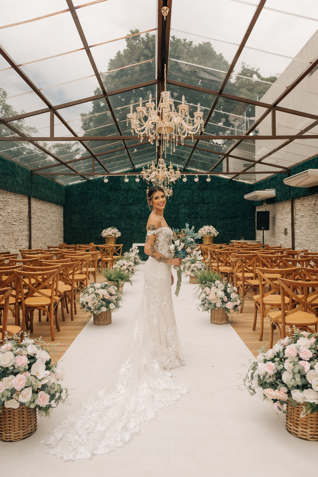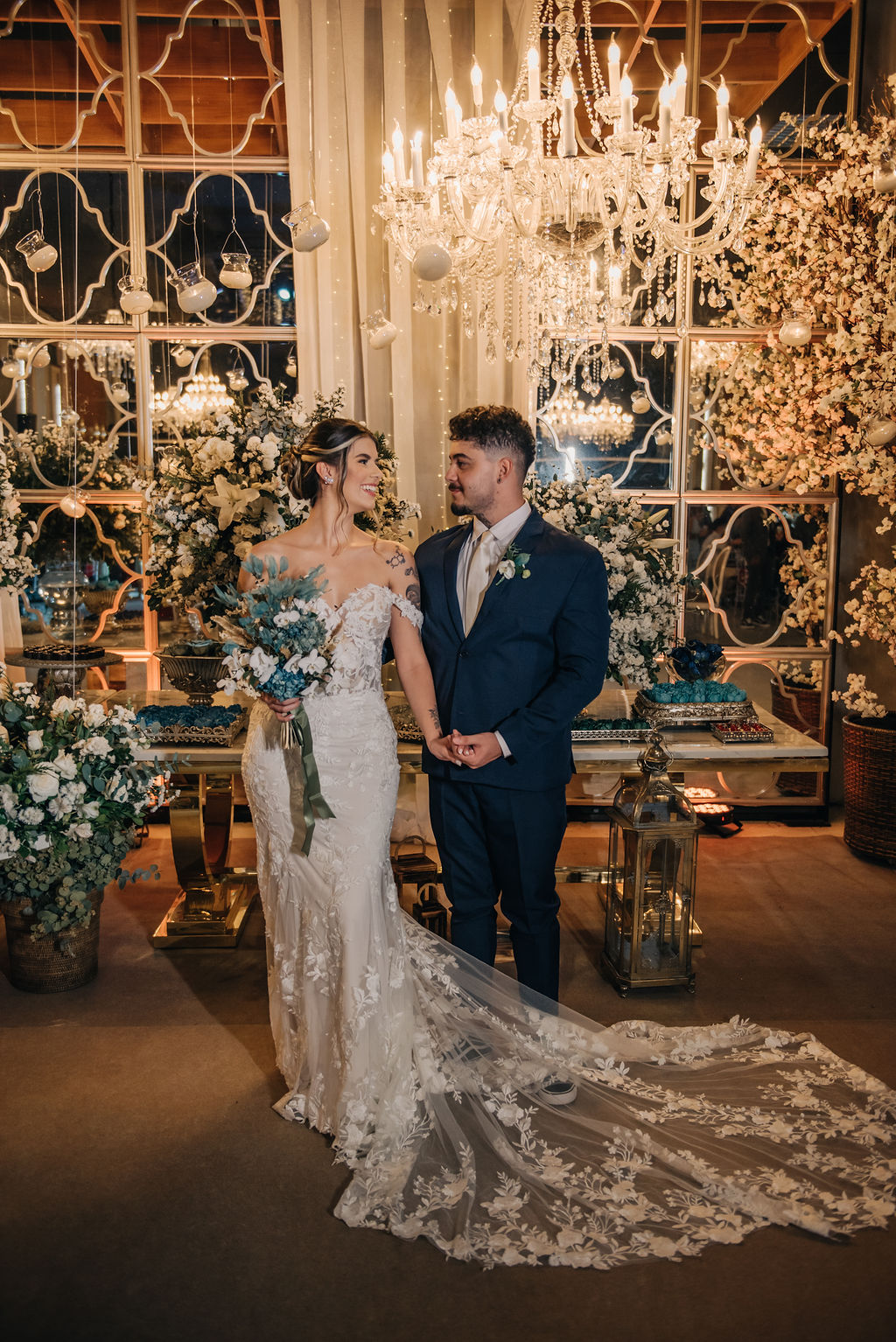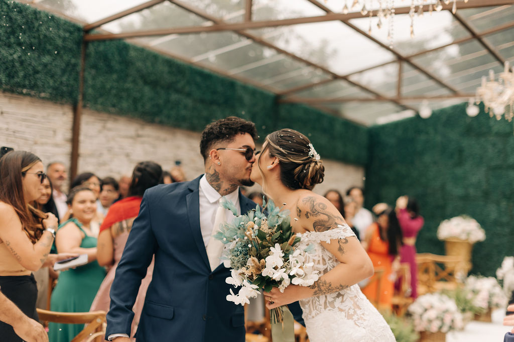 A Clara estava simplesmente perfeita em seu vestido de noiva Internovias. O modelo era uma obra de arte rendada, no estilo sereia, que destacou a sua beleza natural de maneira sublime. A cauda rendada, adicionou elegância, enquanto o decote frontal e as mangas delicadas equilibravam sensualidade com sofisticação. O véu, também da Internovias, complementou perfeitamente o visual, criando uma imagem digna de um conto de fadas moderno. A maquiagem da noiva, foi obra da talentosa Ana Carolina Brum, que realçou a sua beleza com maestria, garantindo que ela brilhasse ainda mais em seu grande dia.