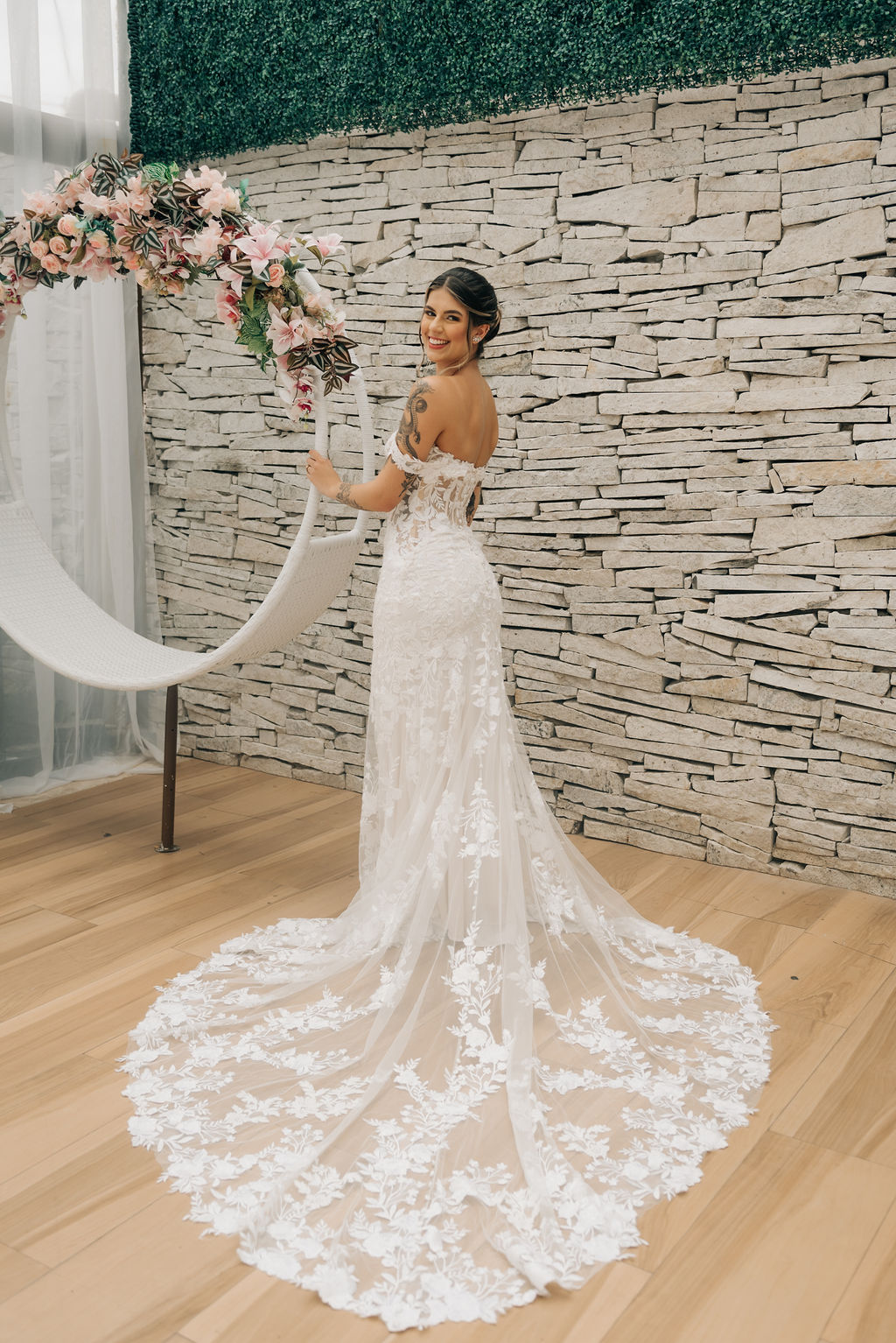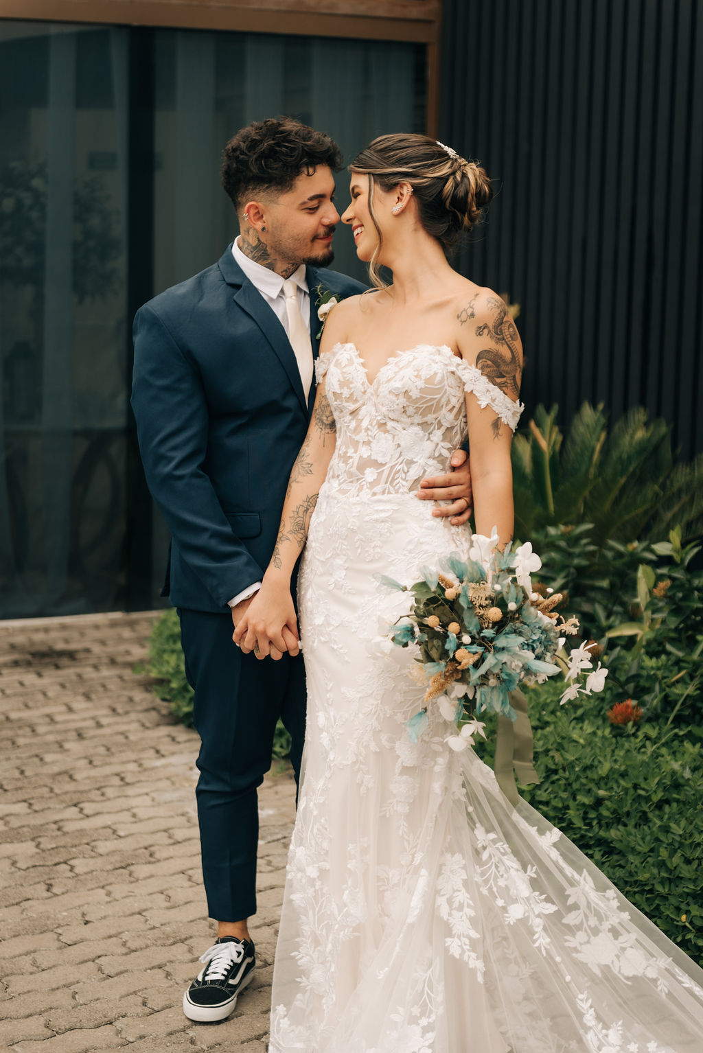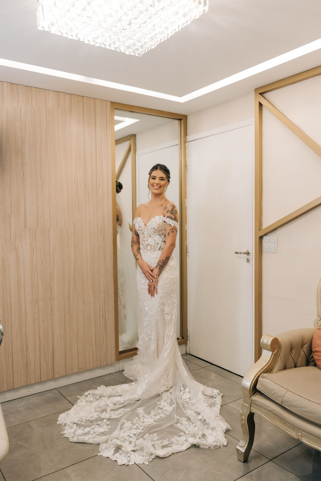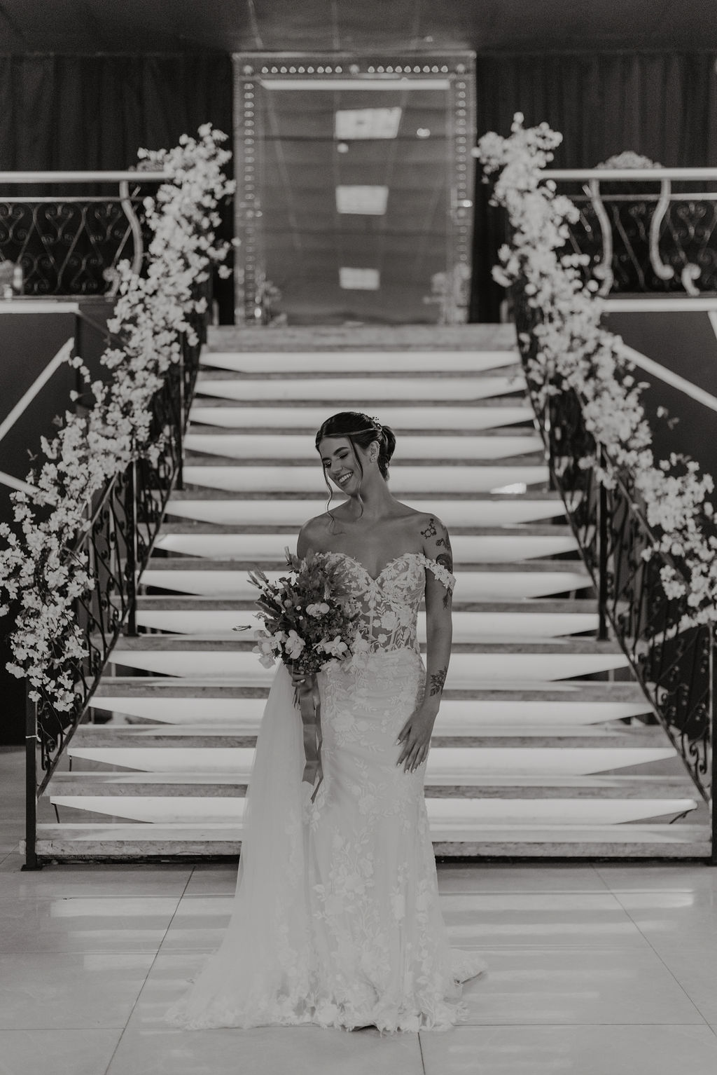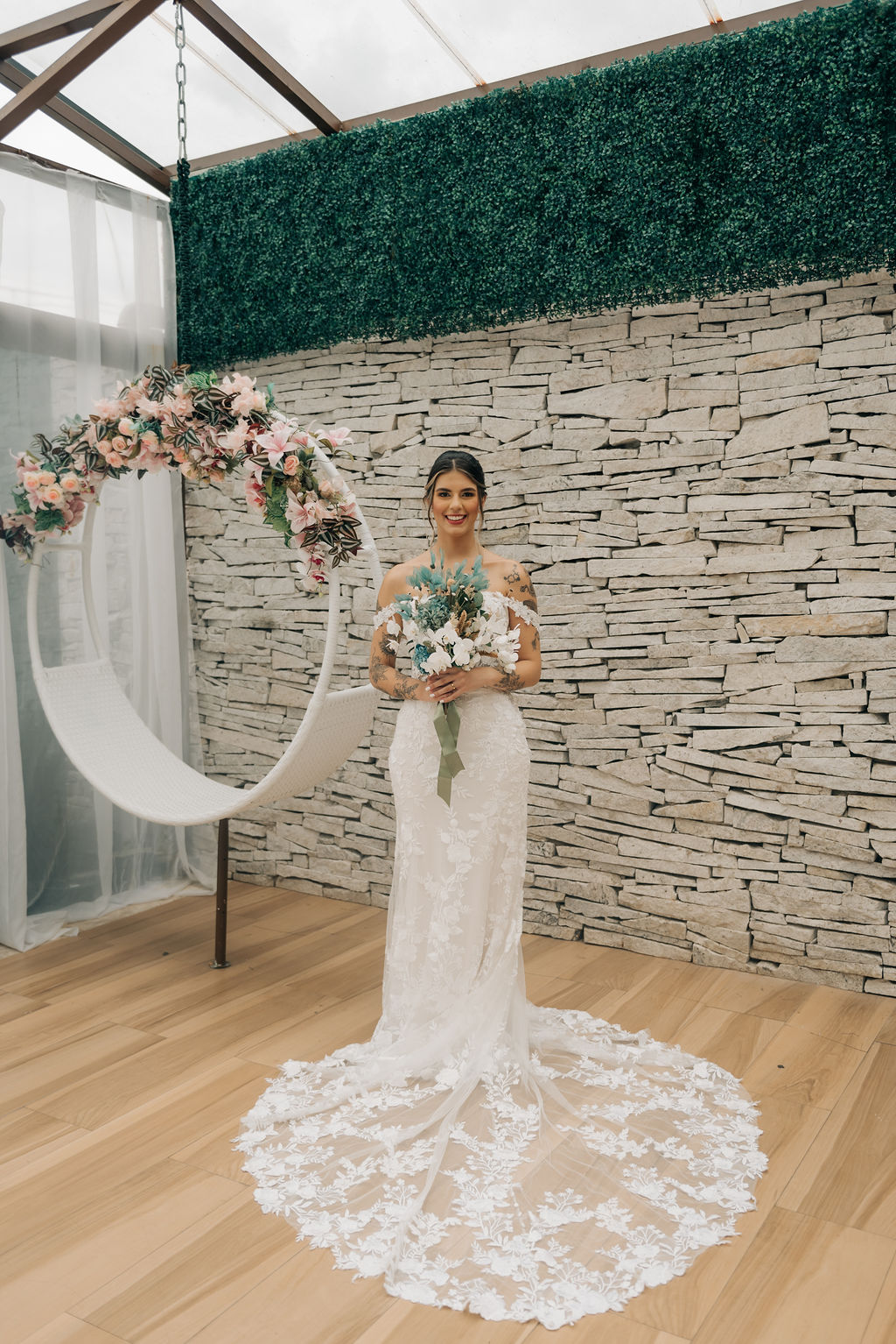 A Clara estava simplesmente perfeita em seu vestido de noiva Internovias. O modelo era uma obra de arte rendada, no estilo sereia, que destacou a sua beleza natural de maneira sublime. A cauda rendada, adicionou elegância, enquanto o decote frontal e as mangas delicadas equilibravam sensualidade com sofisticação. O véu, também da Internovias, complementou perfeitamente o visual, criando uma imagem digna de um conto de fadas moderno. A maquiagem da noiva, foi obra da talentosa Ana Carolina Brum, que realçou a sua beleza com maestria, garantindo que ela brilhasse ainda mais em seu grande dia.