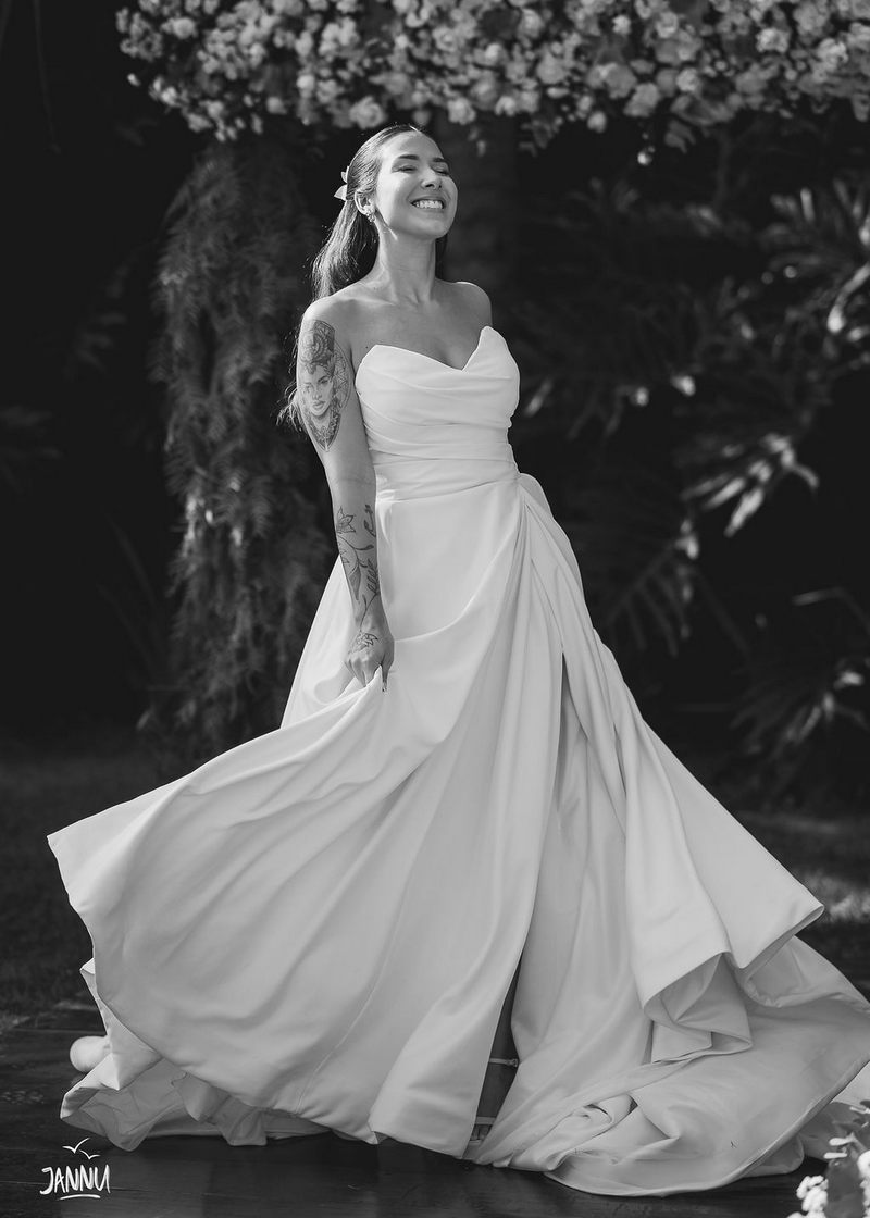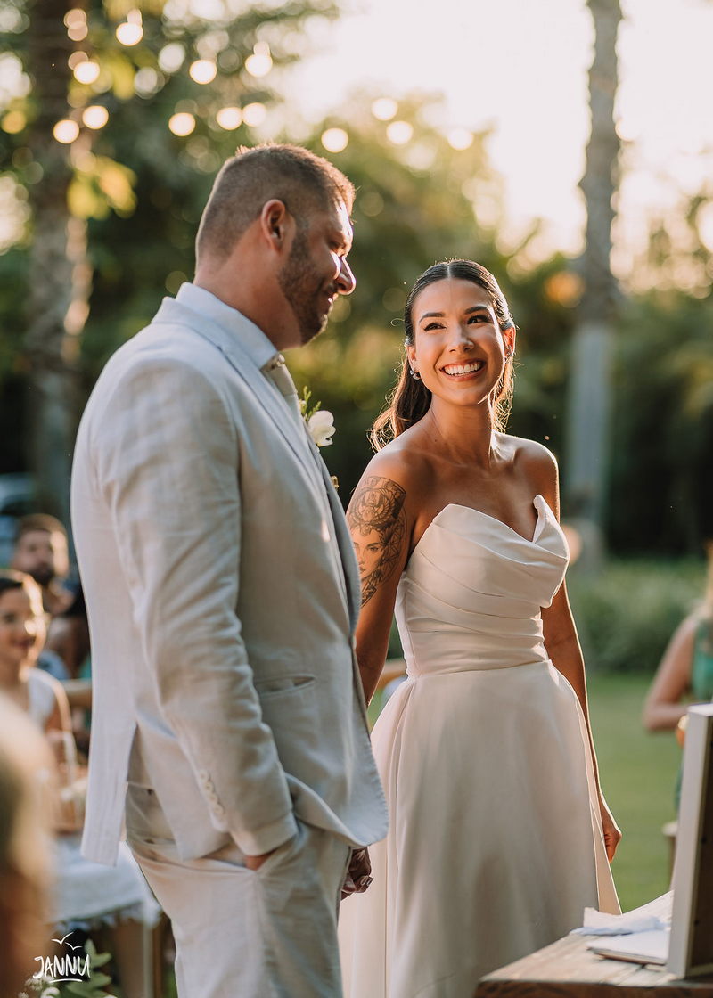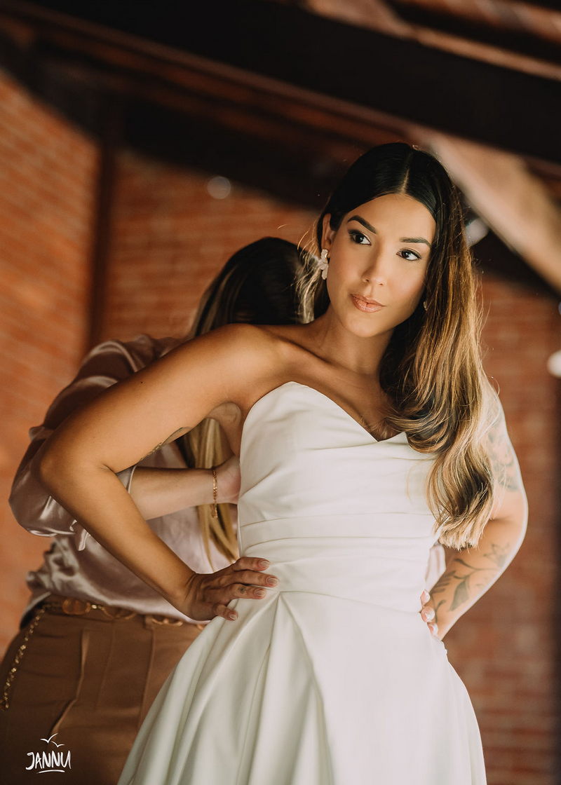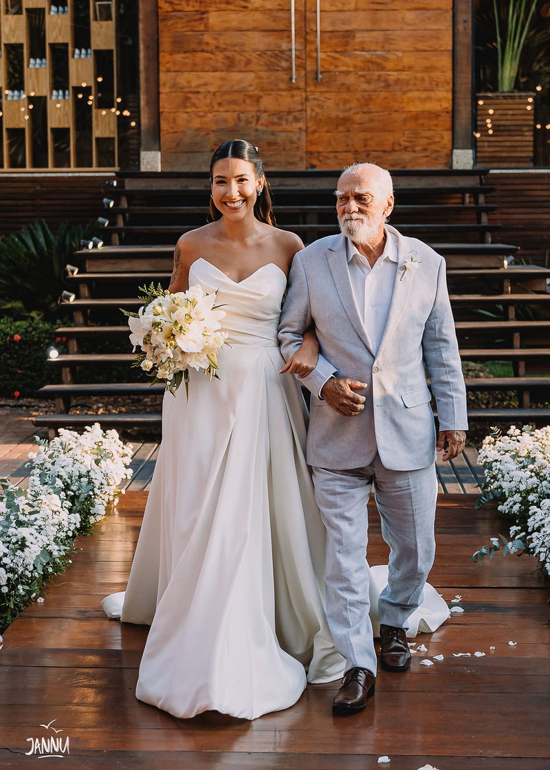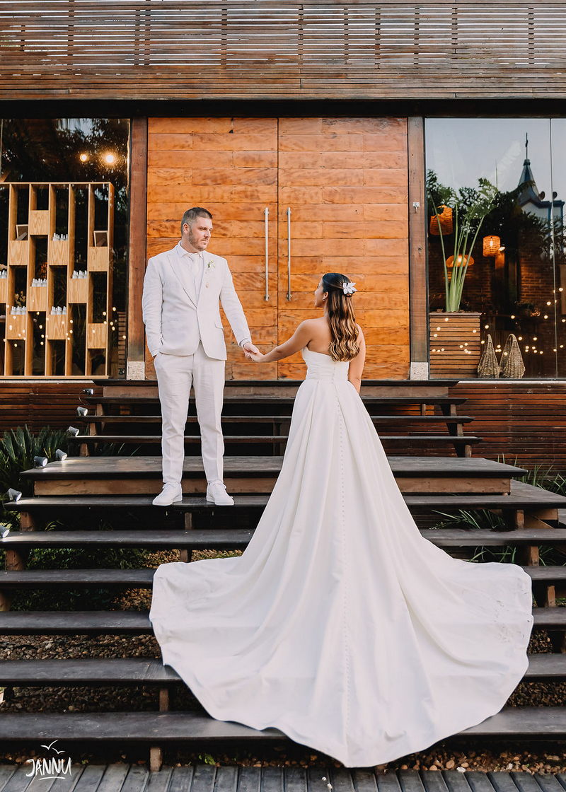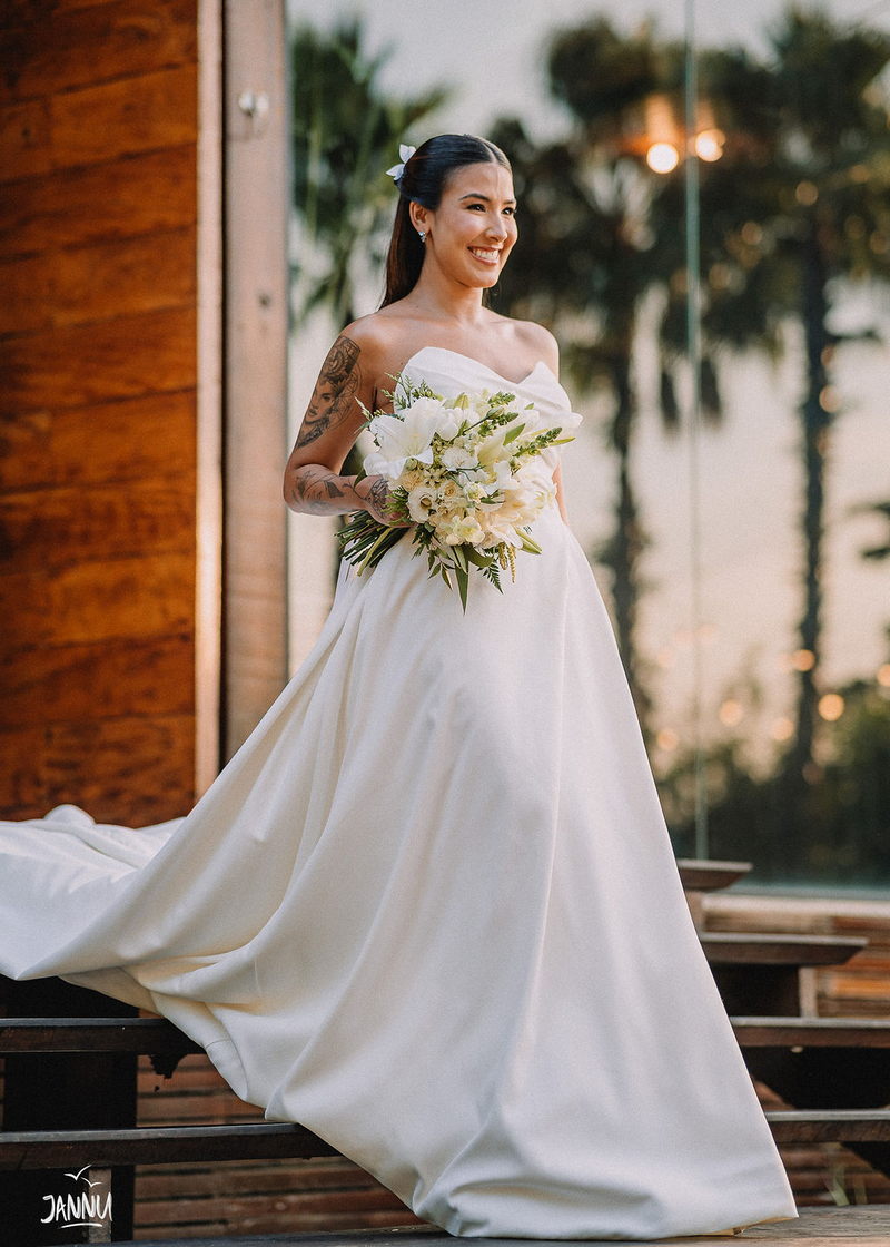 A Juliana escolheu para o seu grande dia um vestido de noiva minimalista da Internovias, que capturou a essência da sua personalidade e estilo. O modelo, com seu corte tomara que caia e estilo princesa, trouxe um charme clássico, enquanto a cauda longa trouxe um ar de realeza. A maquiagem feita pela @tfbeauty_, destacou a sua beleza natural com perfeição. O estilo combinou perfeitamente com o vestido, criando um visual que impressionou a todos os convidados.