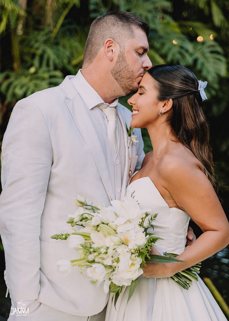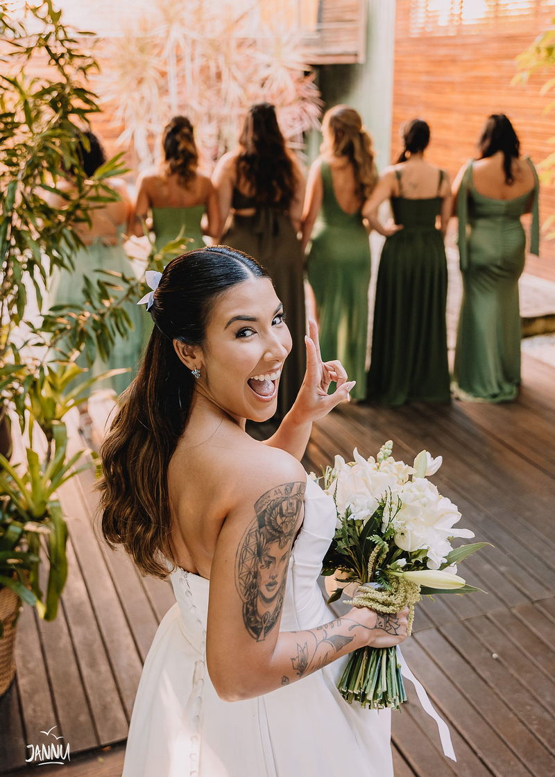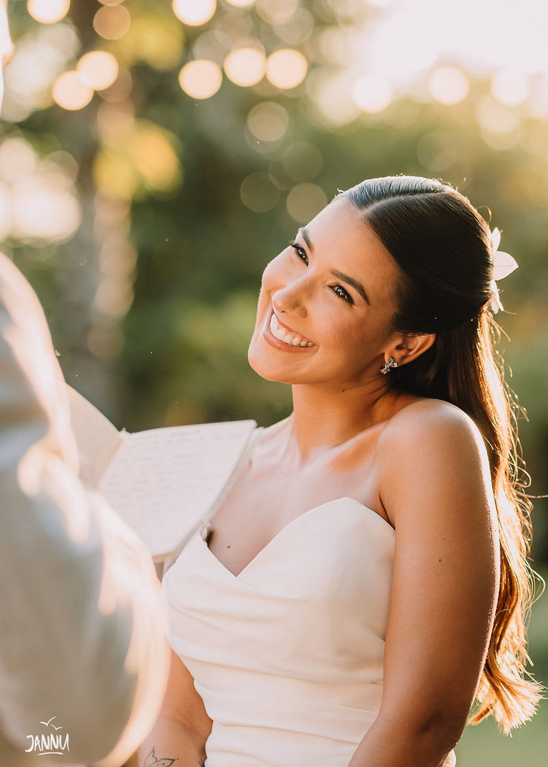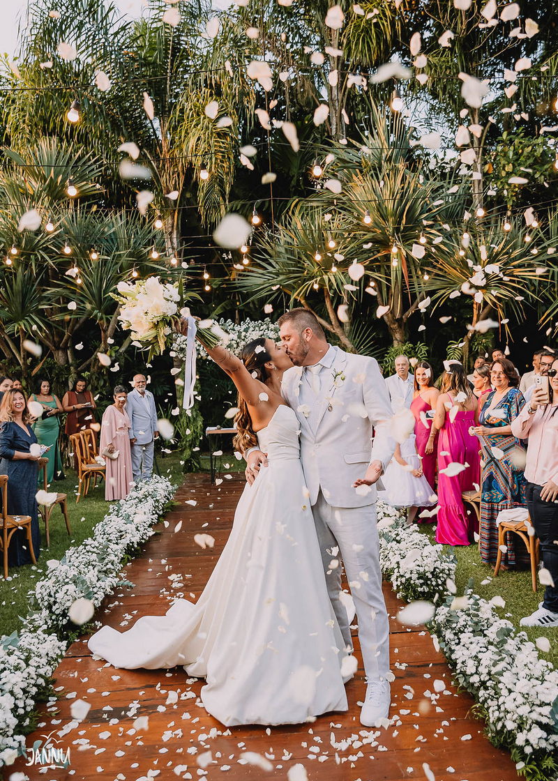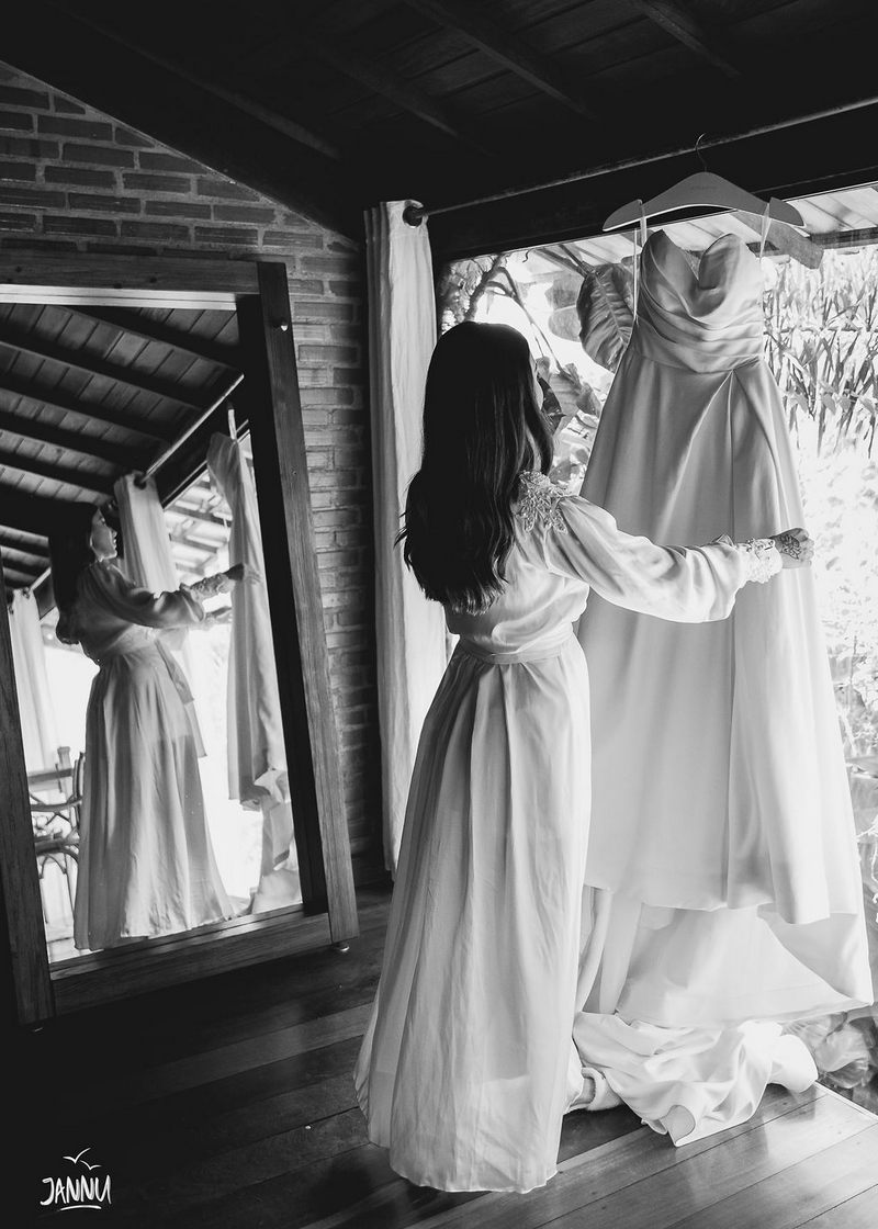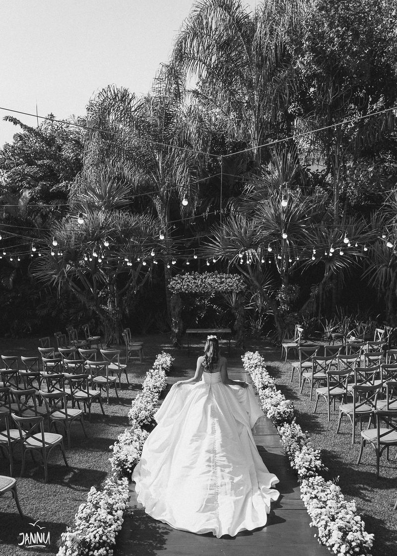 A Juliana escolheu para o seu grande dia um vestido de noiva minimalista da Internovias, que capturou a essência da sua personalidade e estilo. O modelo, com seu corte tomara que caia e estilo princesa, trouxe um charme clássico, enquanto a cauda longa trouxe um ar de realeza. A maquiagem feita pela @tfbeauty_, destacou a sua beleza natural com perfeição. O estilo combinou perfeitamente com o vestido, criando um visual que impressionou a todos os convidados.