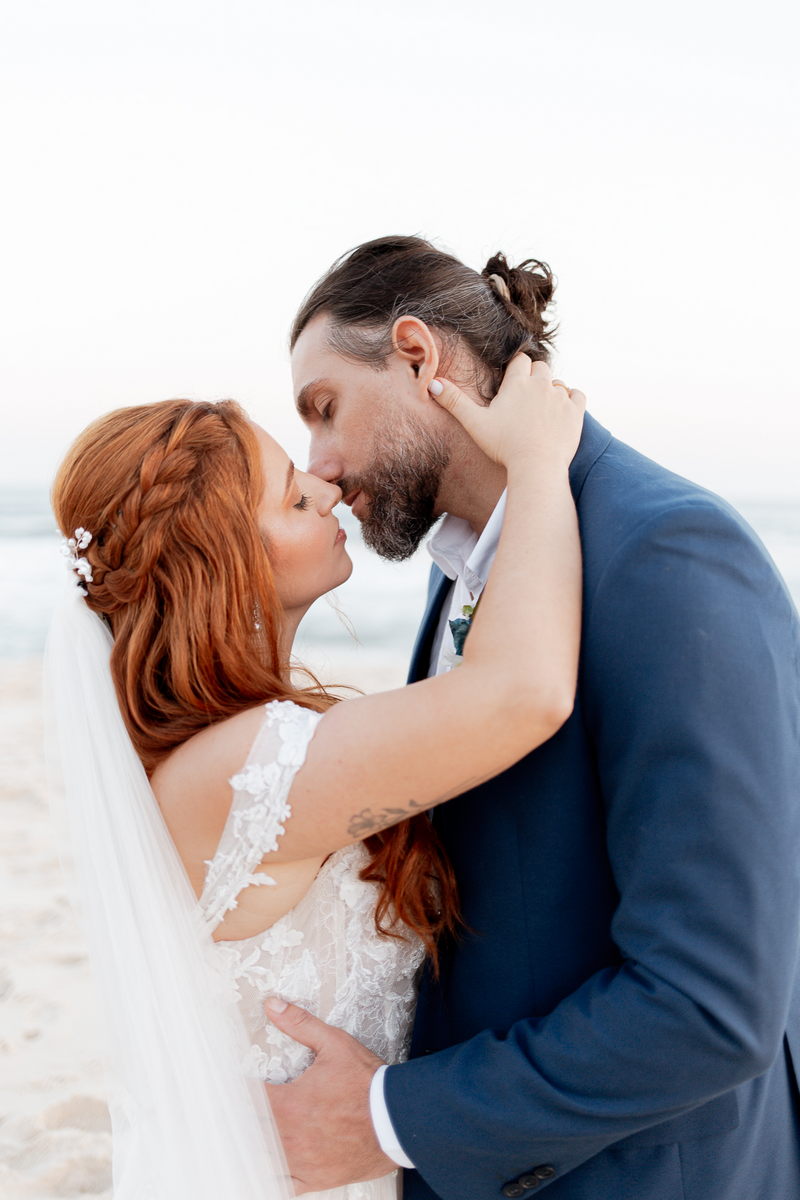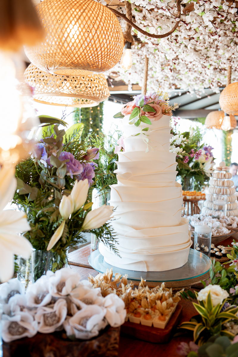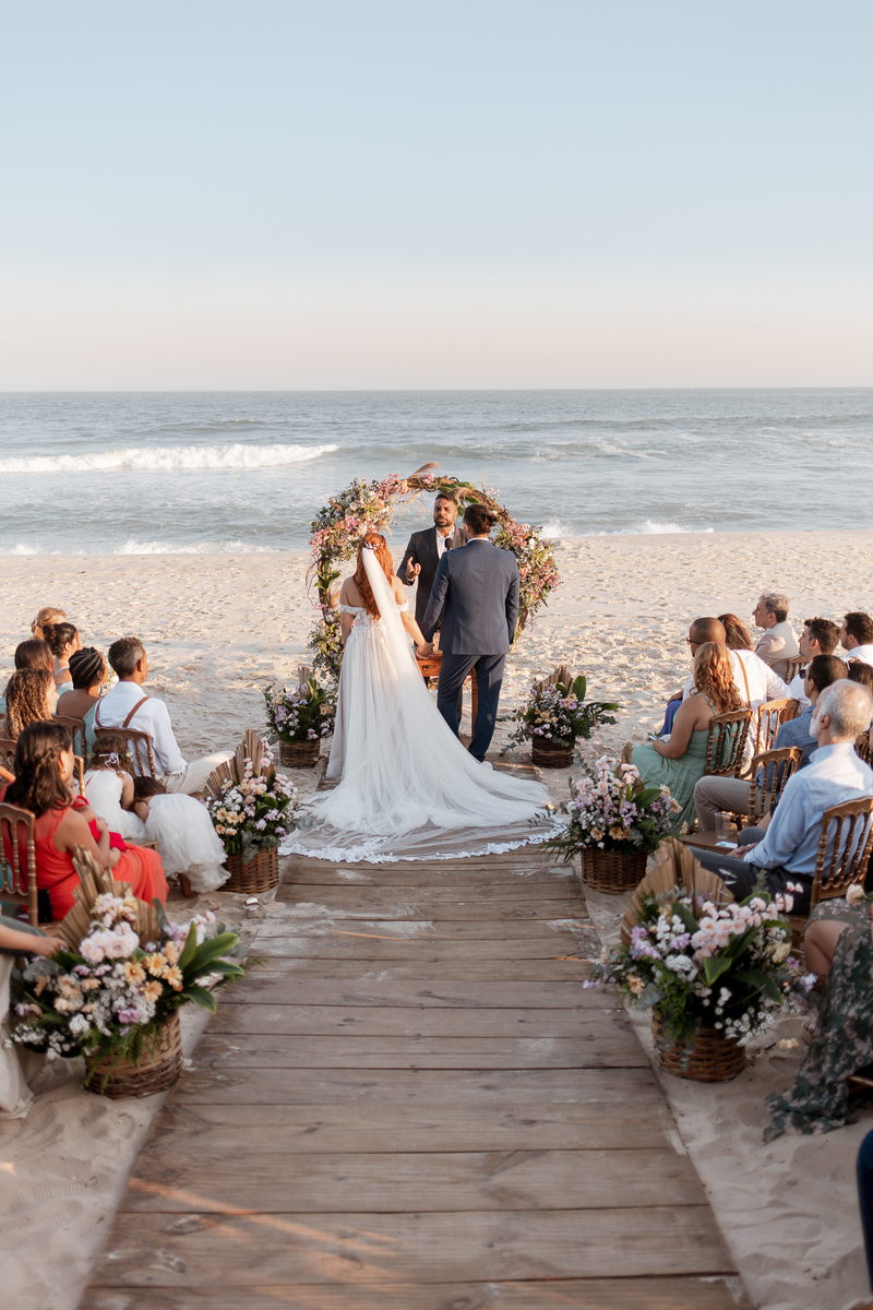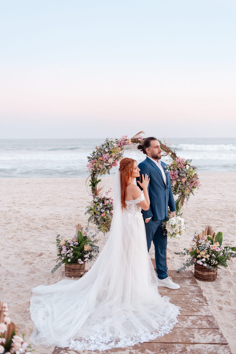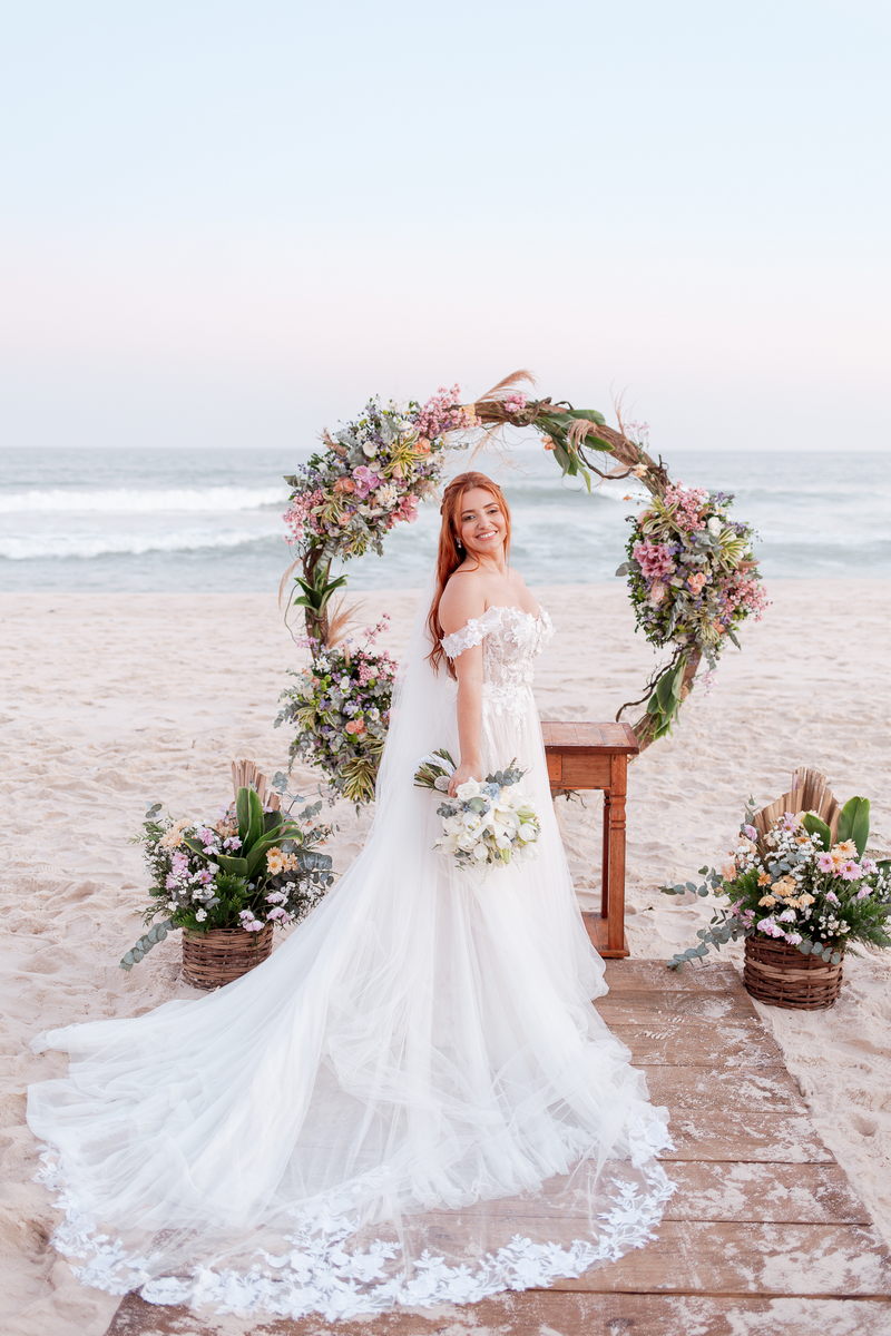 A Priscila optou por um vestido de noiva super romântico Internovias. O modelo era simplesmente perfeito, com uma fenda frontal que adicionou um toque de sensualidade e um trabalho em renda delicado no busto que criou um visual de conto de fadas. A saia leve proporcionava um movimento gracioso, ideal para a cerimônia na praia. A escolha do vestido combinou romantismo e requinte de uma forma harmoniosa.
