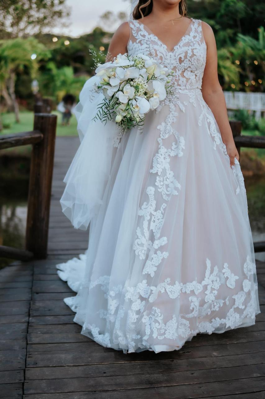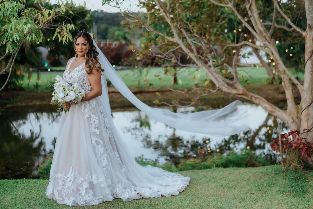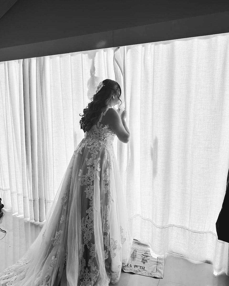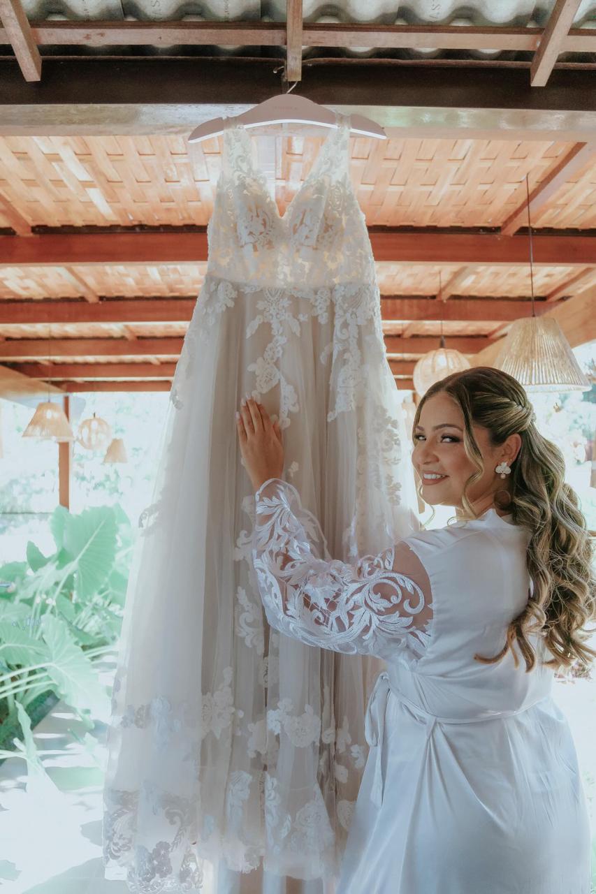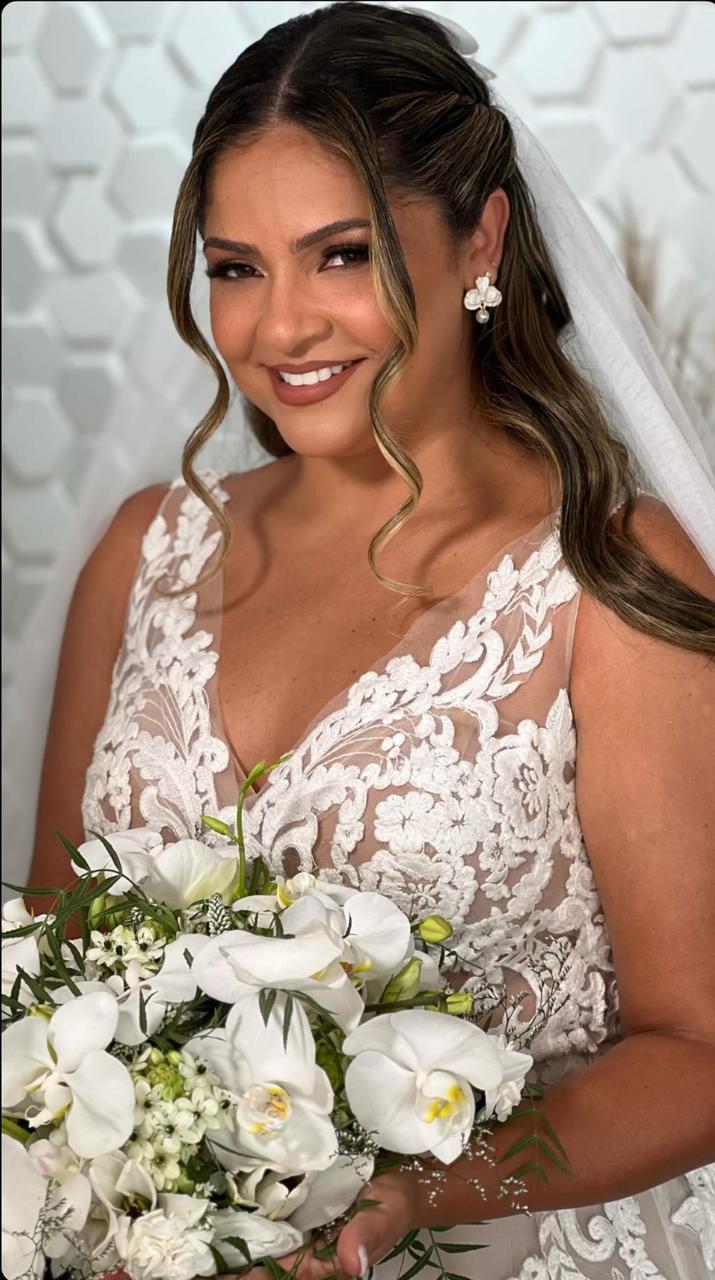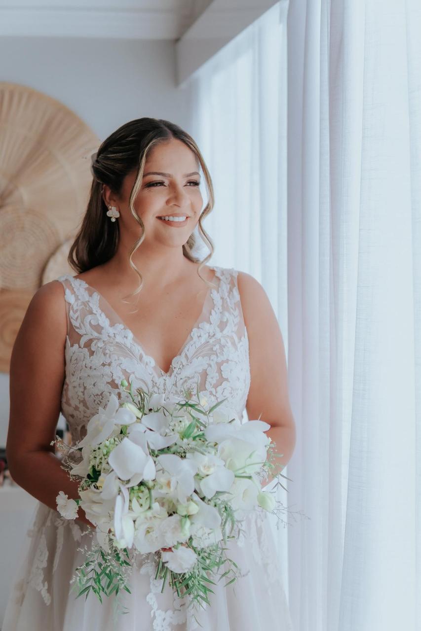 A Rebeca optou por um vestido de noiva Internovias estilo princesa super delicado. O decote em V profundo, com belíssimos detalhes em transparência e renda tornaram o visual ainda mais encantador. A saia bem leve, se destacou com seus movimentos graciosos a cada passo da noiva. Todos os detalhes deste vestido foi pensado para exaltar a beleza da noiva, permitindo que ela aproveitasse cada momento do seu dia especial. A maquiagem e o penteado, feitos pela talentosa @chesaraujomakeup, realçaram ainda mais a sua beleza natural, criando um look harmonioso e encantador.
