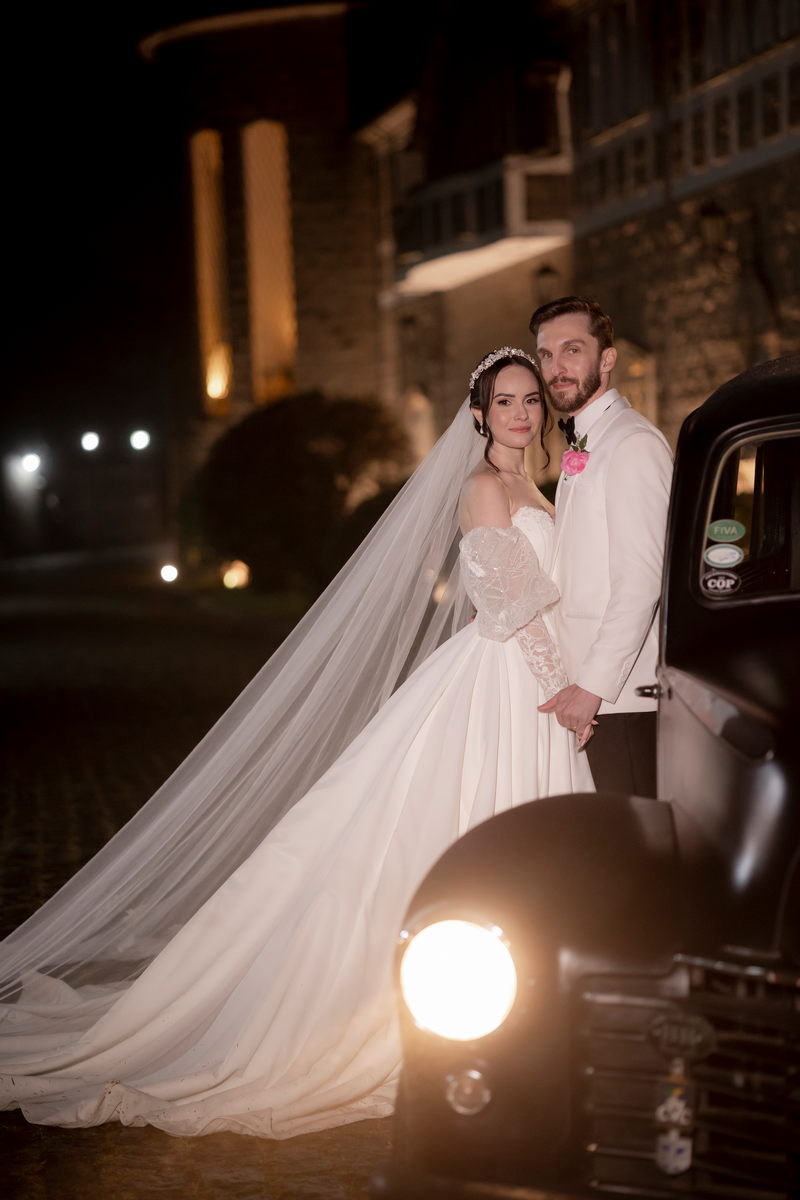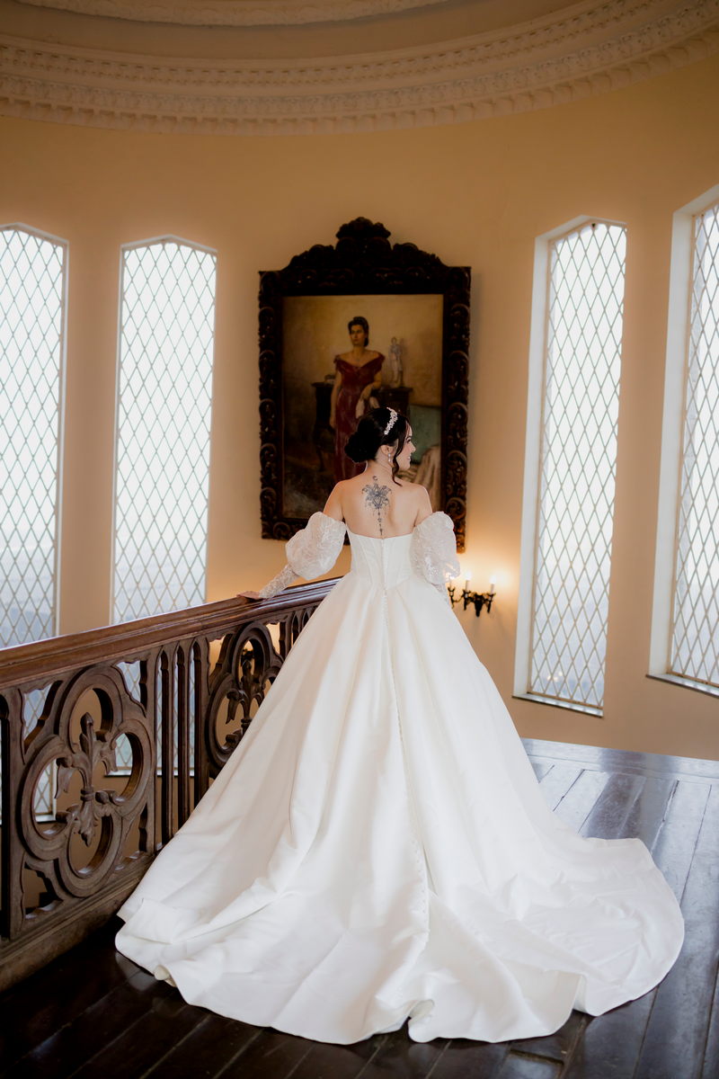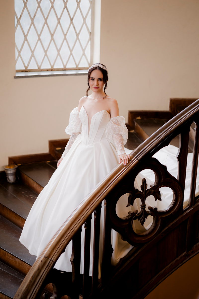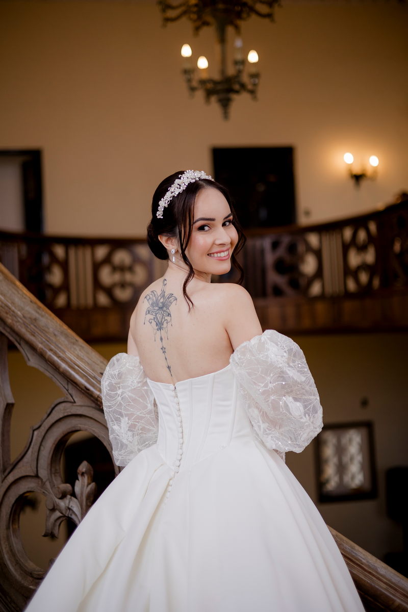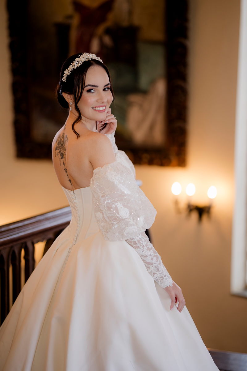 A Débora optou por um vestido de noiva Internovias com corte princesa, que se destacou pelo seu corpete estruturado e lindo decote, valorizando a silhueta da noiva. As mangas bufantes, feitas de renda delicada e leve brilho, adicionaram romantismo ao look. A saia volumosa, confeccionada em tecido de alta qualidade, criou um movimento gracioso a cada passo e com a sua cauda longa completou o visual, trazendo um ar de realeza que combinou perfeitamente com o cenário do castelo.