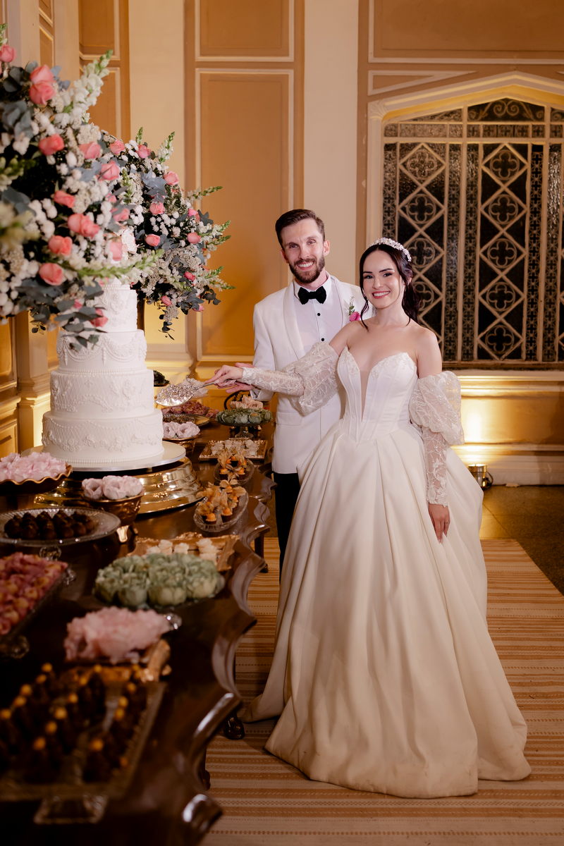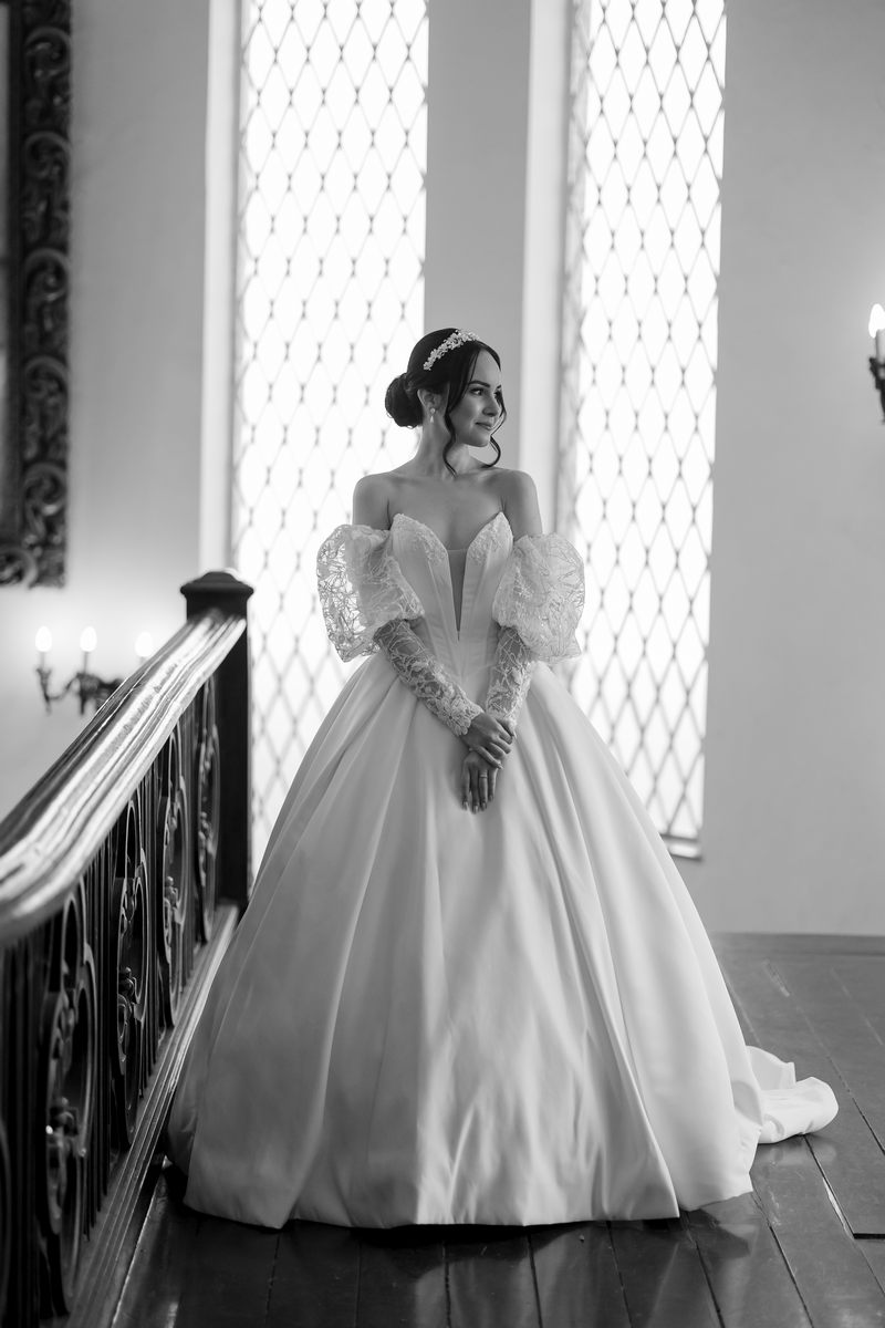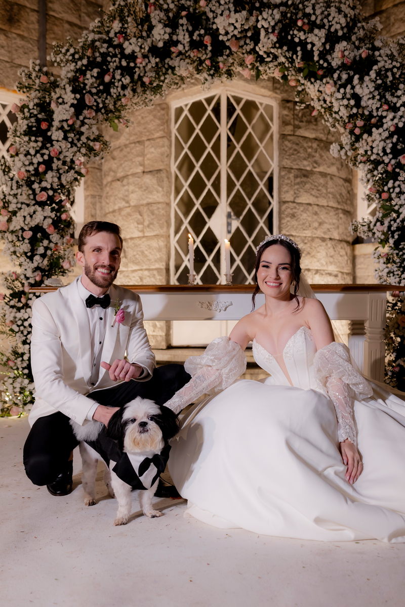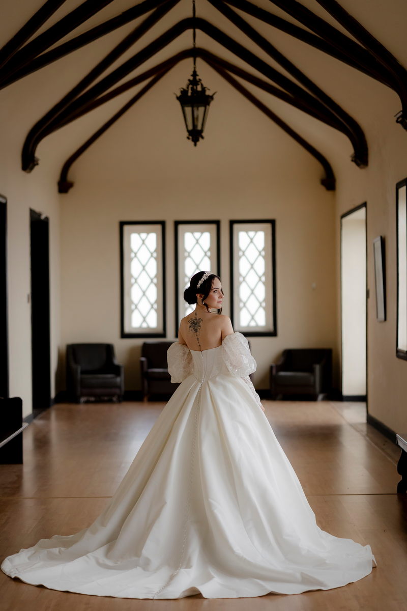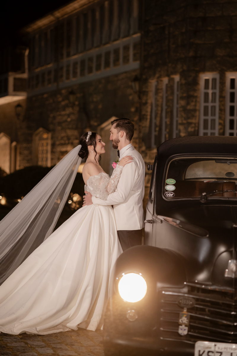 A Débora optou por um vestido de noiva Internovias com corte princesa, que se destacou pelo seu corpete estruturado e lindo decote, valorizando a silhueta da noiva. As mangas bufantes, feitas de renda delicada e leve brilho, adicionaram romantismo ao look. A saia volumosa, confeccionada em tecido de alta qualidade, criou um movimento gracioso a cada passo e com a sua cauda longa completou o visual, trazendo um ar de realeza que combinou perfeitamente com o cenário do castelo.