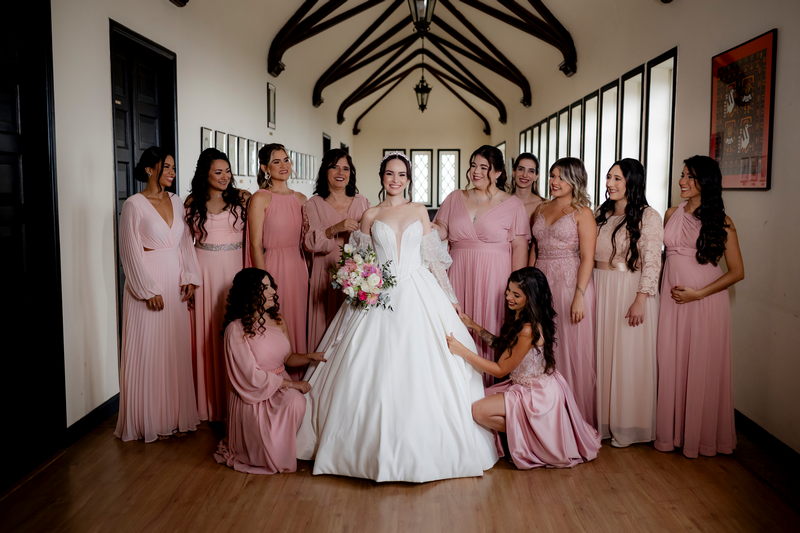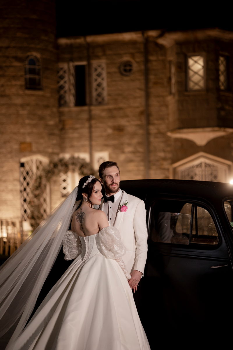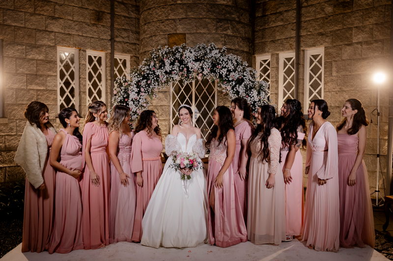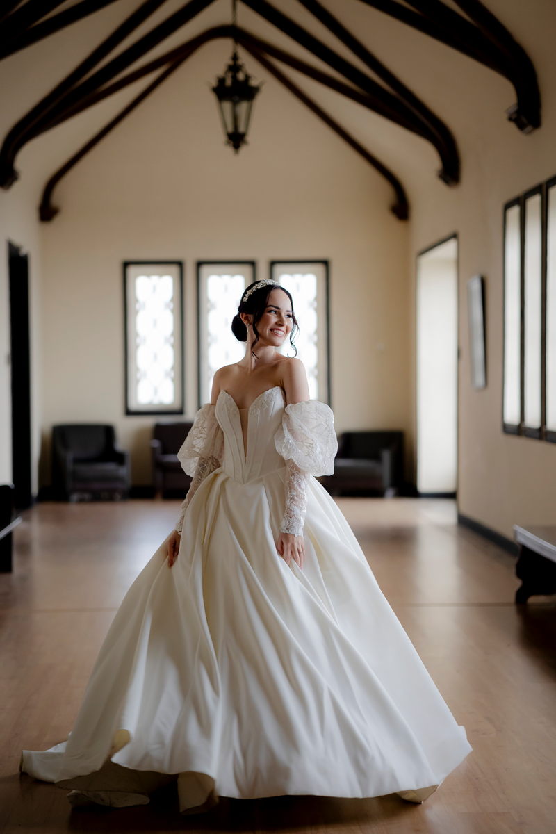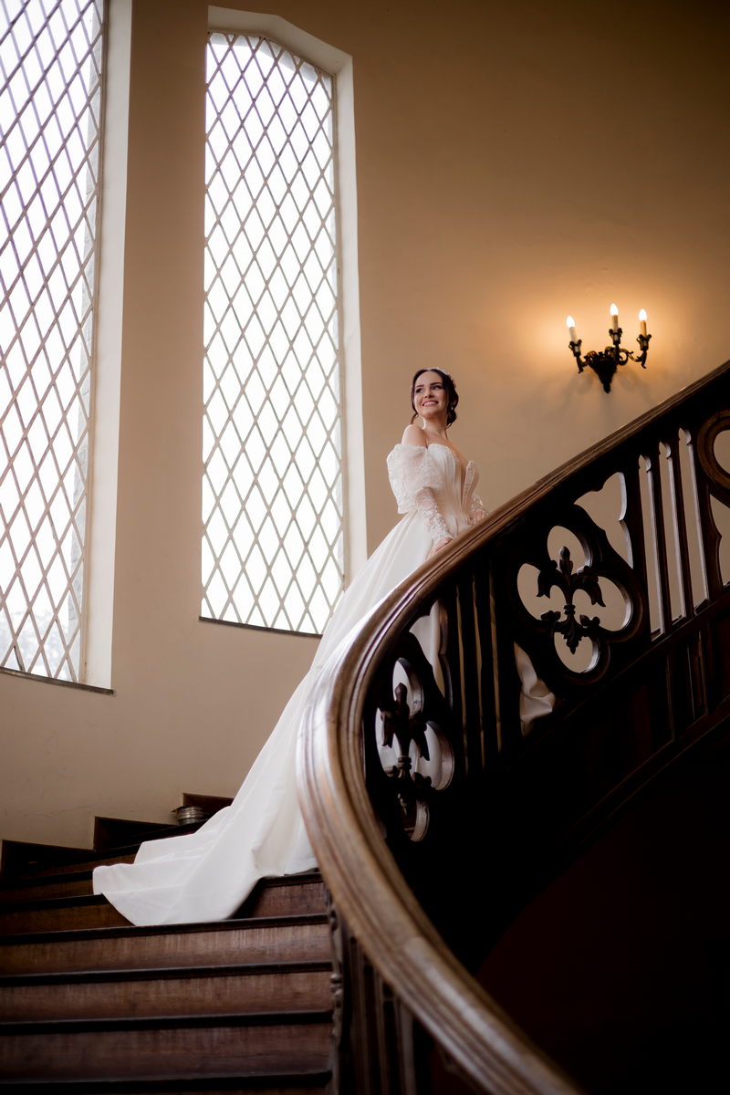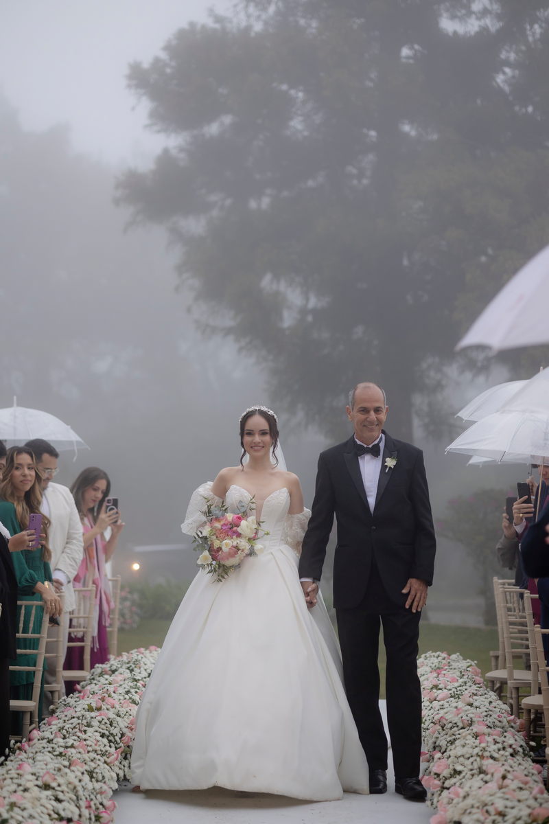 A Débora optou por um vestido de noiva Internovias com corte princesa, que se destacou pelo seu corpete estruturado e lindo decote, valorizando a silhueta da noiva. As mangas bufantes, feitas de renda delicada e leve brilho, adicionaram romantismo ao look. A saia volumosa, confeccionada em tecido de alta qualidade, criou um movimento gracioso a cada passo e com a sua cauda longa completou o visual, trazendo um ar de realeza que combinou perfeitamente com o cenário do castelo.