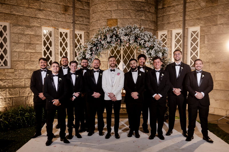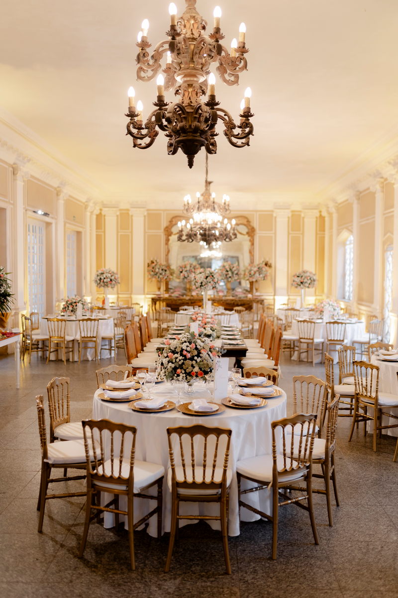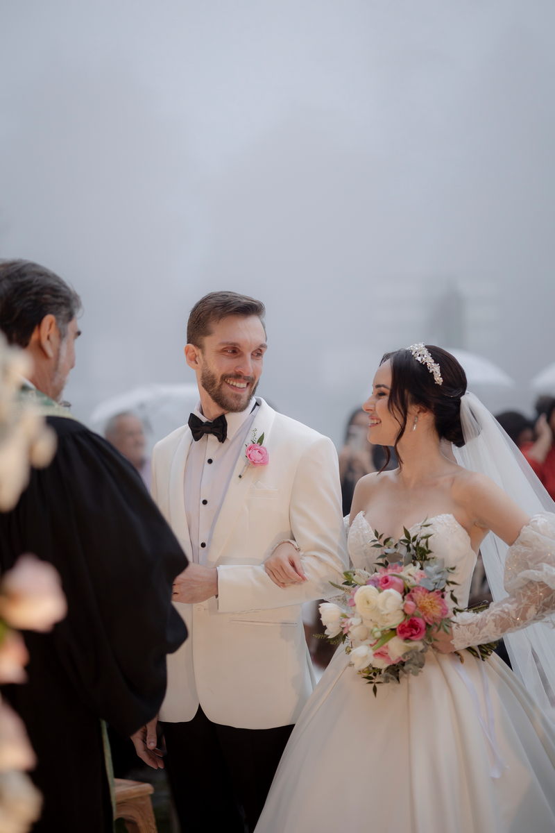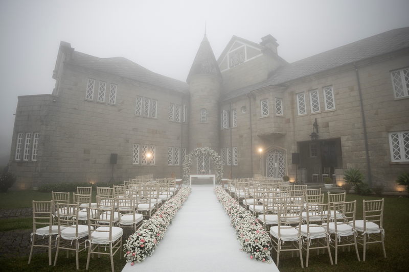 A decoração do casamento foi um espetáculo à parte. O ambiente estava envolto em uma névoa suave, que adicionou um toque de mistério e encanto ao local. O caminho até o altar, adornado com flores brancas e um toque rosa, conduziu os convidados a uma cerimônia inesquecível.