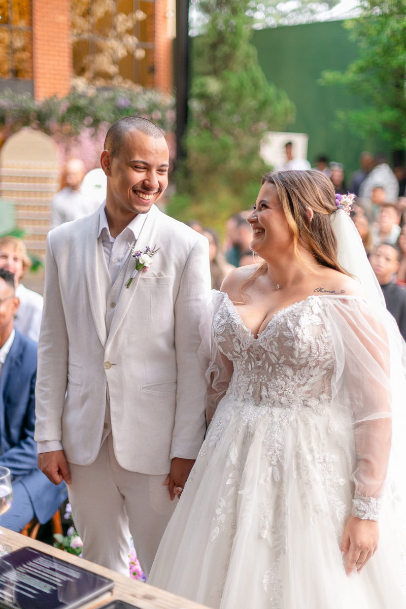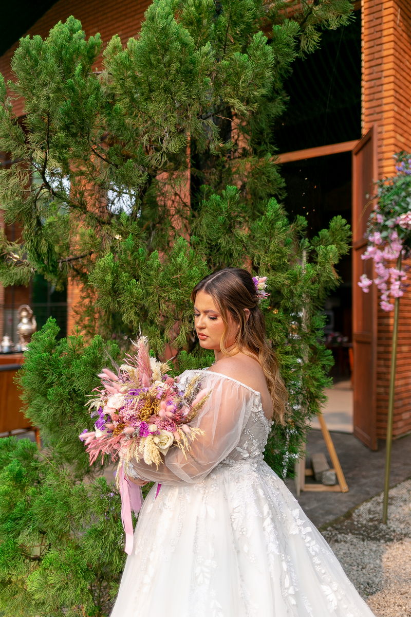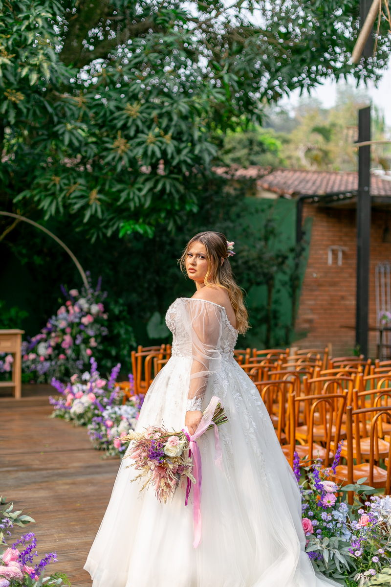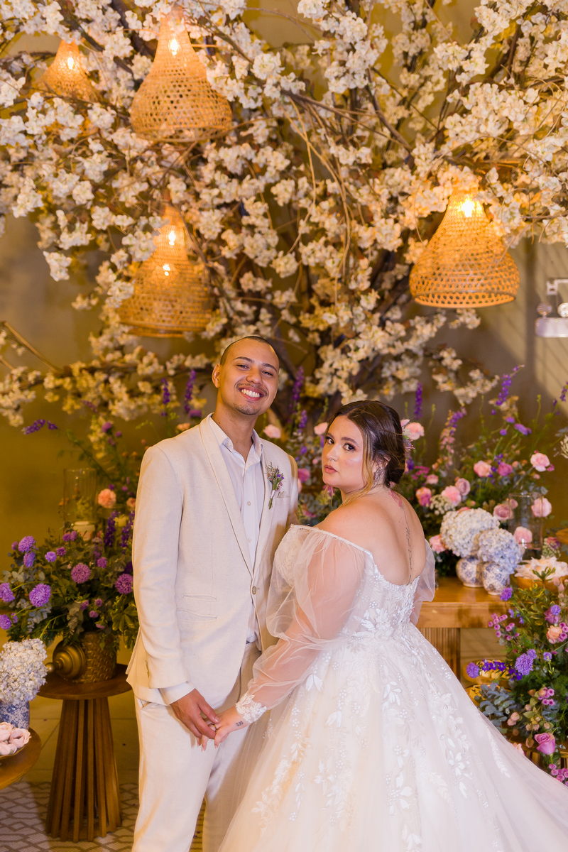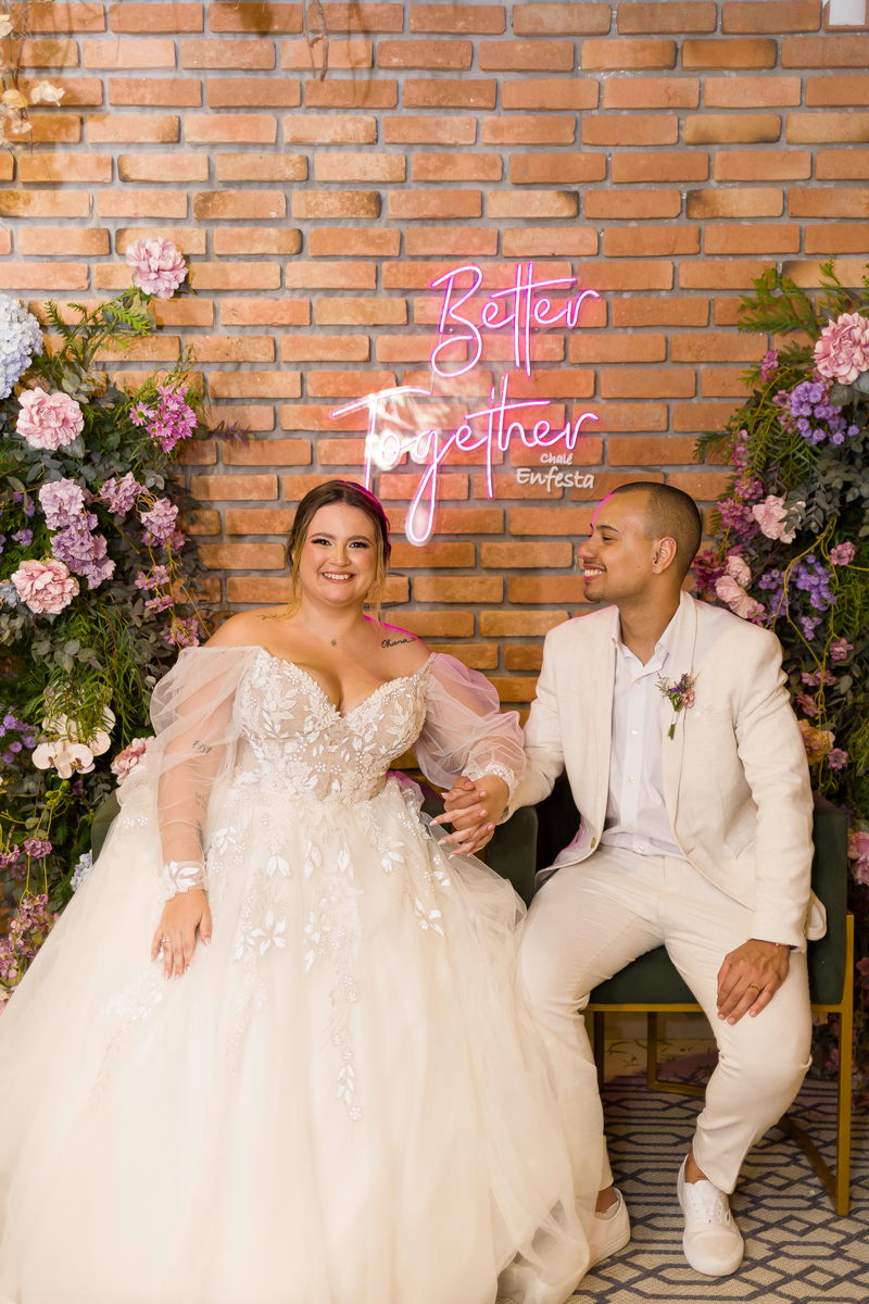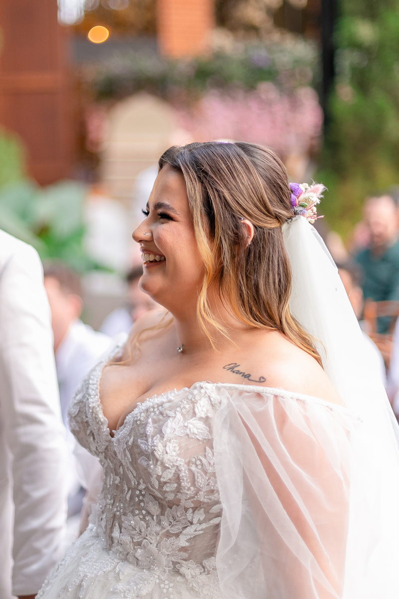 A noiva, Day, estava simplesmente deslumbrante em seu vestido de noiva Internovias. O busto era adornado com renda delicada e um decote maravilhoso. As mangas de tule transparente adicionaram mais encanto e a saia delicada criou um efeito de princesa moderno, fazendo a noiva parecer ter saído diretamente de um conto de fadas. O talento da @milenaraujomakeup na maquiagem e penteado realçou ainda mais a beleza natural da Day. O look era a personificação perfeita do equilíbrio entre elegância clássica e estilo contemporâneo, refletindo a sua personalidade radiante e complementando magnificamente o cenário encantado do casamento.