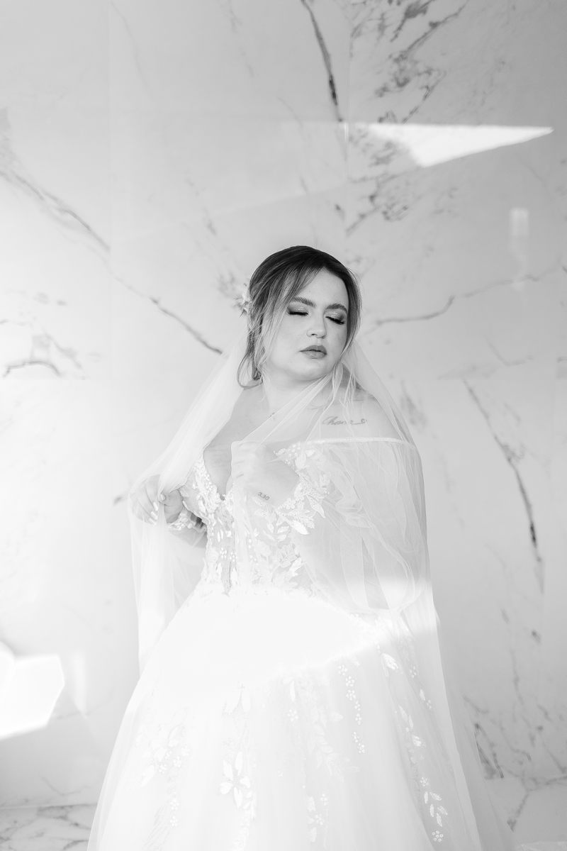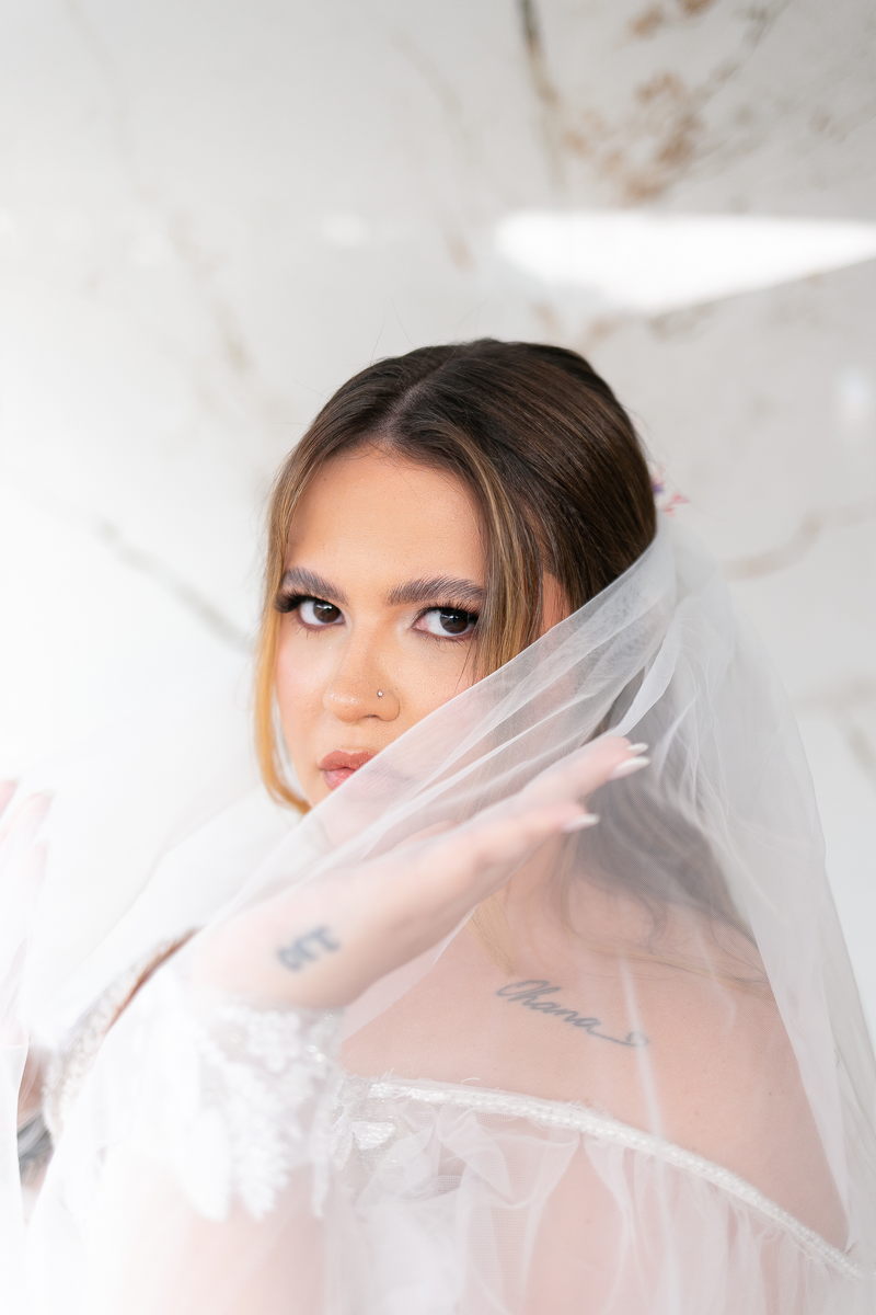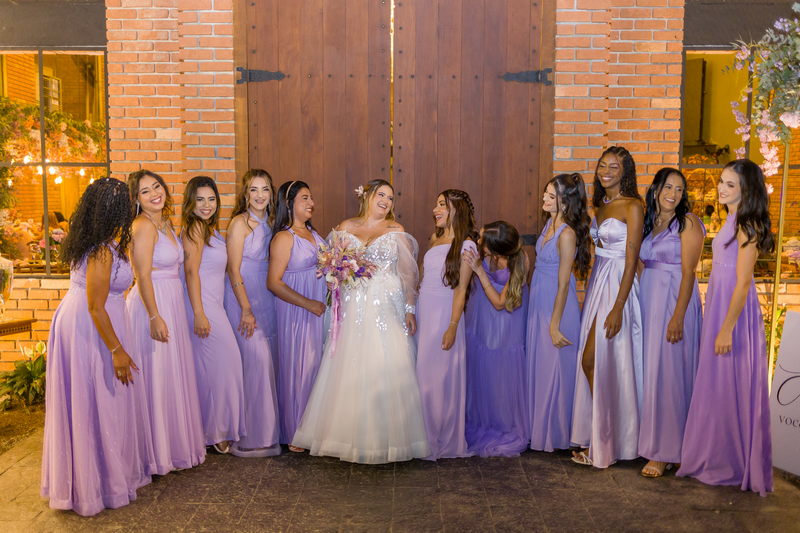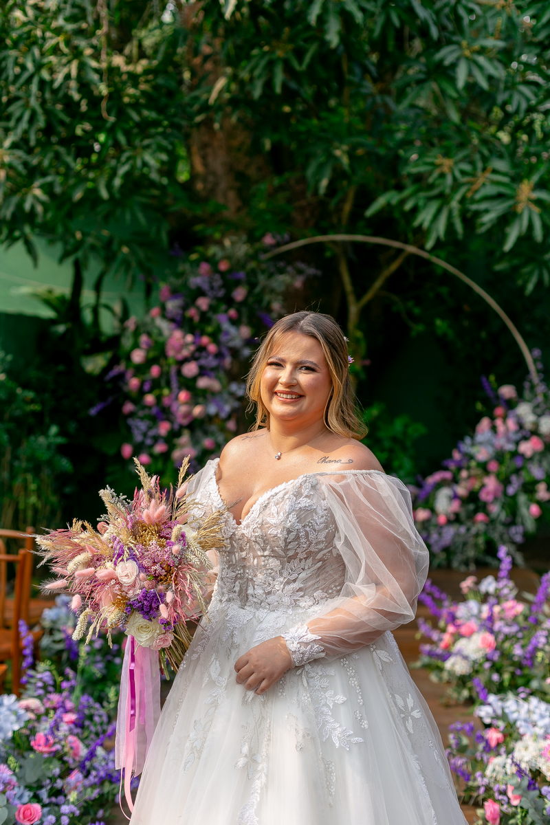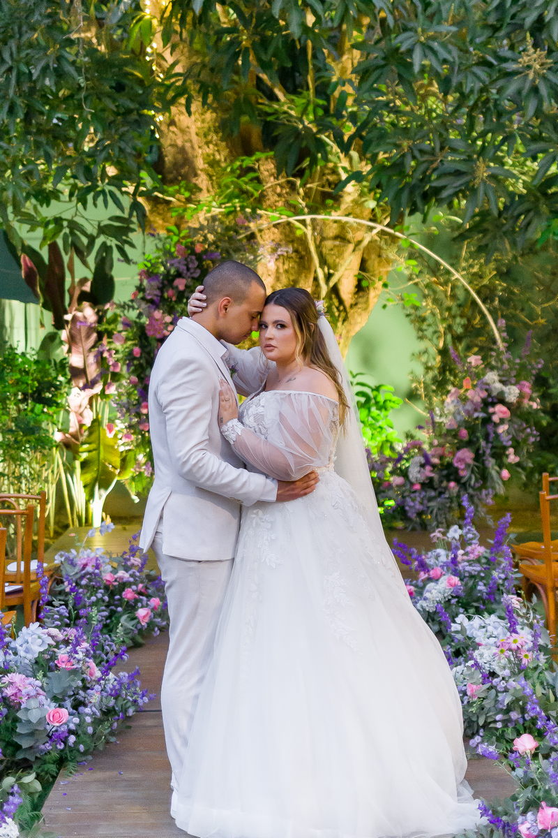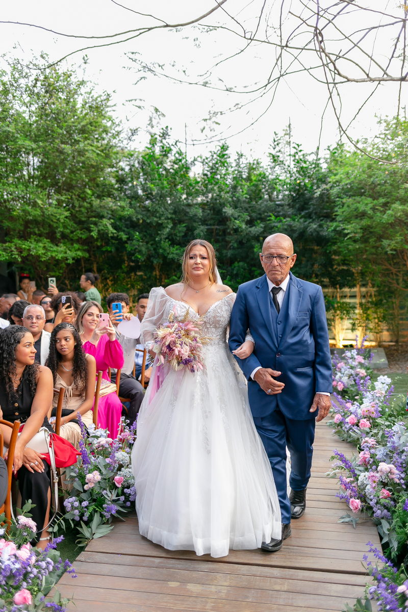 A noiva, Day, estava simplesmente deslumbrante em seu vestido de noiva Internovias. O busto era adornado com renda delicada e um decote maravilhoso. As mangas de tule transparente adicionaram mais encanto e a saia delicada criou um efeito de princesa moderno, fazendo a noiva parecer ter saído diretamente de um conto de fadas. O talento da @milenaraujomakeup na maquiagem e penteado realçou ainda mais a beleza natural da Day. O look era a personificação perfeita do equilíbrio entre elegância clássica e estilo contemporâneo, refletindo a sua personalidade radiante e complementando magnificamente o cenário encantado do casamento.