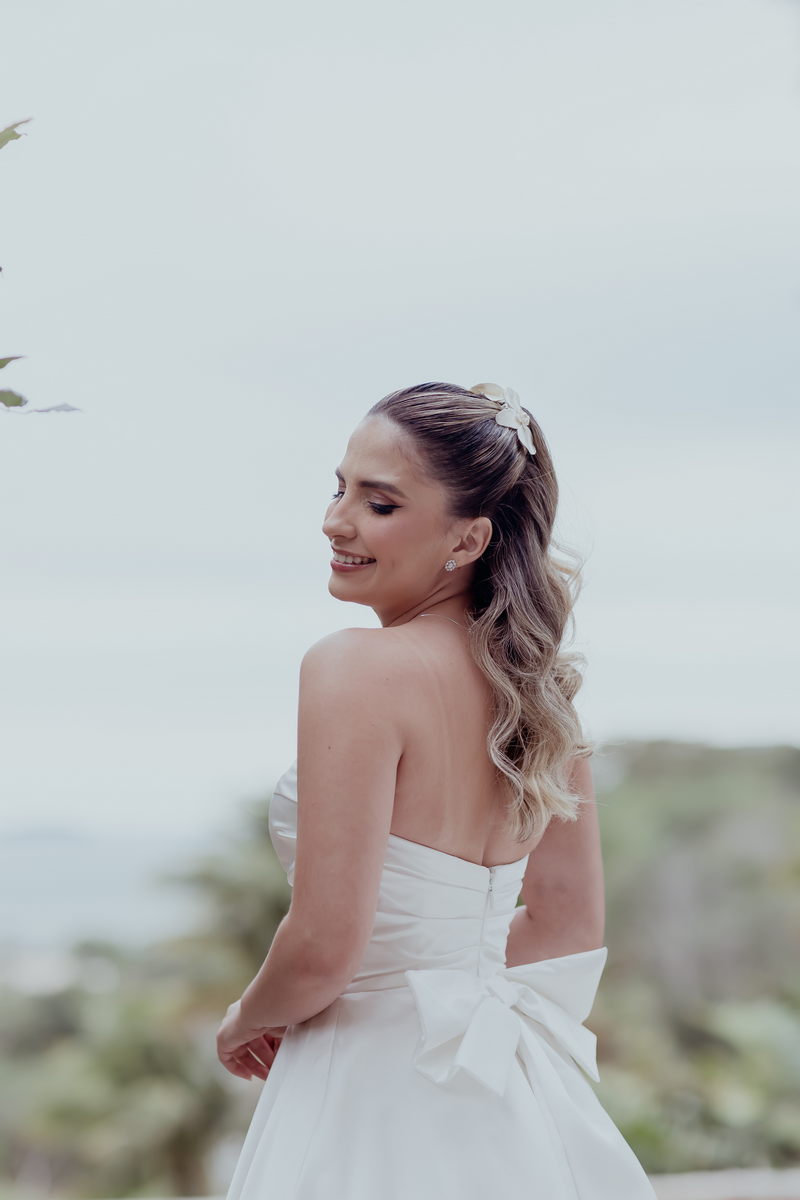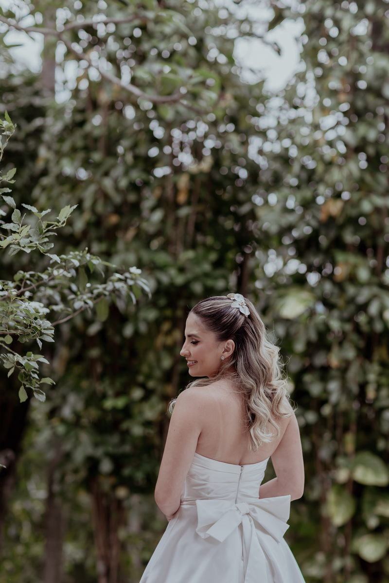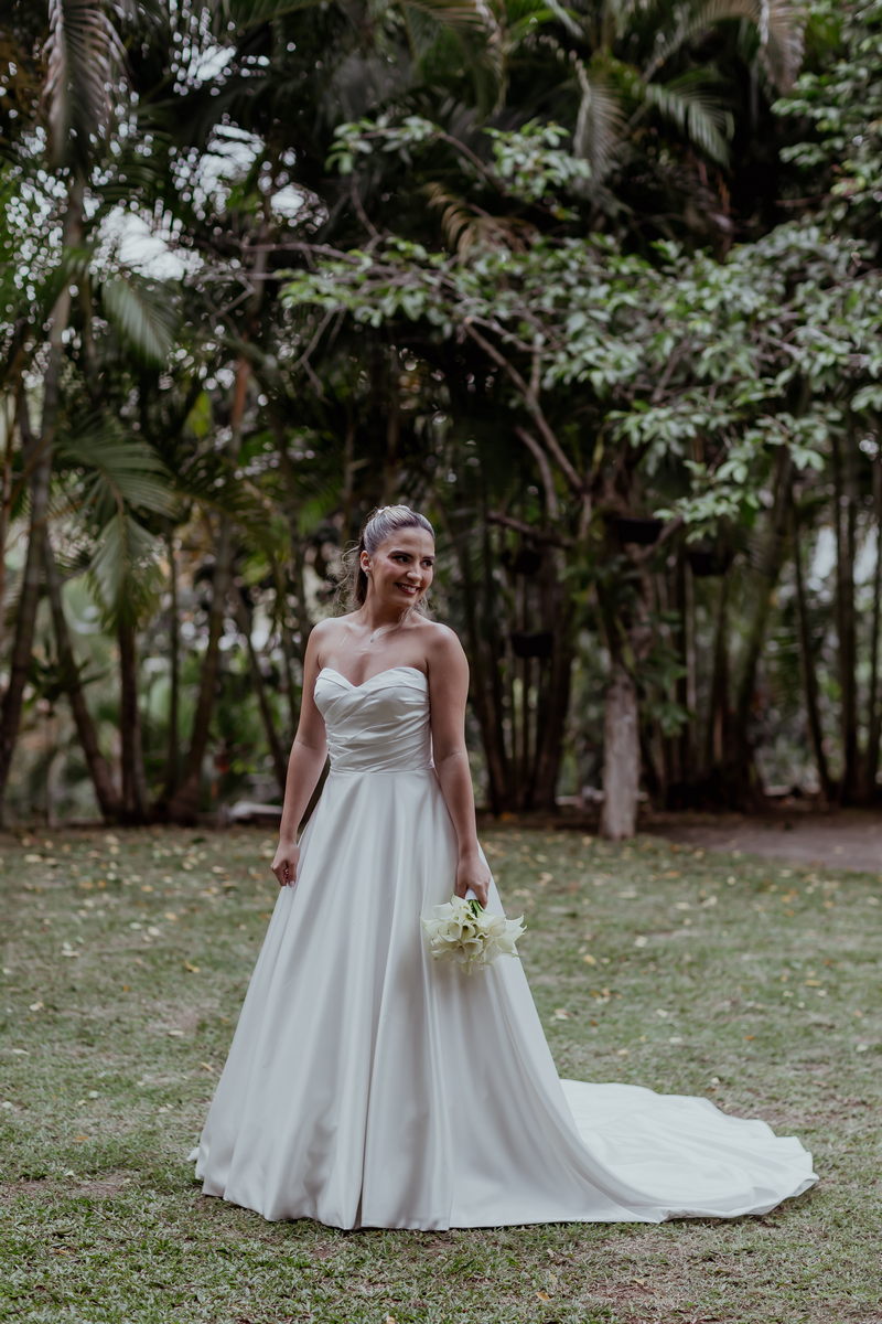A Noiva Internovias Larissa estava deslumbrante em seu vestido de noiva, que era a própria definição de elegância e romantismo. O modelo tomara que caia realçou seu sorriso radiante e trouxe um toque de modernidade ao visual clássico. O encantador laço nas costas e a belíssima cauda adicionaram ainda mais sofisticação à peça.