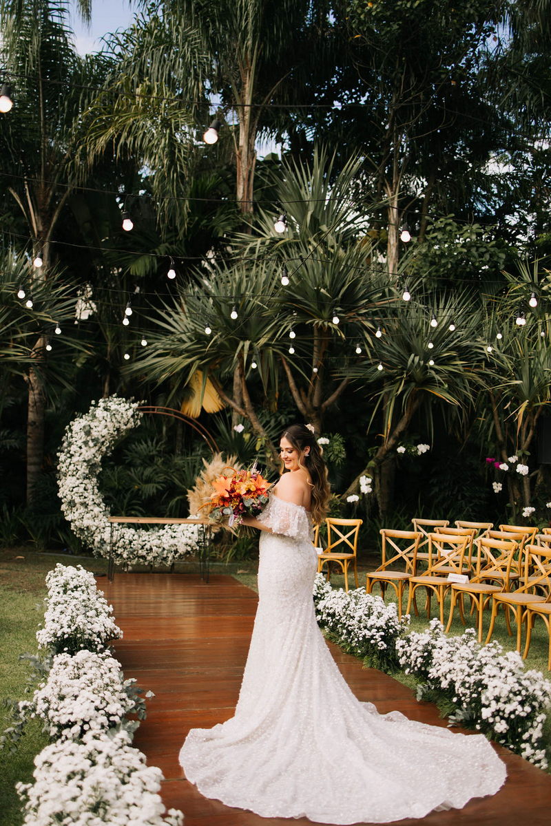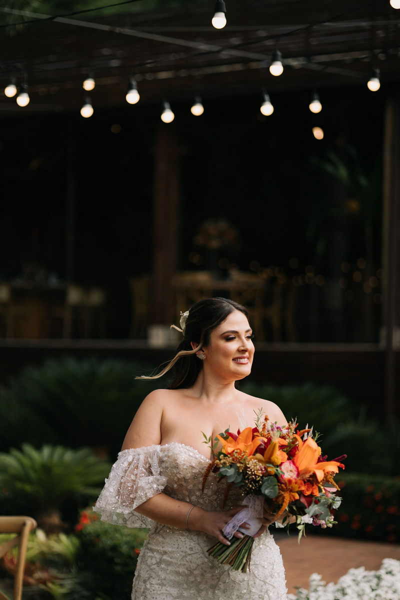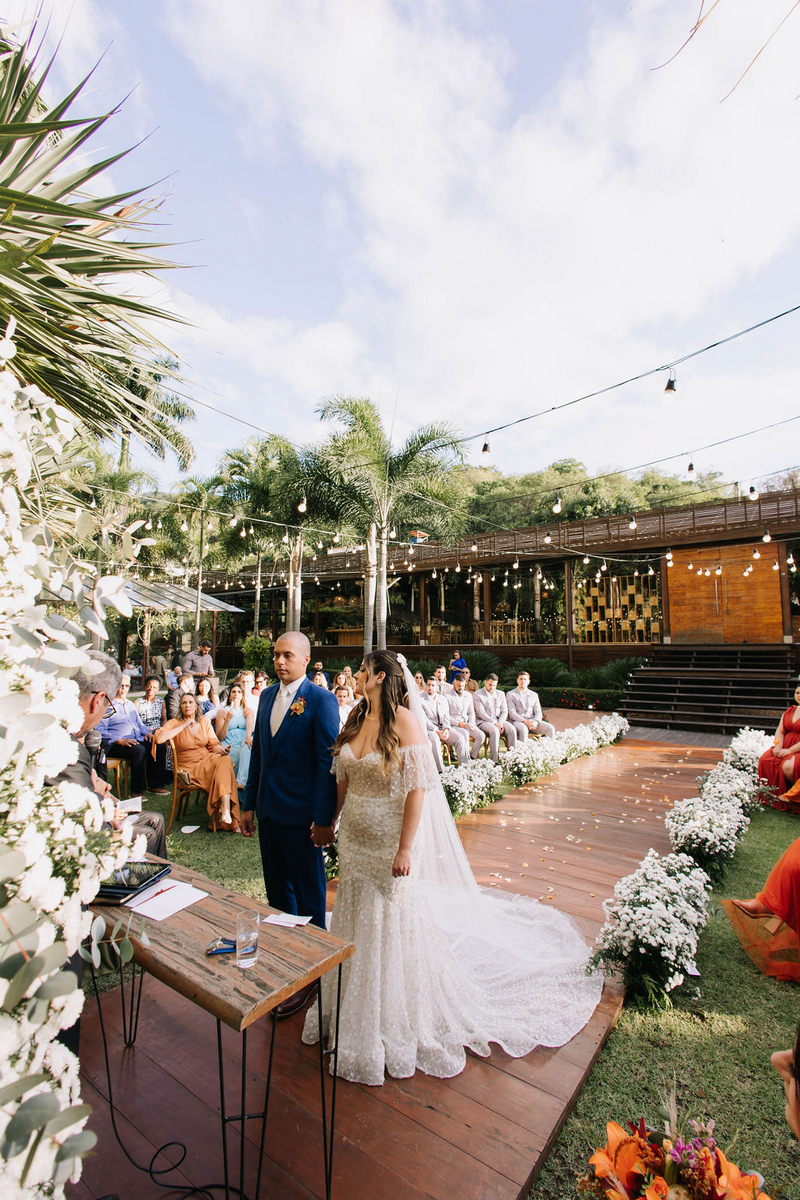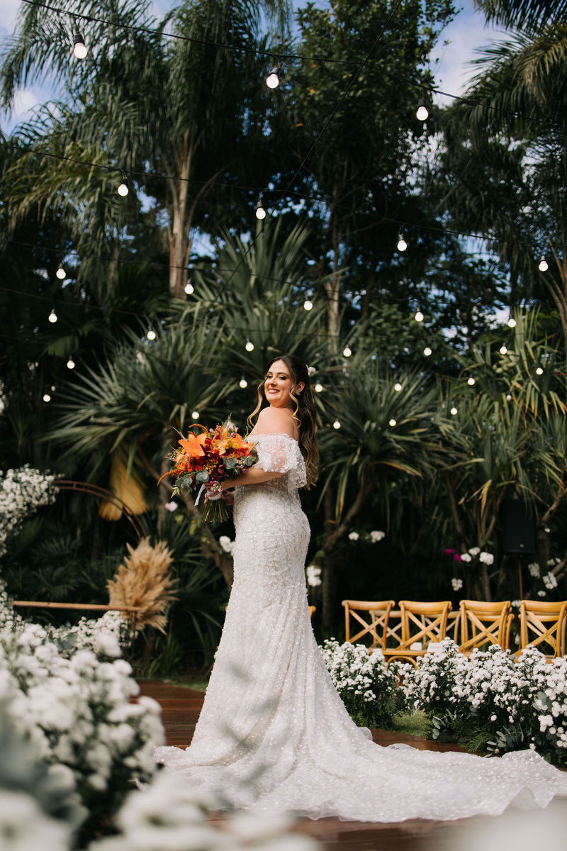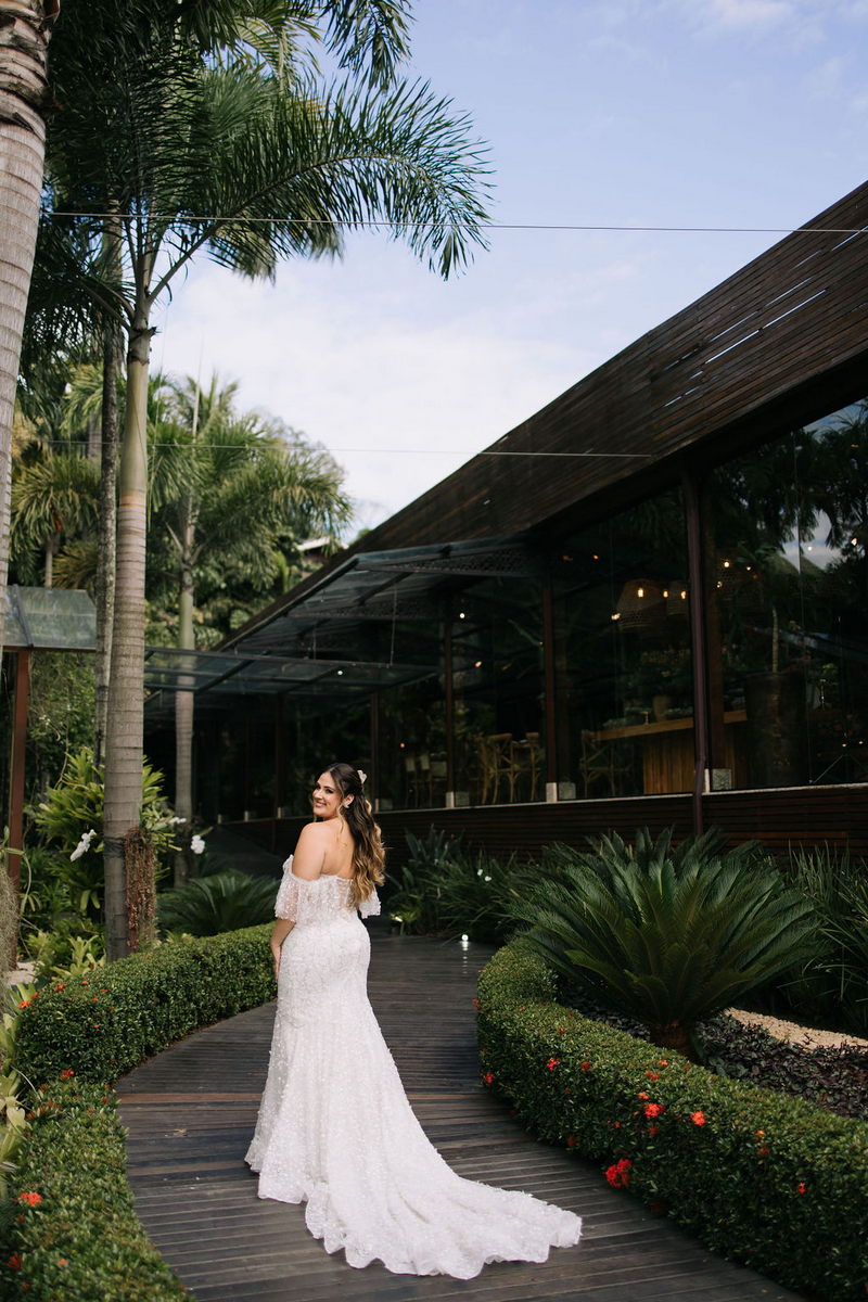 Karine estava deslumbrante em seu vestido de noiva Internovias, que combinou perfeitamente com o ambiente bucólico e elegante. O modelo tinha um corte sereia que destacou suas curvas de maneira elegante, e era todo trabalhado em renda, adicionando um toque romântico e delicado. As mangas, também em renda, acrescentaram um charme especial ao visual. A beleza da noiva foi realçada pelo talento da maquiadora @tatiiribeiro, que optou por um look suave e natural, destacando ainda mais o brilho da felicidade em seu rosto.