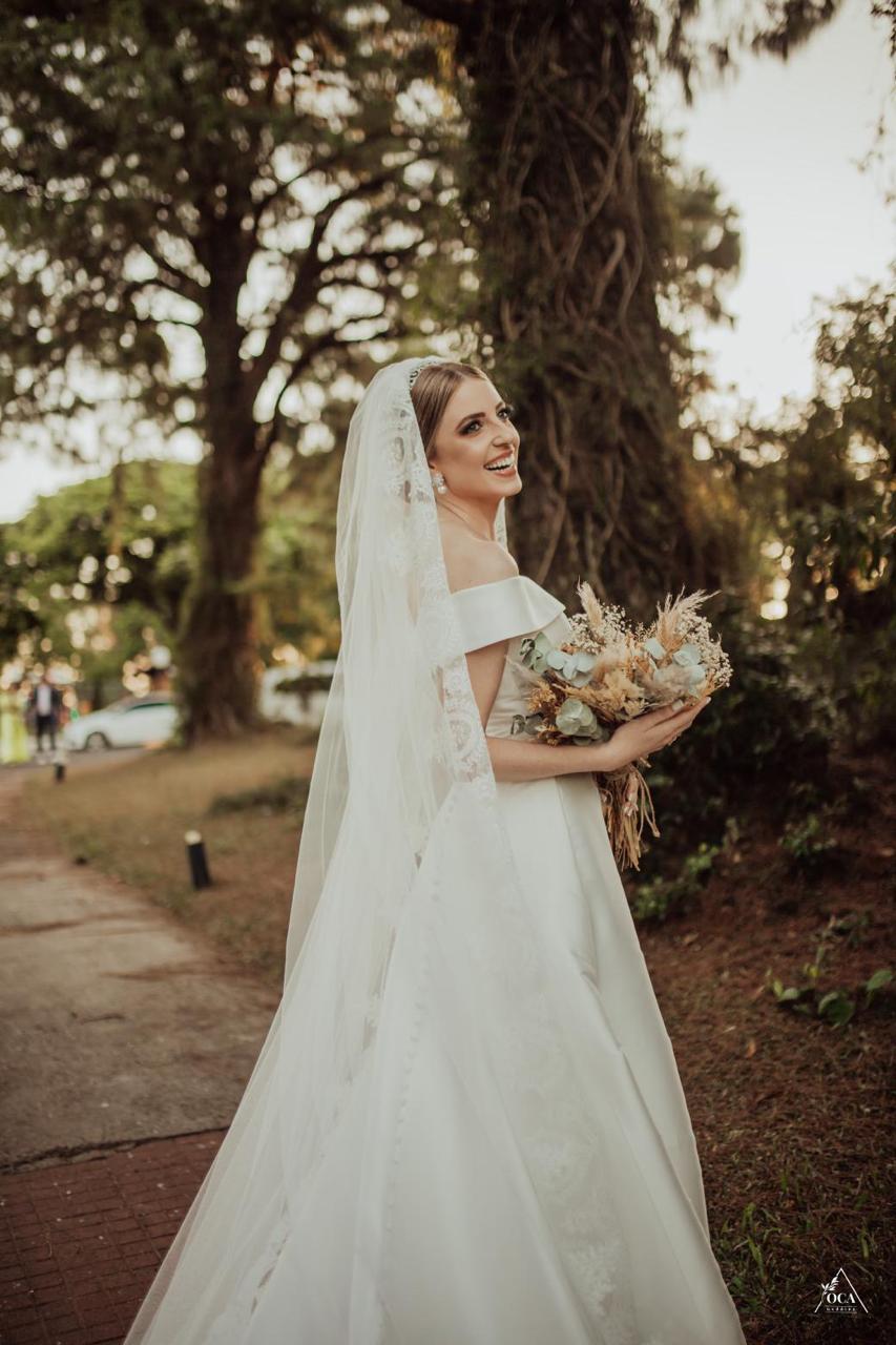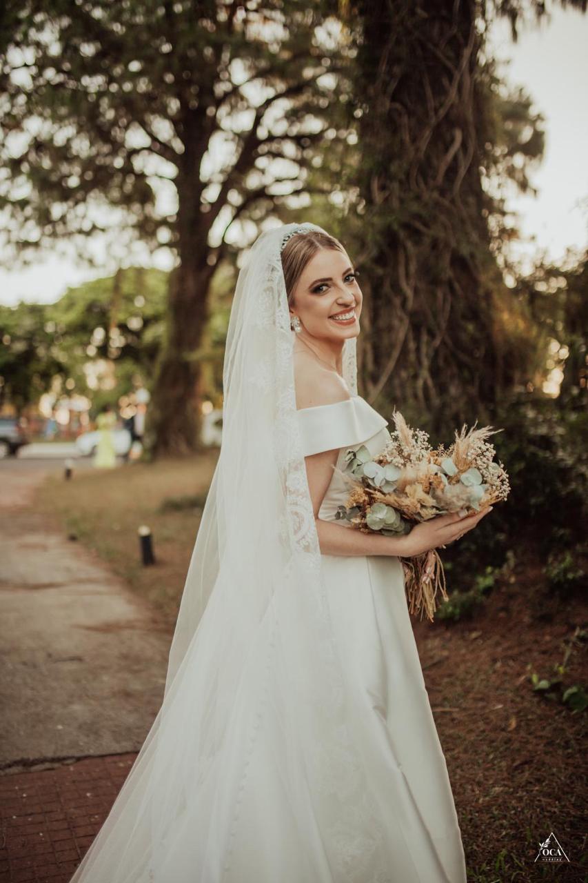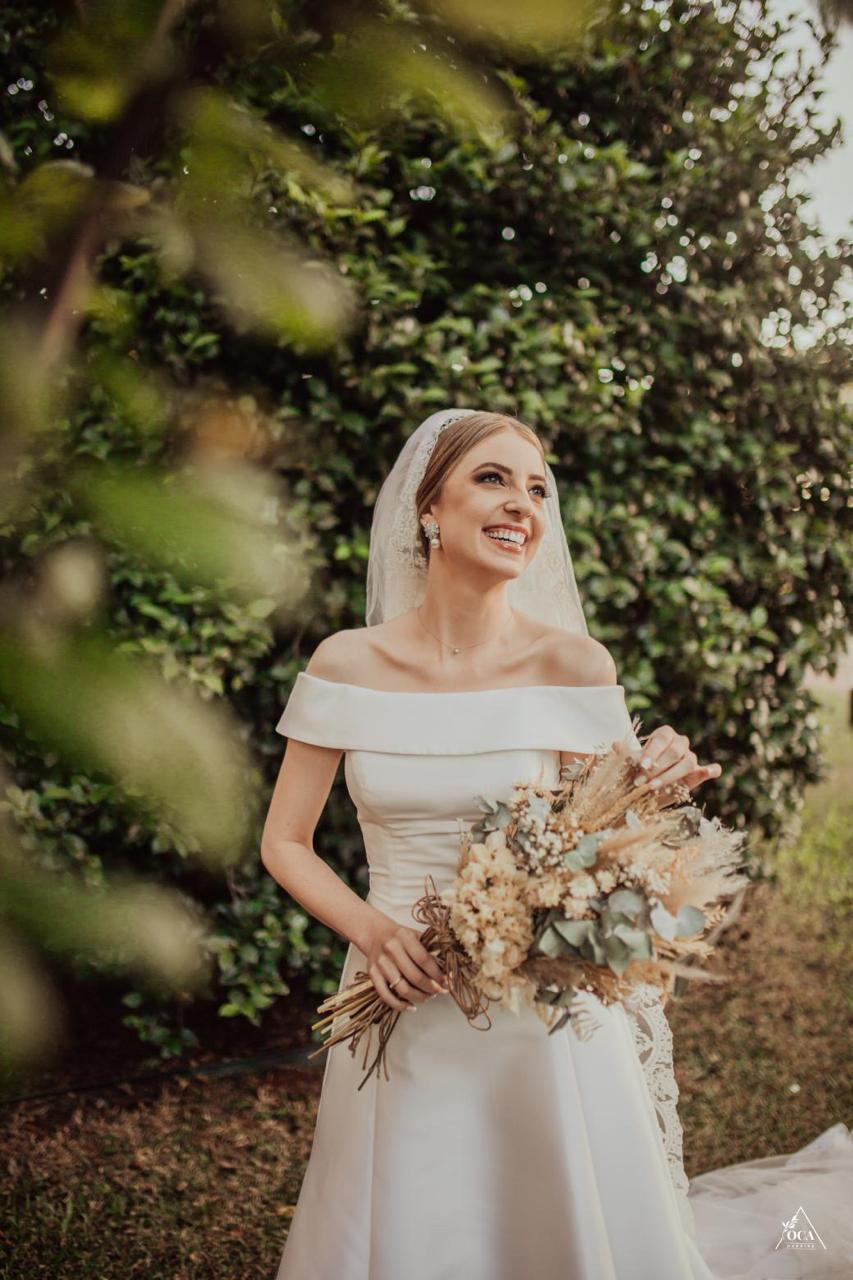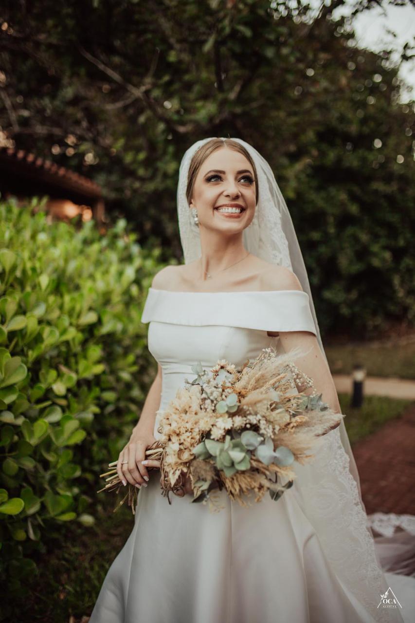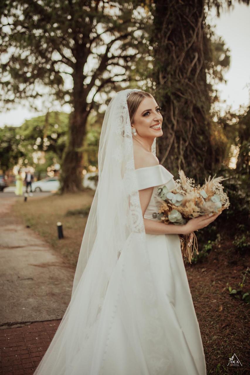 A Andressa estava deslumbrante em seu vestido de noiva Internovias. O modelo minimalista, se destacava com seu decote ombro a ombro maravilhoso e saia longa encantadora, além de sua cauda que se estendia graciosamente por onde passava. Sua beleza natural foi realçada pela impecável maquiagem da Jaqueline Posselt, madrinha de casamento e amiga de infância, atualmente dedicada ao talentoso trabalho no @quintaldasfloreshz. O penteado, obra de arte do @centro_de_estetica_belissimahz, complementou o visual, criando um look sofisticado e harmonioso.
