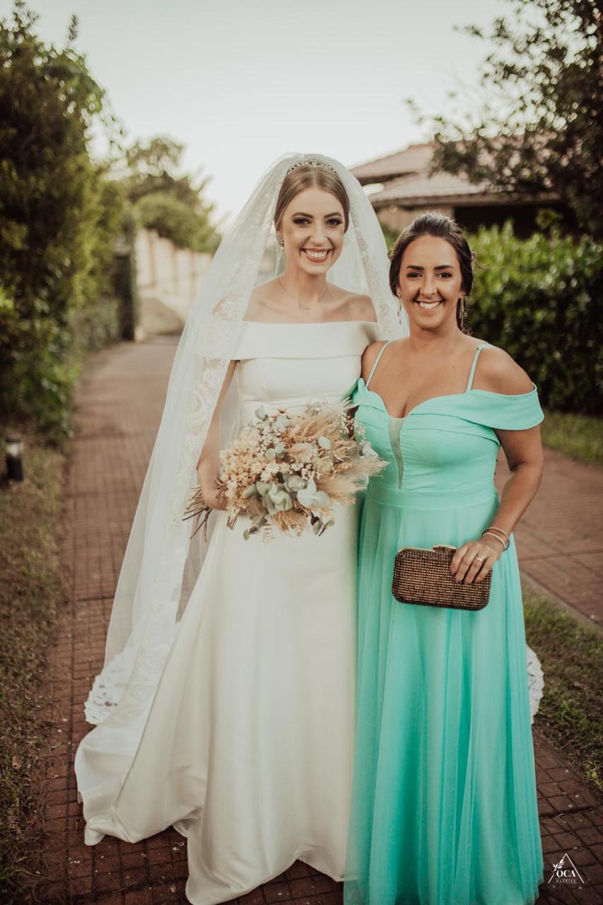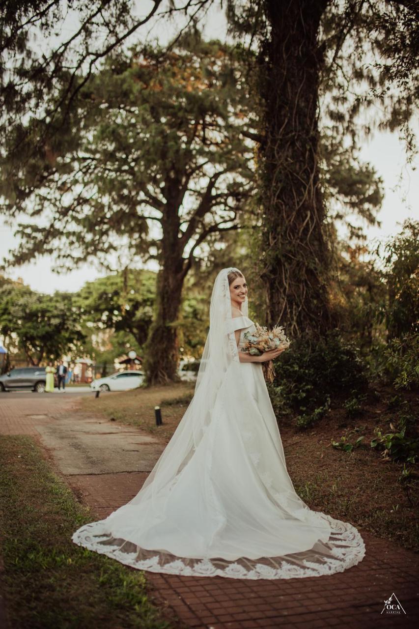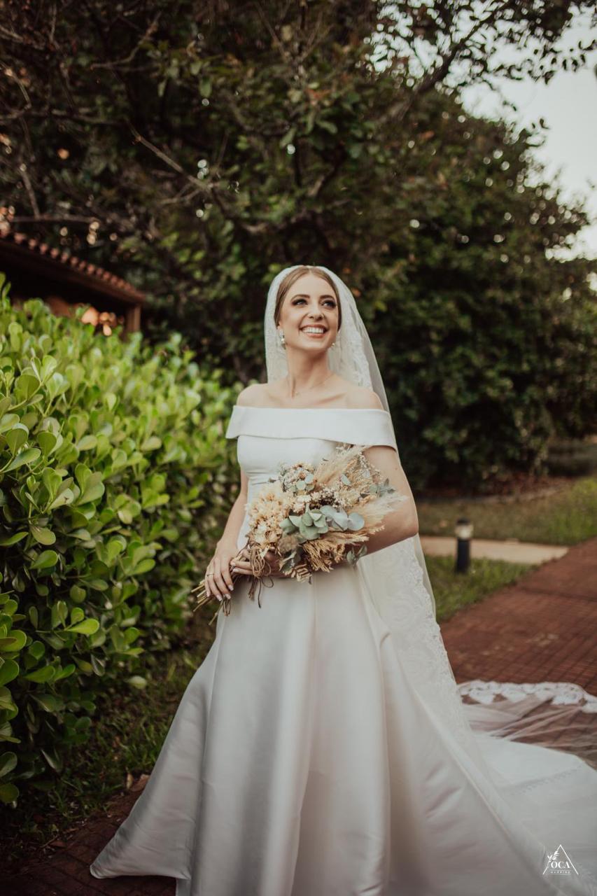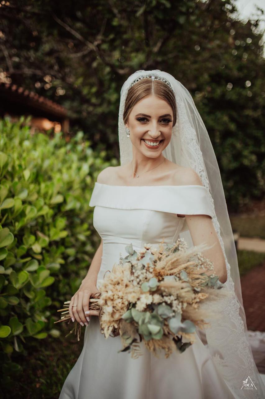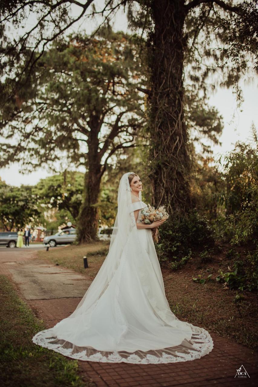 A Andressa estava deslumbrante em seu vestido de noiva Internovias. O modelo minimalista, se destacava com seu decote ombro a ombro maravilhoso e saia longa encantadora, além de sua cauda que se estendia graciosamente por onde passava. Sua beleza natural foi realçada pela impecável maquiagem da Jaqueline Posselt, madrinha de casamento e amiga de infância, atualmente dedicada ao talentoso trabalho no @quintaldasfloreshz. O penteado, obra de arte do @centro_de_estetica_belissimahz, complementou o visual, criando um look sofisticado e harmonioso.