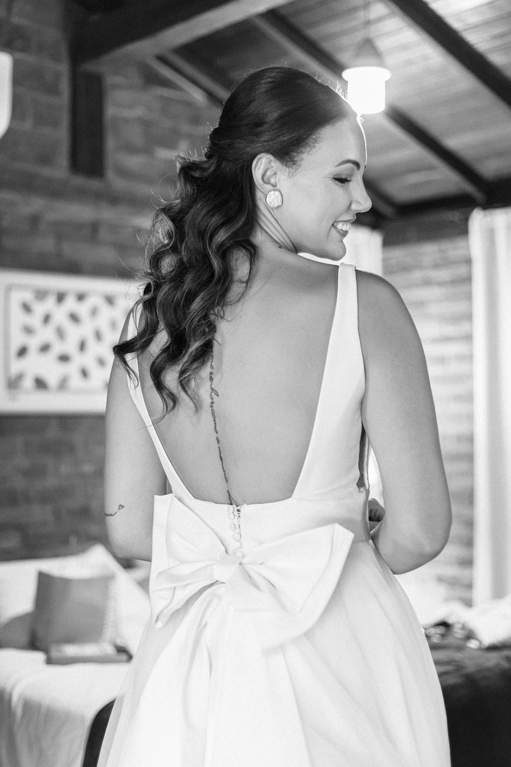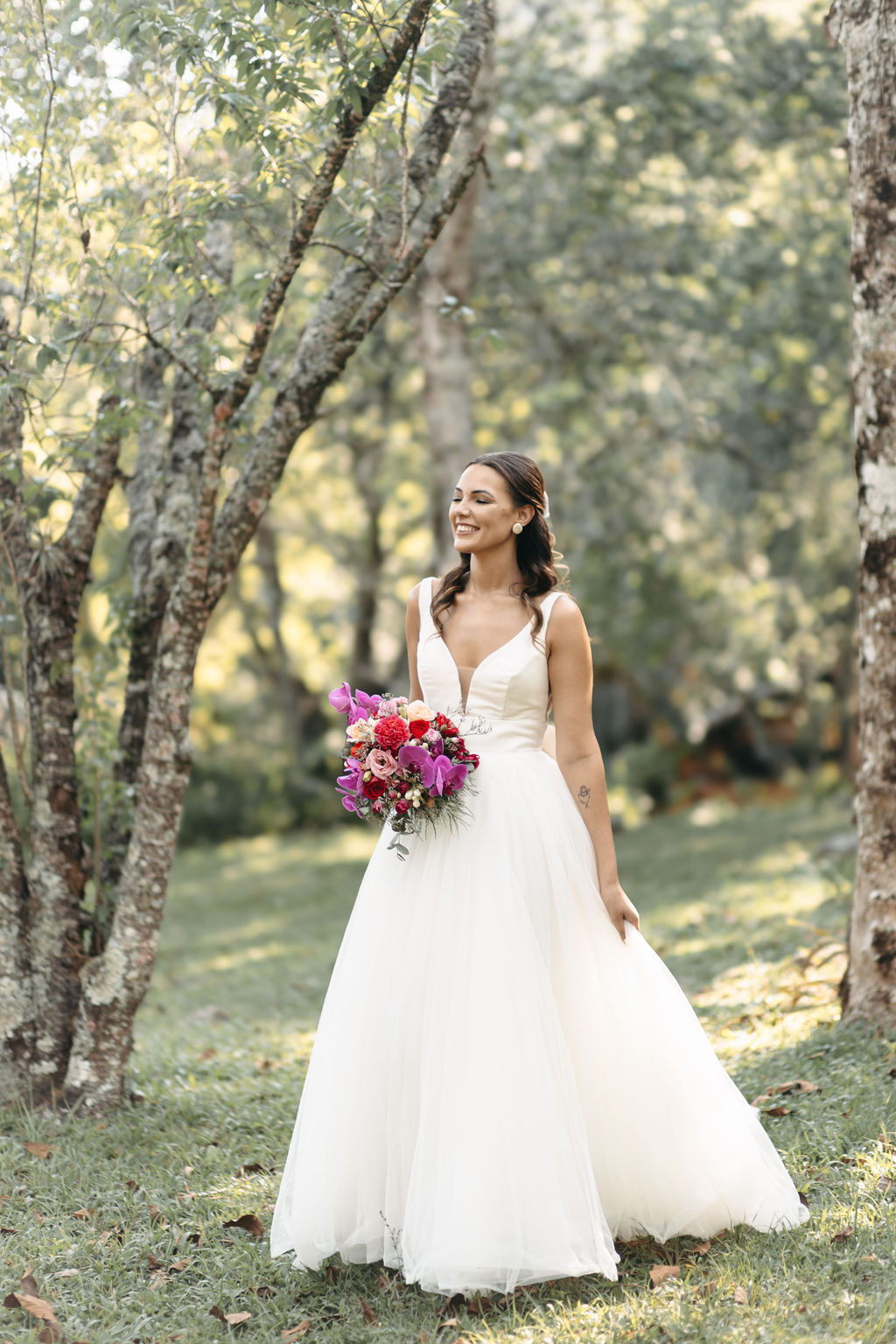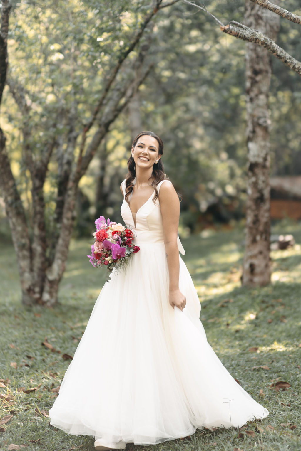 Vanessa estava deslumbrante com seu vestido de noiva Internovias. Ela optou por um modelo estilo princesa, com um lindo decote frontal e detalhes em transparência nas laterais, um vestido sofisticado e ao mesmo tempo delicado. O detalhe do laço grande na parte de trás adicionou um toque romântico ao look, complementando perfeitamente a peça. A beleza da noiva foi realçada pela talentosa @jani.levandowski, que escolheu um penteado semi-preso com ondas suaves e maquiagem suave, criando um look harmonioso e sofisticado.