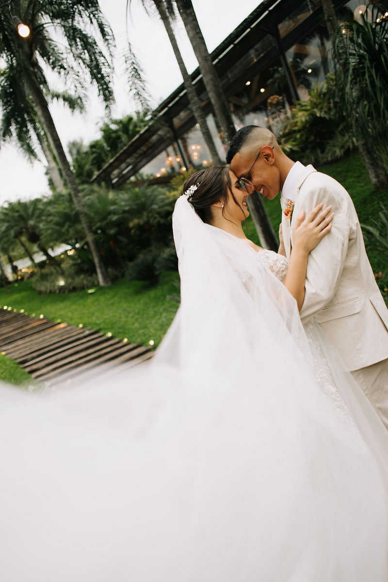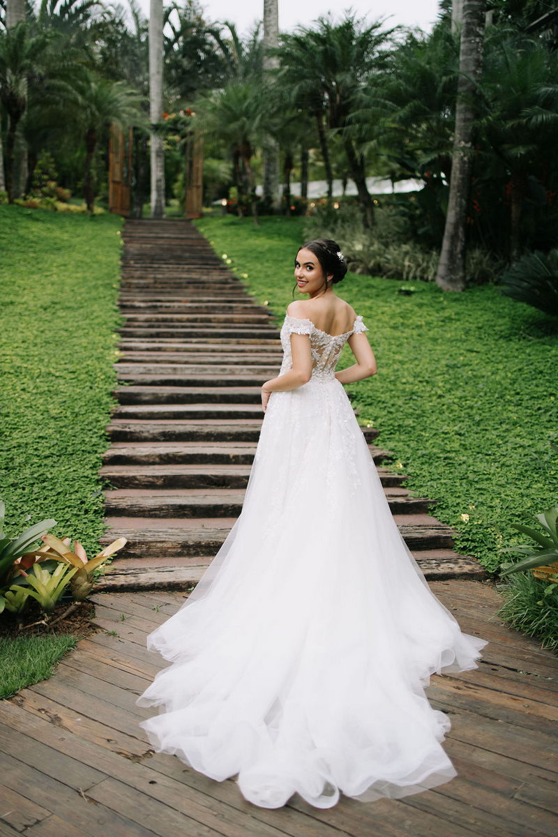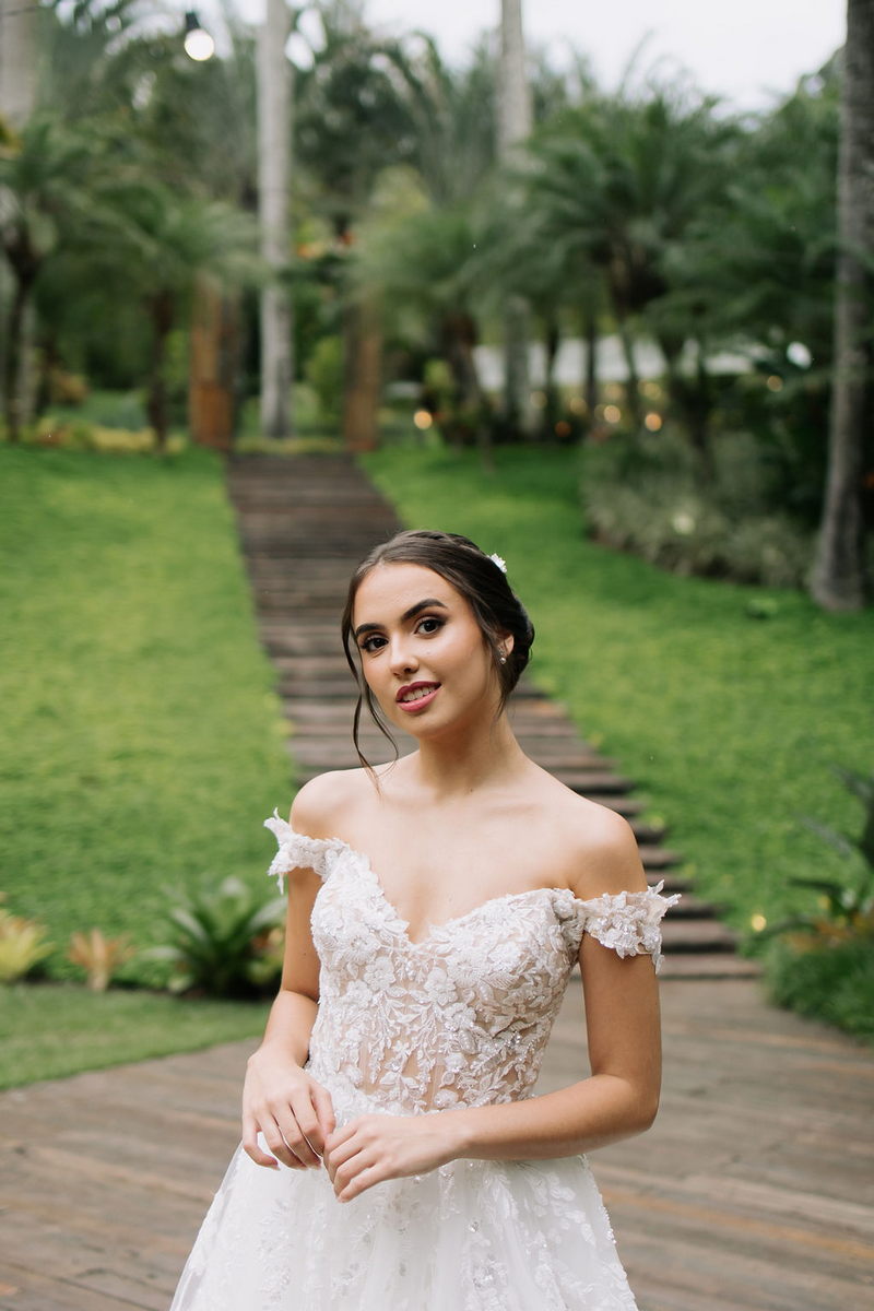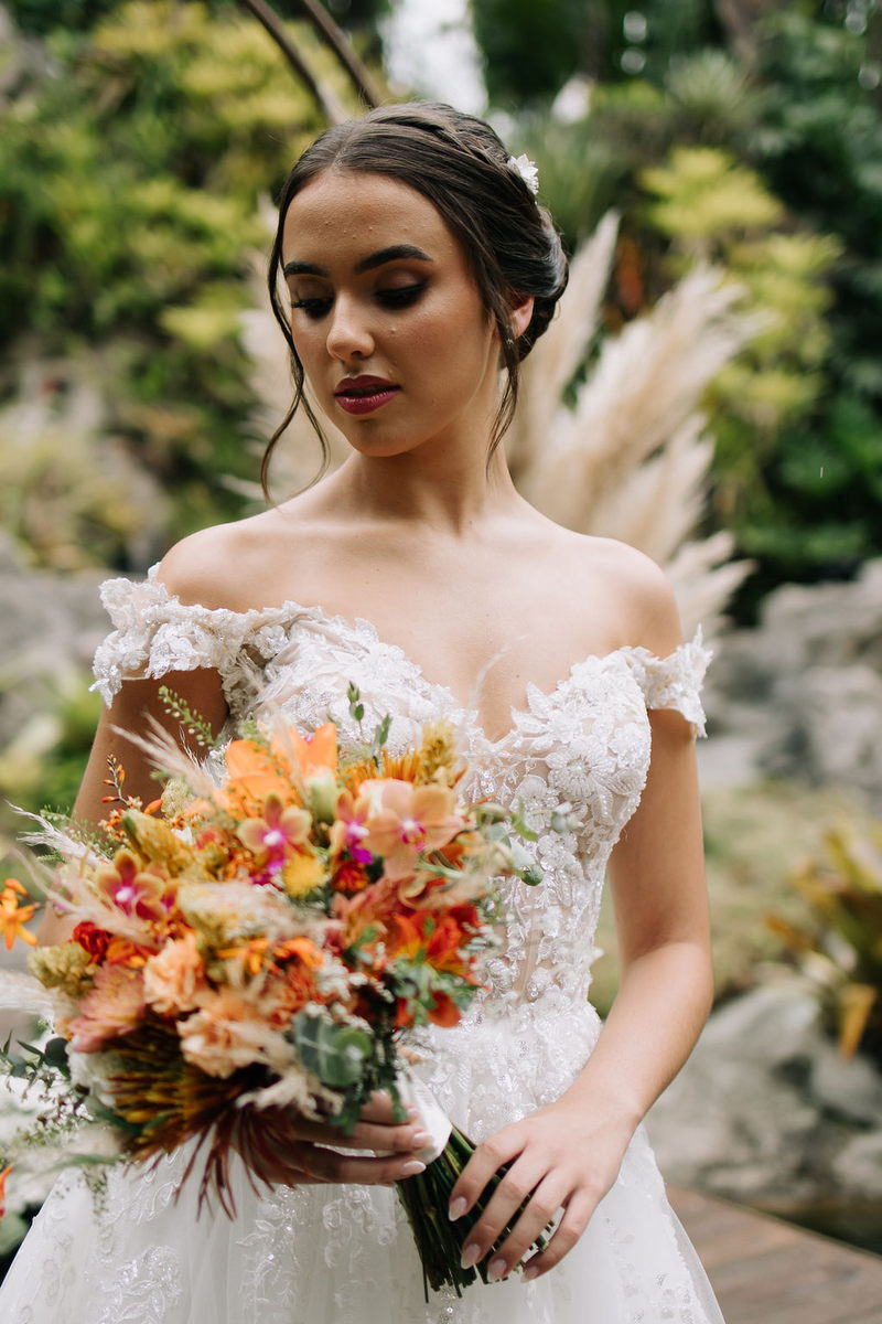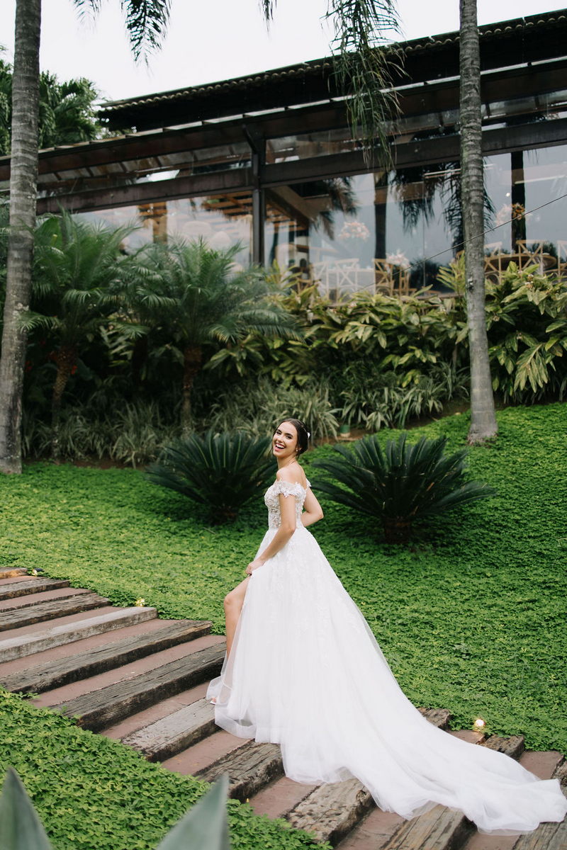 Daniella estava simplesmente deslumbrante em seu vestido de noiva da Internovias. O modelo escolhido foi um verdadeiro espetáculo, o busto transparente adornado por aplicações delicadas, destacaram sua feminilidade e elegância. As mangas bordadas, trouxeram um toque romântico e sofisticado ao visual. A saia volumosa conferiu leveza e movimento ao vestido, enquanto a fenda lateral adicionou um toque moderno, perfeito para uma noiva que deseja unir tradição e contemporaneidade. Para completar o look, o buquê vibrante com flores tropicais, trouxe um contraste alegre e cheio de personalidade.