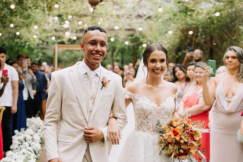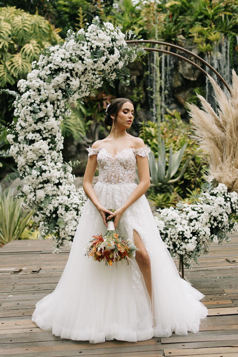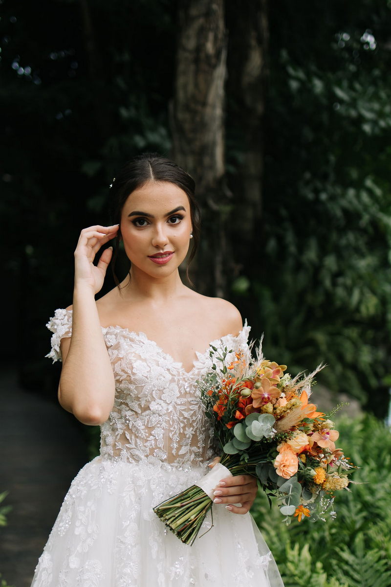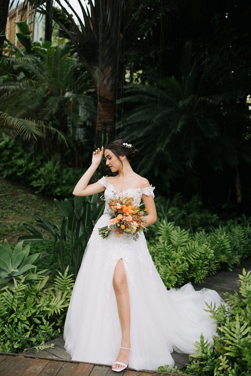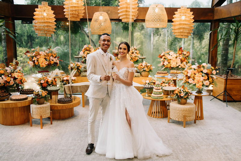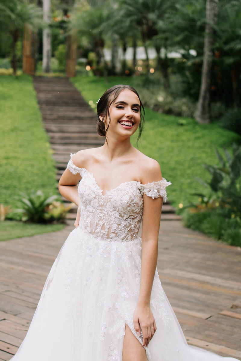 Daniella estava simplesmente deslumbrante em seu vestido de noiva da Internovias. O modelo escolhido foi um verdadeiro espetáculo, o busto transparente adornado por aplicações delicadas, destacaram sua feminilidade e elegância. As mangas bordadas, trouxeram um toque romântico e sofisticado ao visual. A saia volumosa conferiu leveza e movimento ao vestido, enquanto a fenda lateral adicionou um toque moderno, perfeito para uma noiva que deseja unir tradição e contemporaneidade. Para completar o look, o buquê vibrante com flores tropicais, trouxe um contraste alegre e cheio de personalidade.