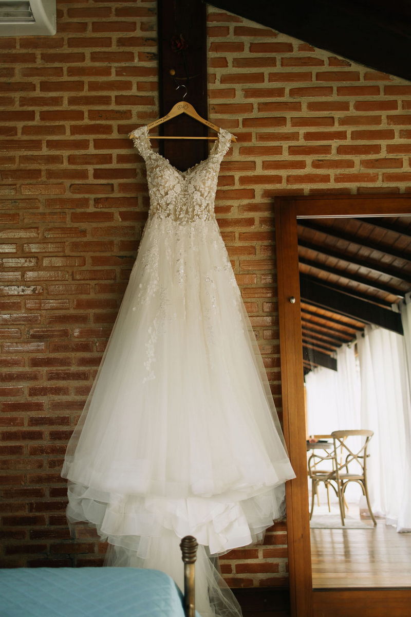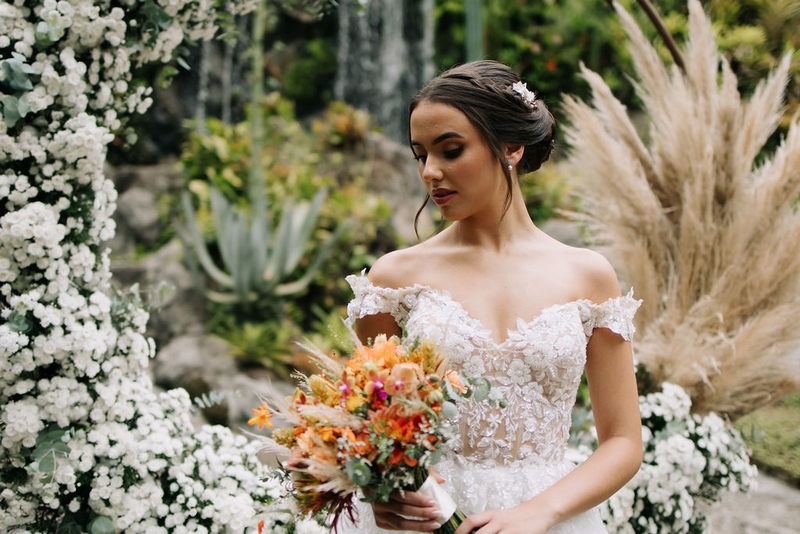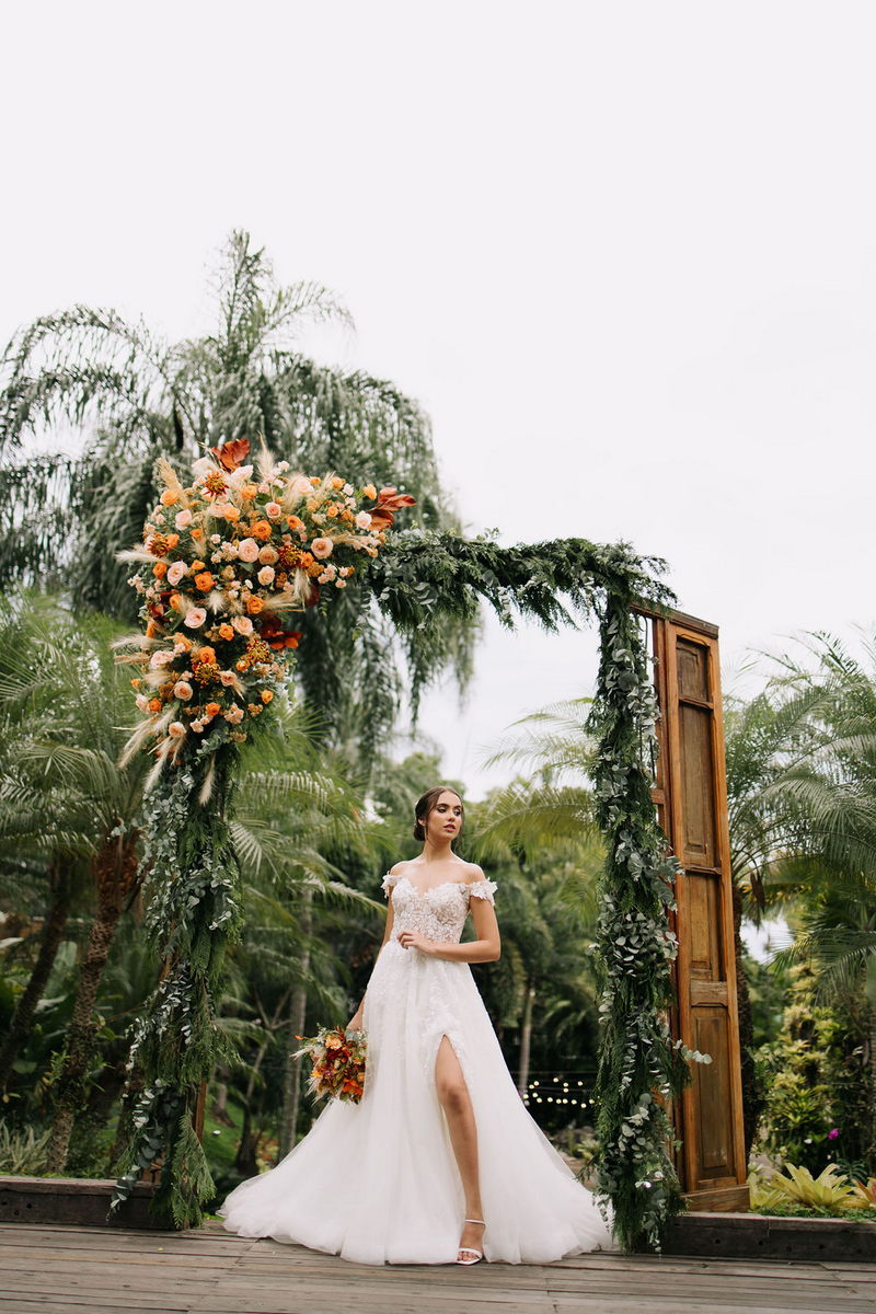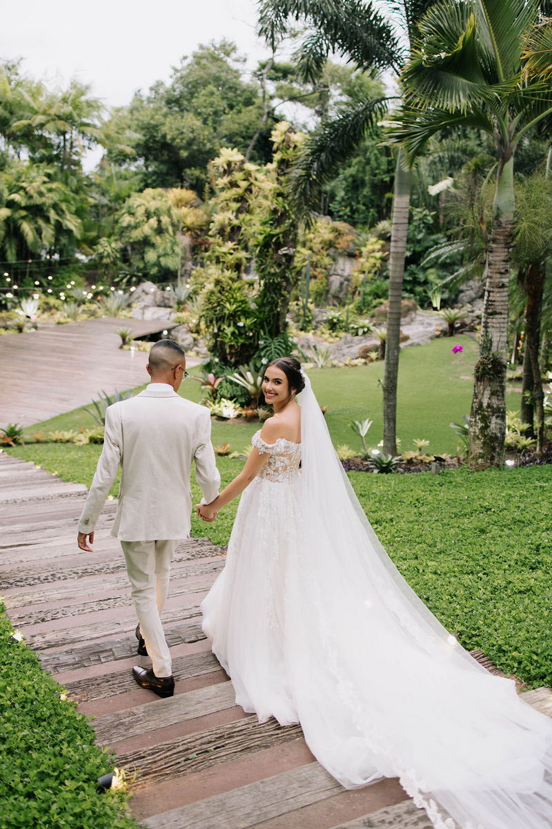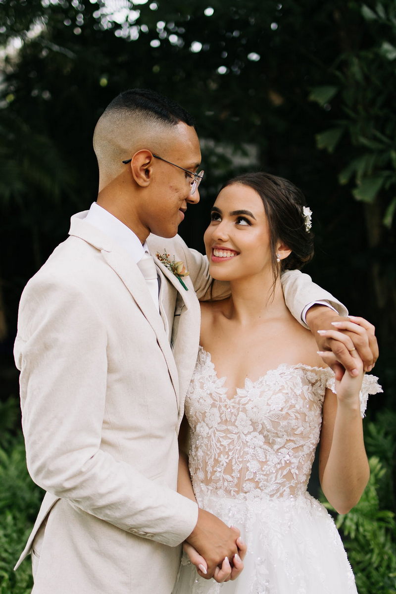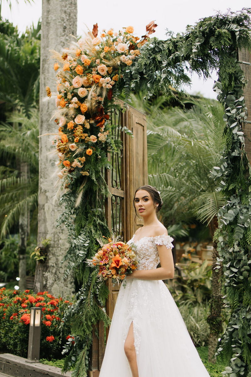 Daniella estava simplesmente deslumbrante em seu vestido de noiva da Internovias. O modelo escolhido foi um verdadeiro espetáculo, o busto transparente adornado por aplicações delicadas, destacaram sua feminilidade e elegância. As mangas bordadas, trouxeram um toque romântico e sofisticado ao visual. A saia volumosa conferiu leveza e movimento ao vestido, enquanto a fenda lateral adicionou um toque moderno, perfeito para uma noiva que deseja unir tradição e contemporaneidade. Para completar o look, o buquê vibrante com flores tropicais, trouxe um contraste alegre e cheio de personalidade.