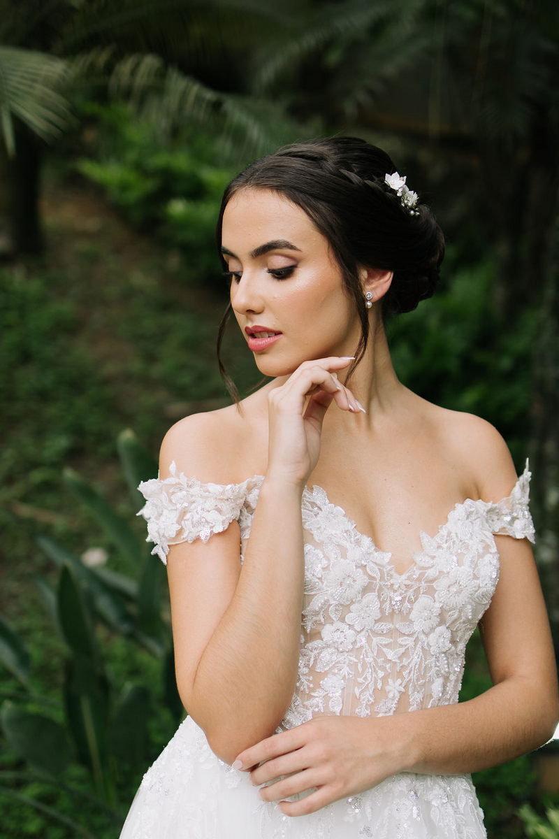A maquiagem, assinada pela @anasamakeup, destacou sua beleza natural com um toque de sofisticação. Com uma pele perfeita e olhos levemente marcados, o resultado foi um visual delicado e harmônico, ideal para um casamento ao ar livre.