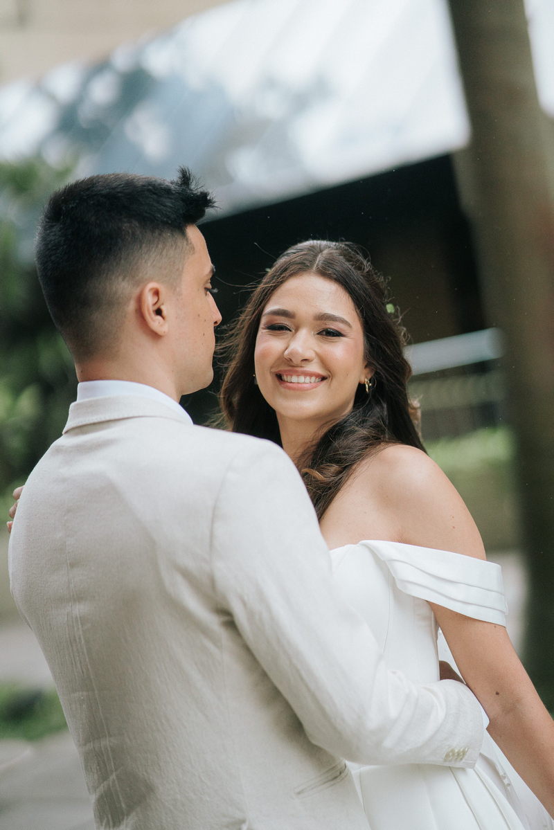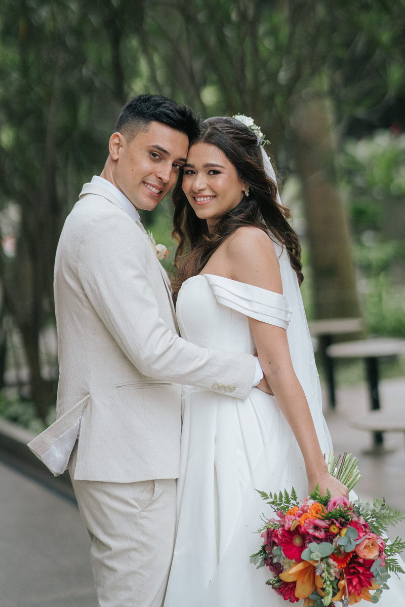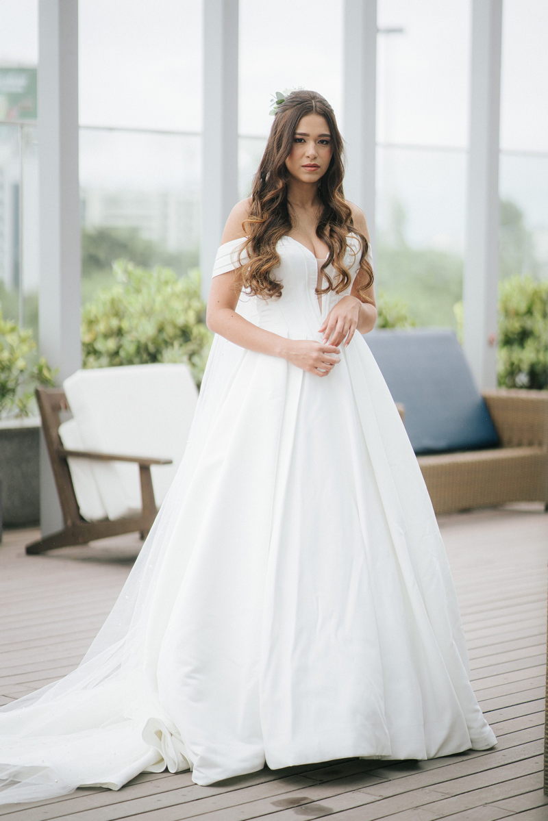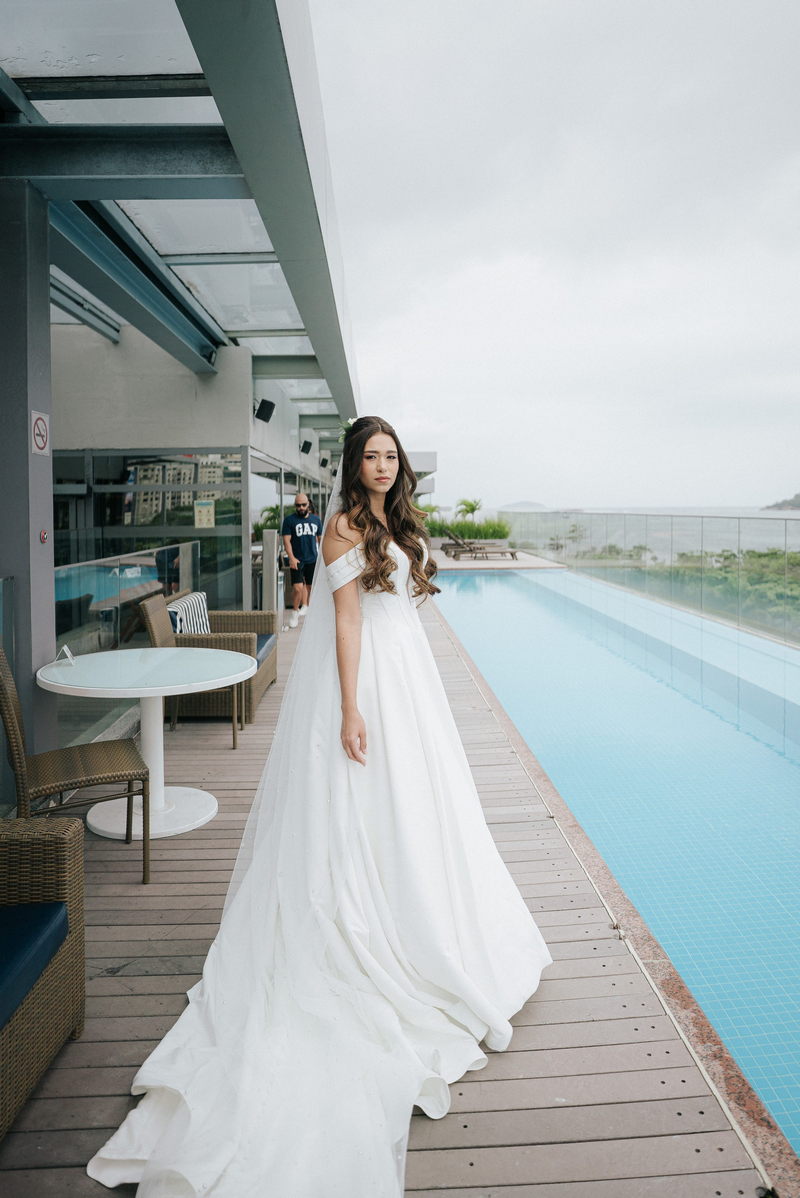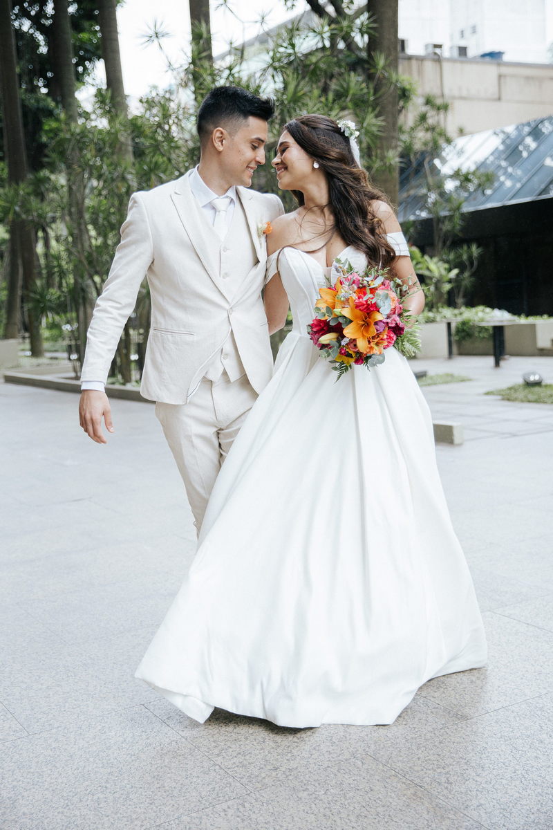 Lorraine estava absolutamente deslumbrante em seu vestido de noiva Internovias. O modelo escolhido destacou sua beleza de maneira única, o busto com detalhes em linhas verticais e decote maravilhoso trouxe um toque moderno e elegante, enquanto a saia majestosa finalizou a peça de forma perfeita. As mangas caídas adicionaram um charme romântico e atemporal, harmonizando perfeitamente com o estilo clássico e elegante do vestido. O buquê colorido complementou o visual com um toque vibrante e alegre.