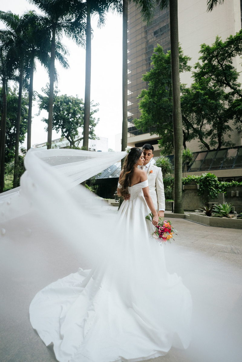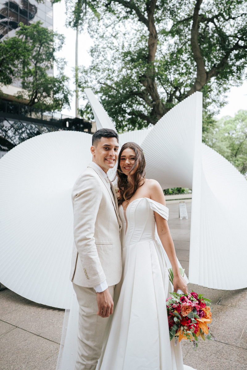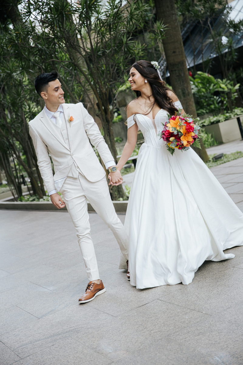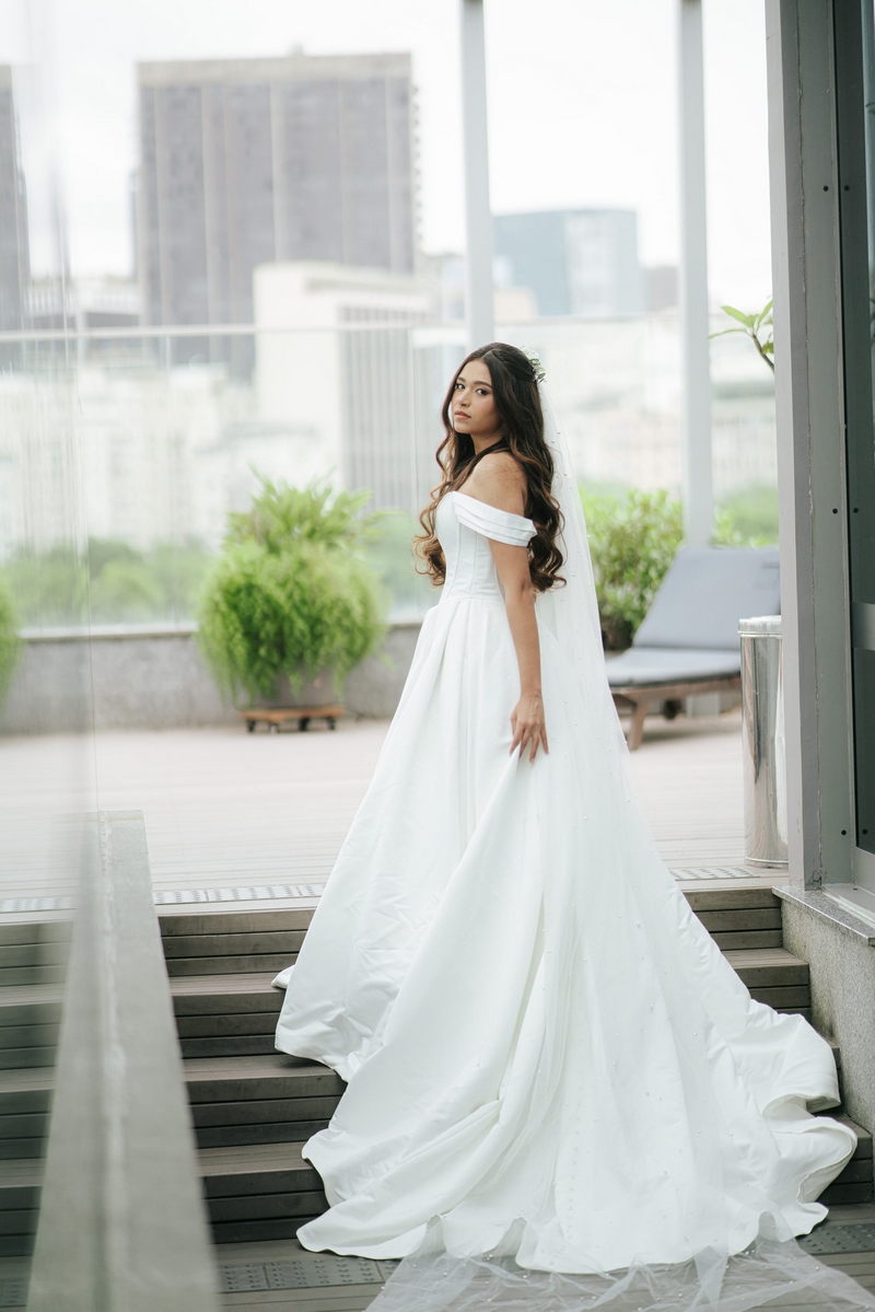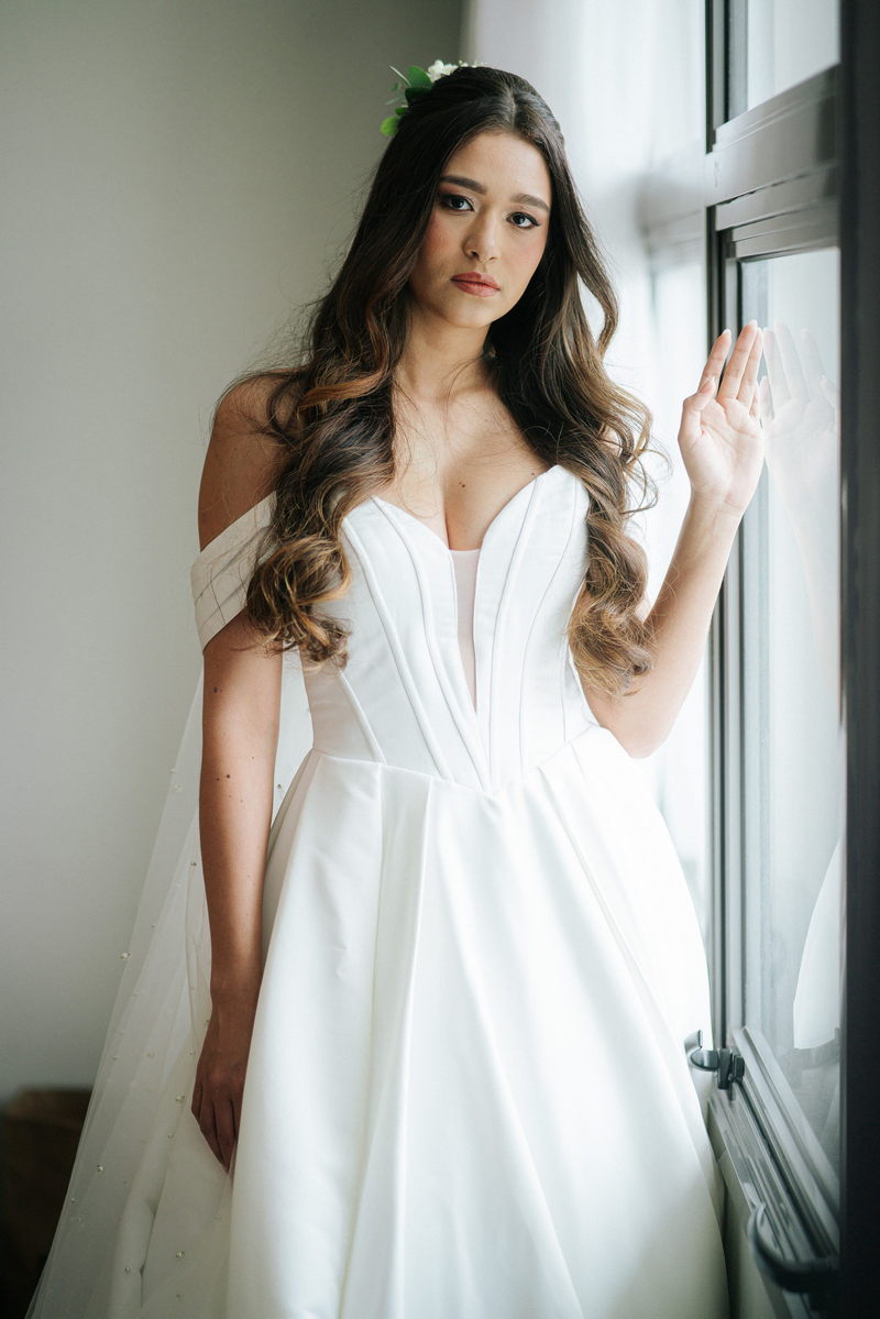Lorraine estava absolutamente deslumbrante em seu vestido de noiva Internovias. O modelo escolhido destacou sua beleza de maneira única, o busto com detalhes em linhas verticais e decote maravilhoso trouxe um toque moderno e elegante, enquanto a saia majestosa finalizou a peça de forma perfeita. As mangas caídas adicionaram um charme romântico e atemporal, harmonizando perfeitamente com o estilo clássico e elegante do vestido. O buquê colorido complementou o visual com um toque vibrante e alegre.
