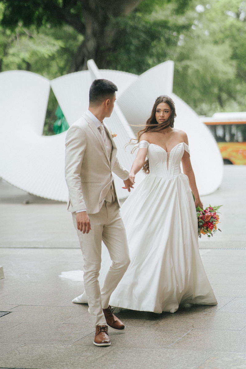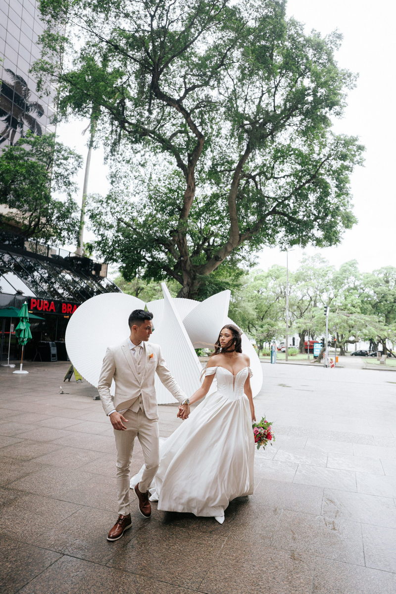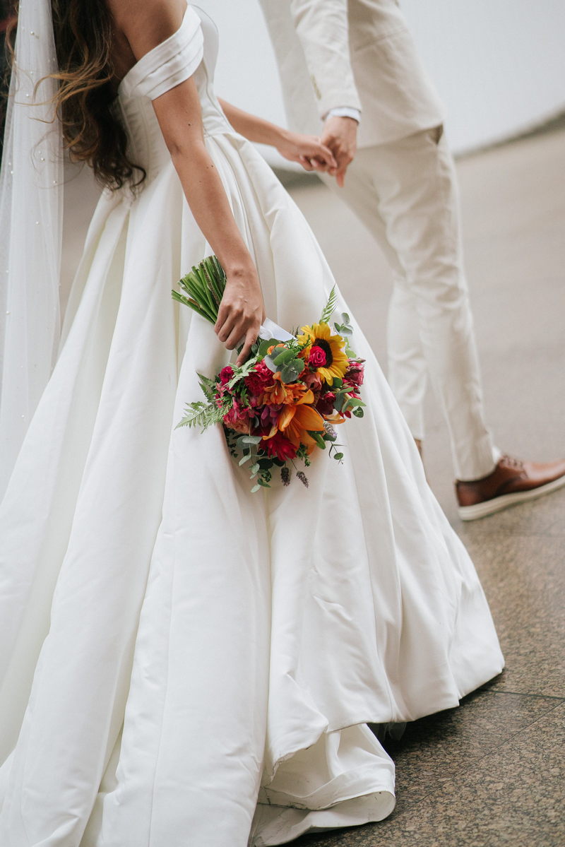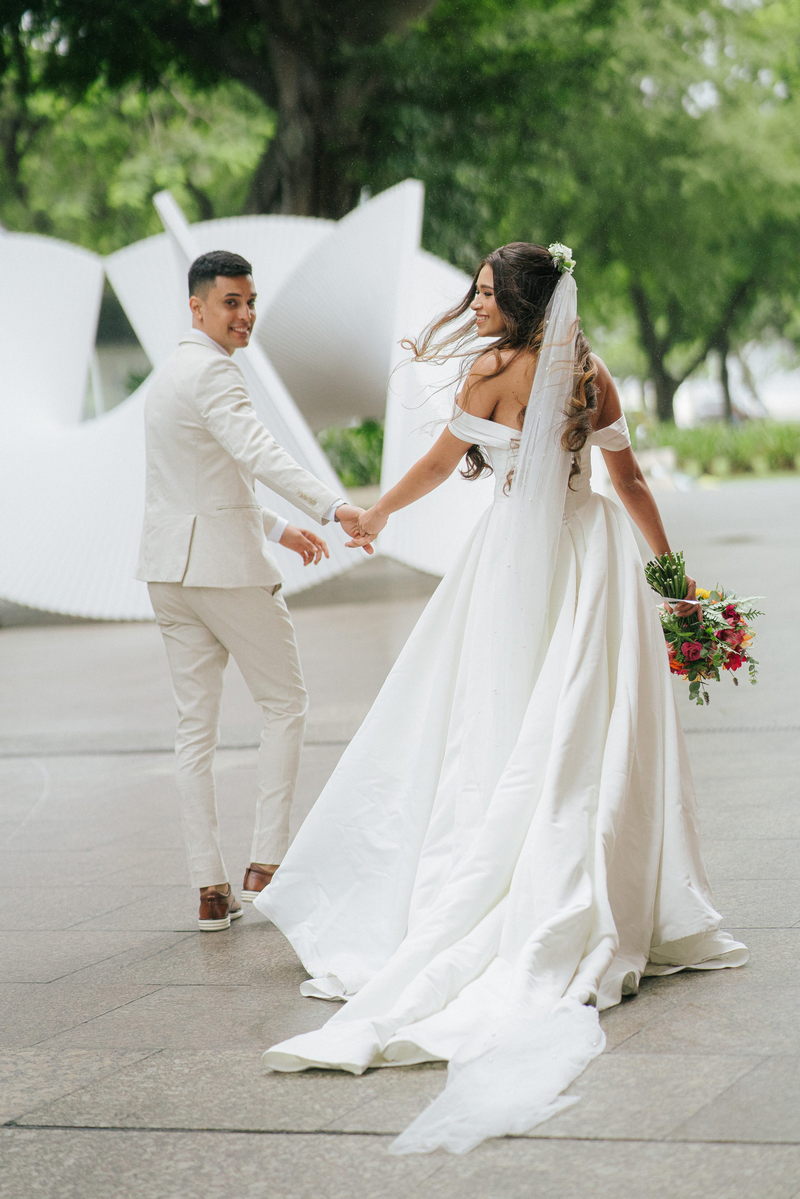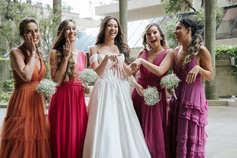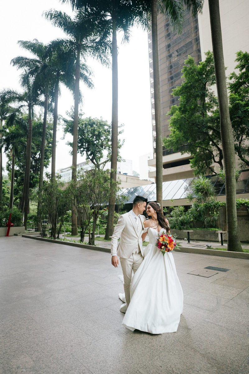 Lorraine estava absolutamente deslumbrante em seu vestido de noiva Internovias. O modelo escolhido destacou sua beleza de maneira única, o busto com detalhes em linhas verticais e decote maravilhoso trouxe um toque moderno e elegante, enquanto a saia majestosa finalizou a peça de forma perfeita. As mangas caídas adicionaram um charme romântico e atemporal, harmonizando perfeitamente com o estilo clássico e elegante do vestido. O buquê colorido complementou o visual com um toque vibrante e alegre.