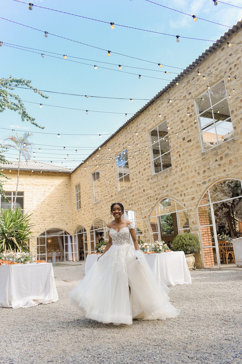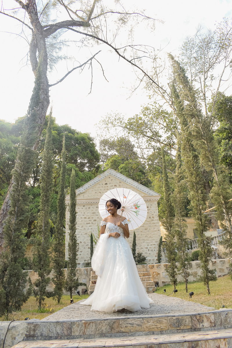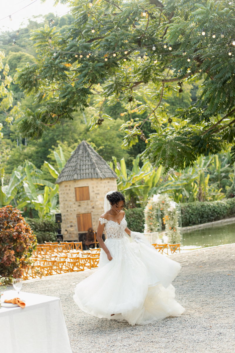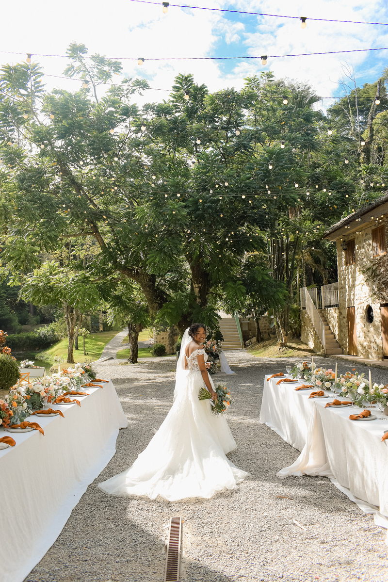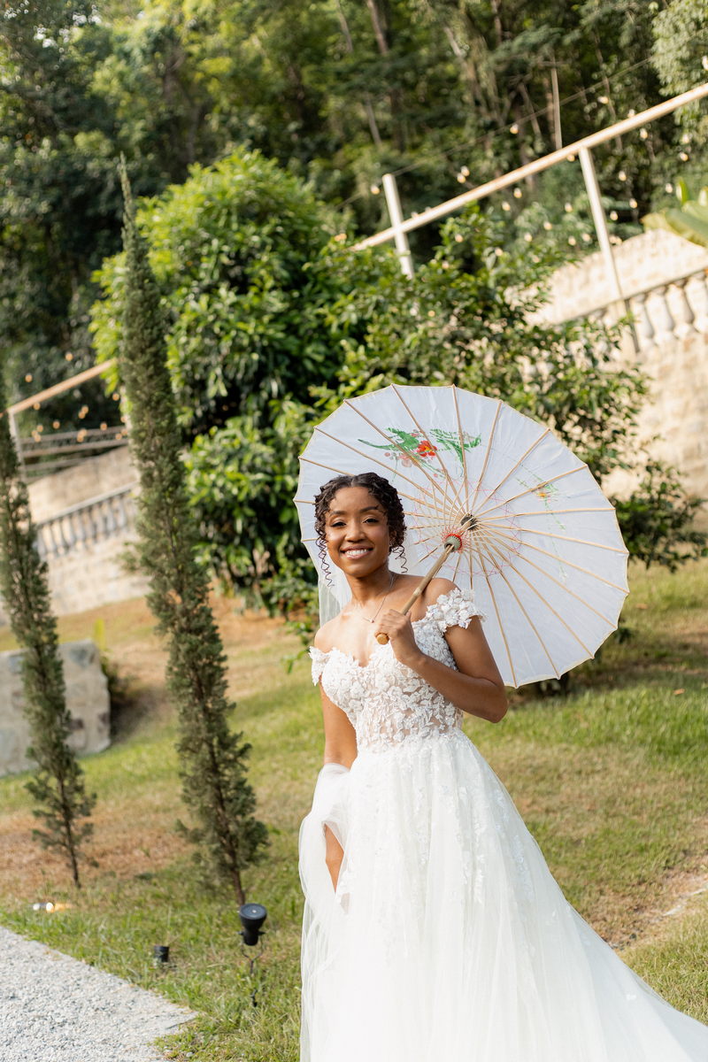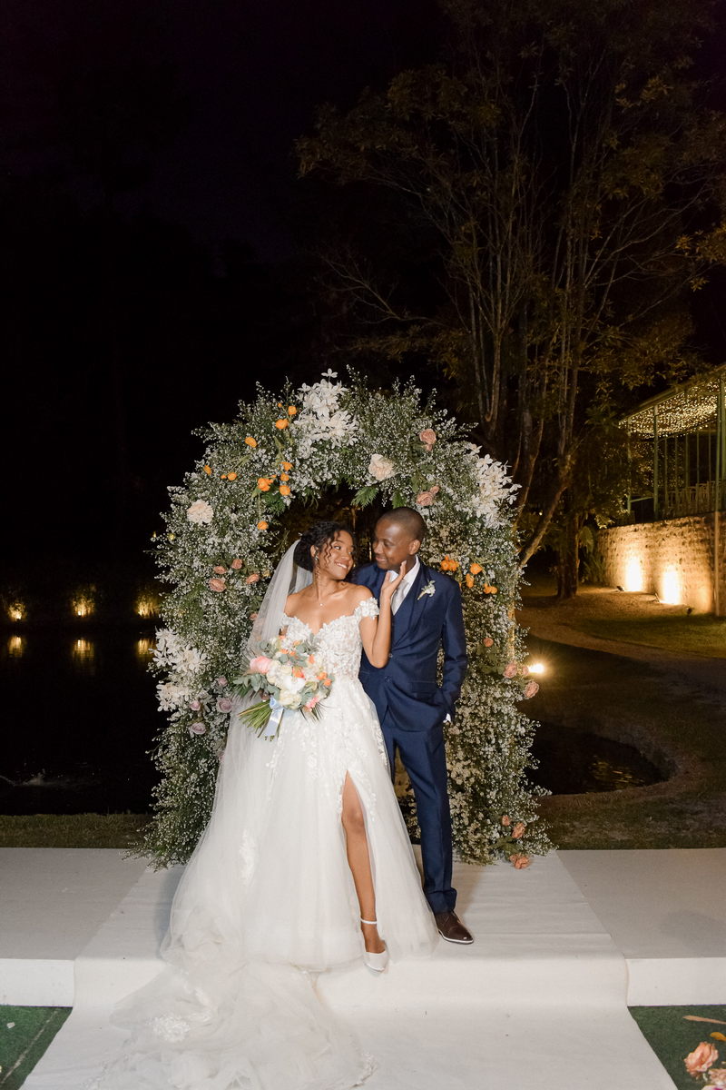 Rosana estava deslumbrante em seu vestido de noiva Internovias. O modelo com decote ombro a ombro, adornado por mangas delicadas, realçou seu colo de forma suave e sofisticada. A parte superior do vestido, ricamente bordada com aplicações florais em relevo, trouxe um toque de delicadeza. A saia volumosa em tule, com discreta fenda, criou um movimento encantador, perfeito para um casamento à beira do lago.