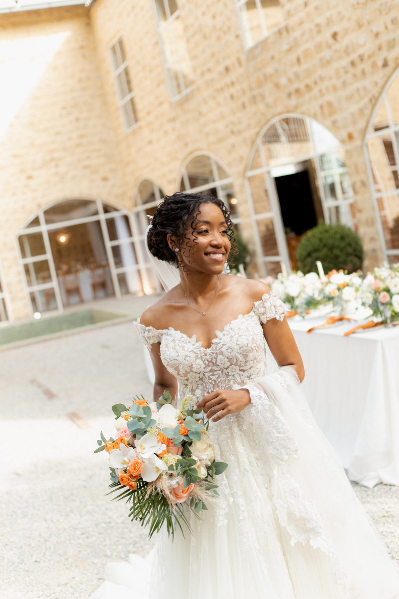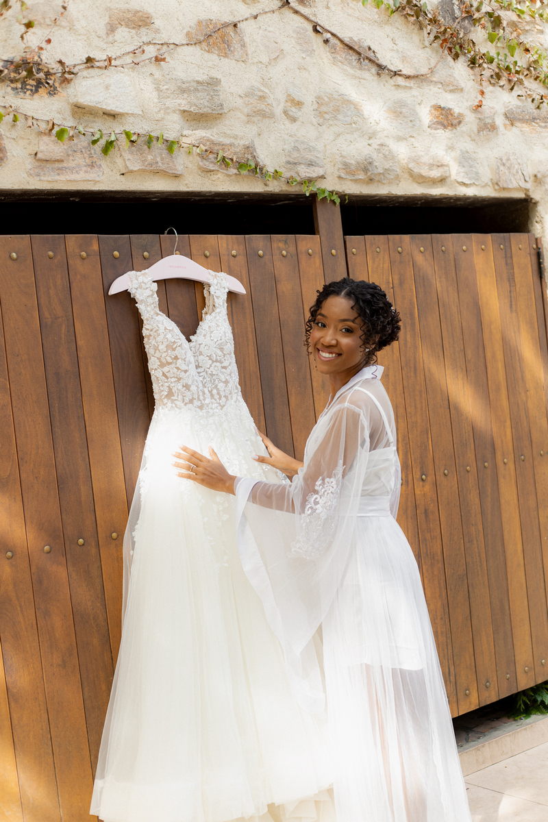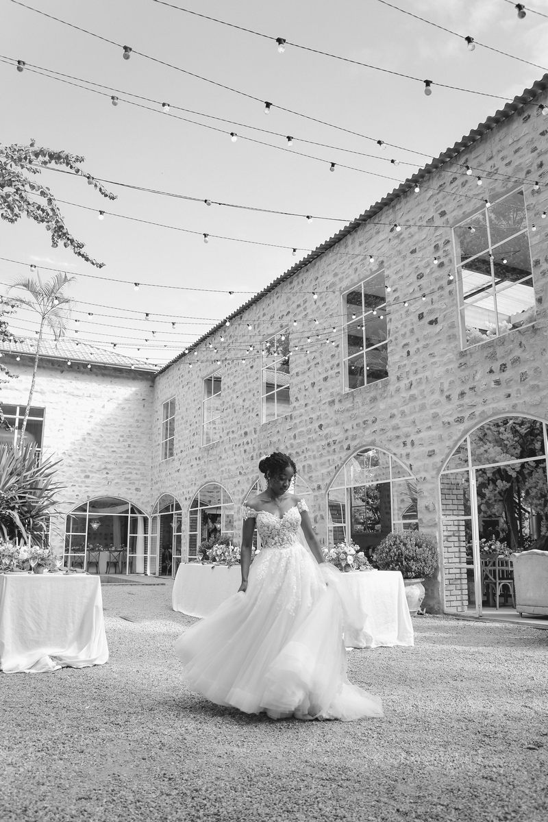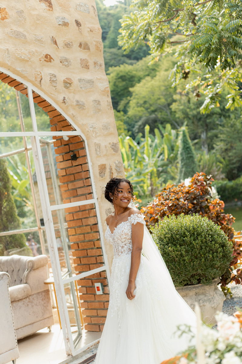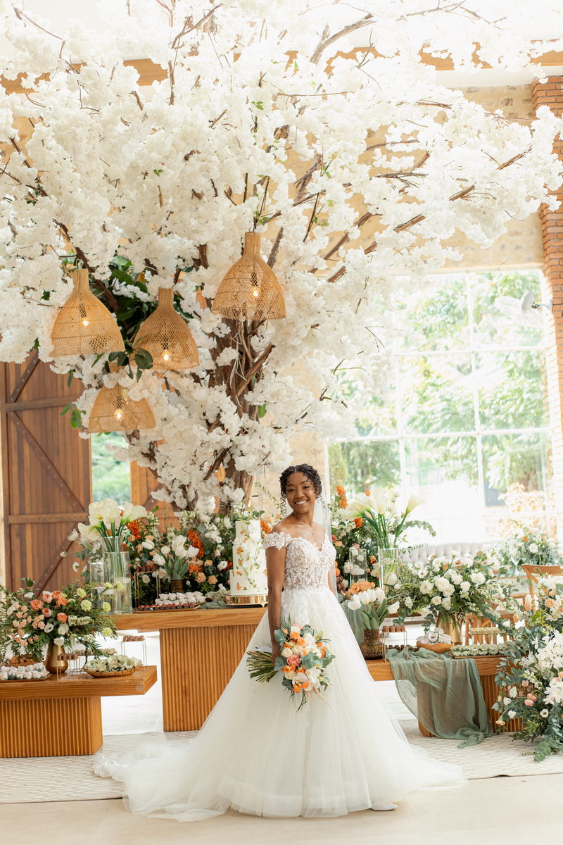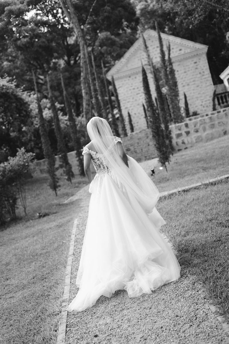 Rosana estava deslumbrante em seu vestido de noiva Internovias. O modelo com decote ombro a ombro, adornado por mangas delicadas, realçou seu colo de forma suave e sofisticada. A parte superior do vestido, ricamente bordada com aplicações florais em relevo, trouxe um toque de delicadeza. A saia volumosa em tule, com discreta fenda, criou um movimento encantador, perfeito para um casamento à beira do lago.