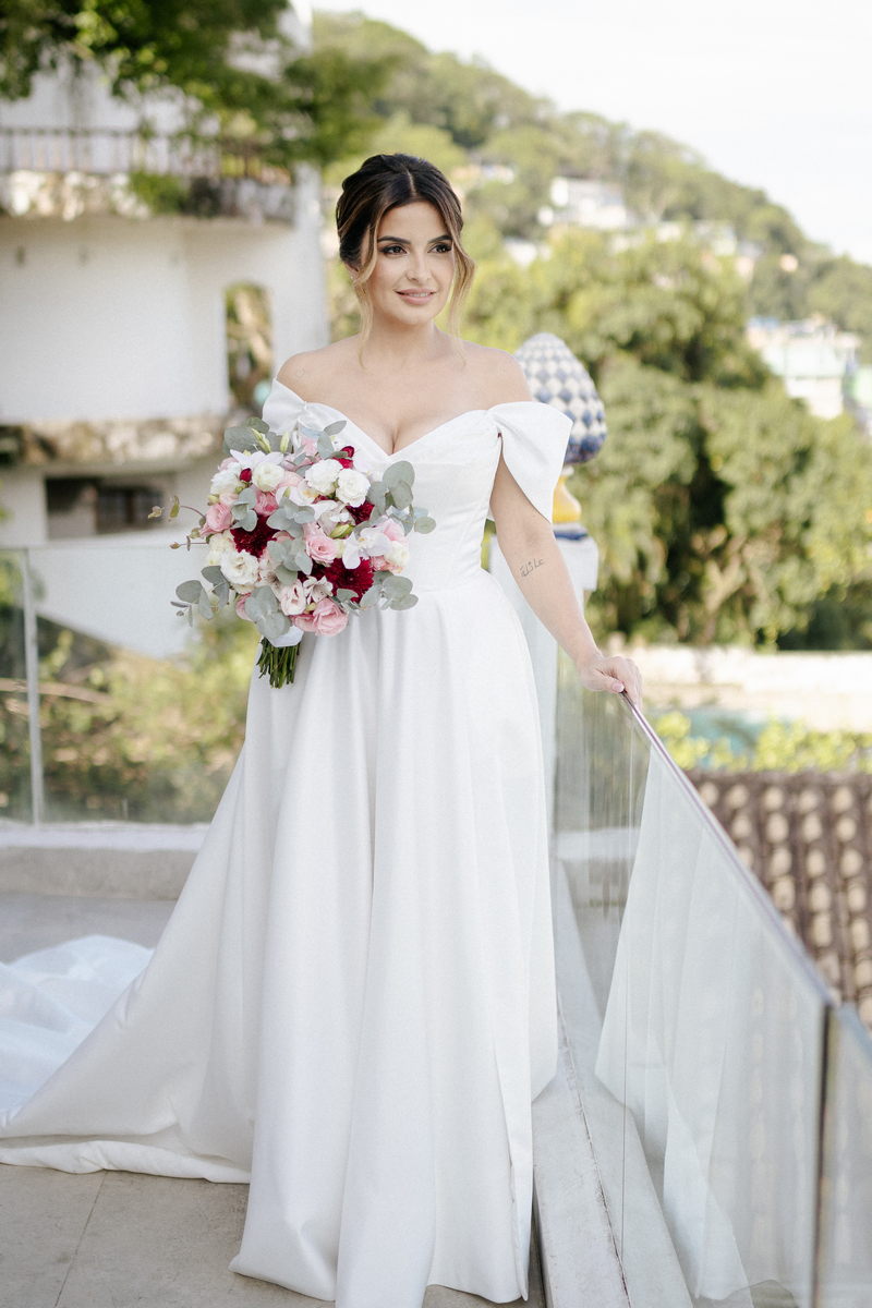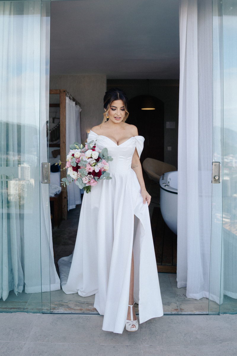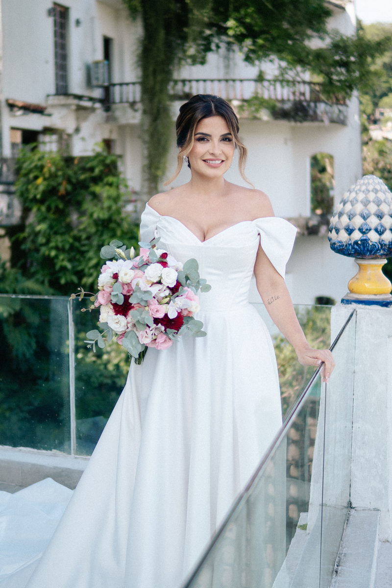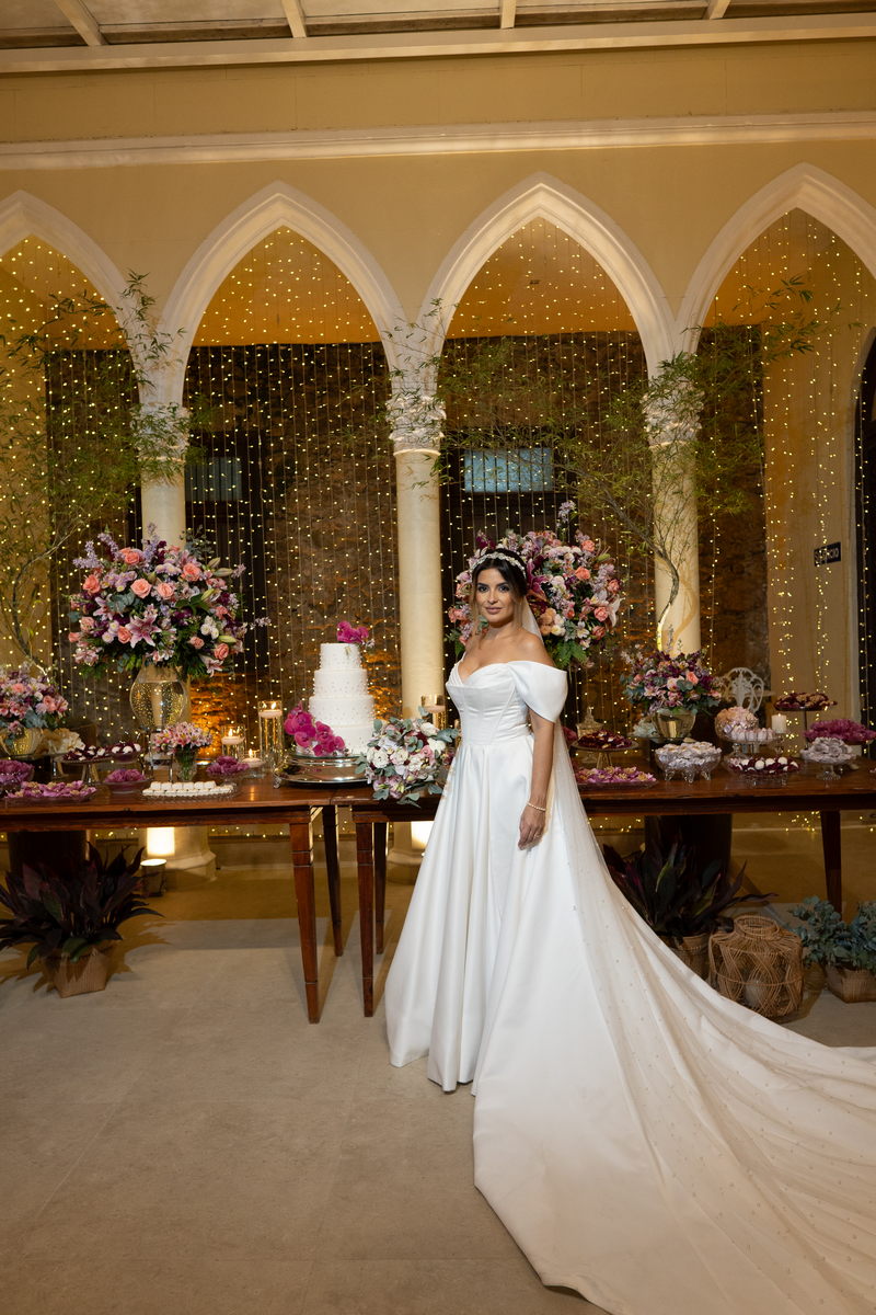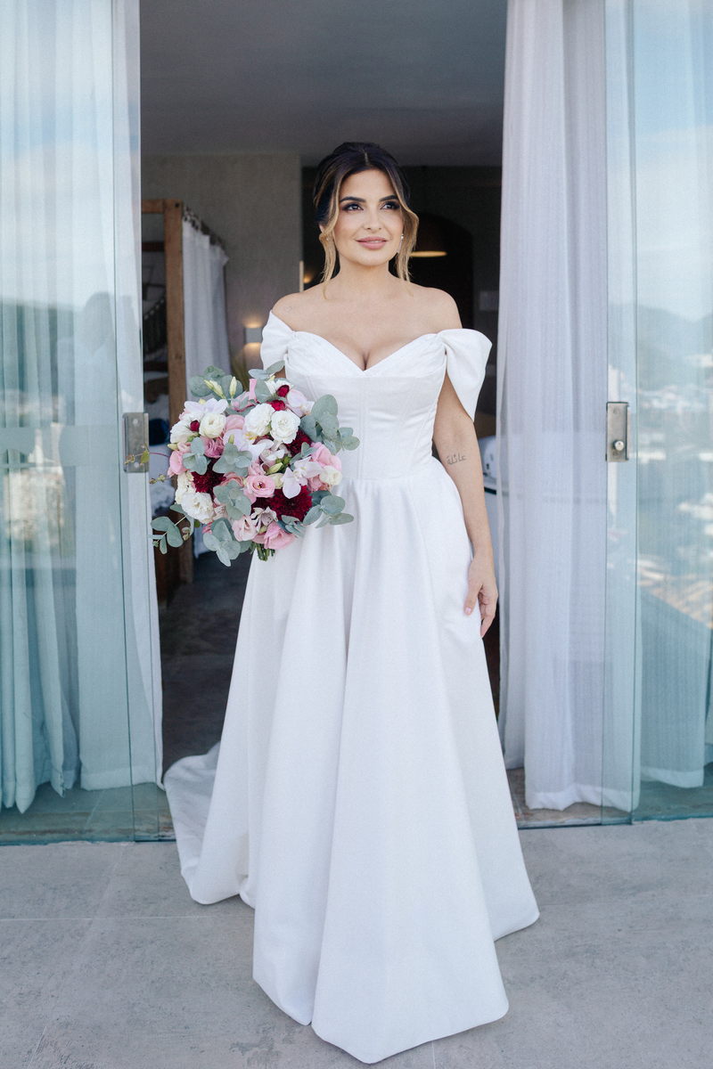 Isabella encantou todos os convidados ao surgir com seu vestido de noiva Internovias, que combinava perfeitamente tradição e contemporaneidade. O modelo minimalista com seu sofisticado decote ombro a ombro, complementado por mangas delicadas trouxe um toque de romantismo. Já a silhueta clássica em A, com a cintura delicadamente marcada valorizou suas curvas, enquanto a saia com com belíssima fenda tornou o seu andar até o altar ainda mais inesquecível. A beleza da noiva ficou por conta da talentosa @carolinemonnerat, que realçou ainda mais a elegância e delicadeza da Isabella. O look equilibrou perfeitamente sofisticação e leveza, ideal para cerimônias como essa, que celebravam o amor em sua forma mais pura.