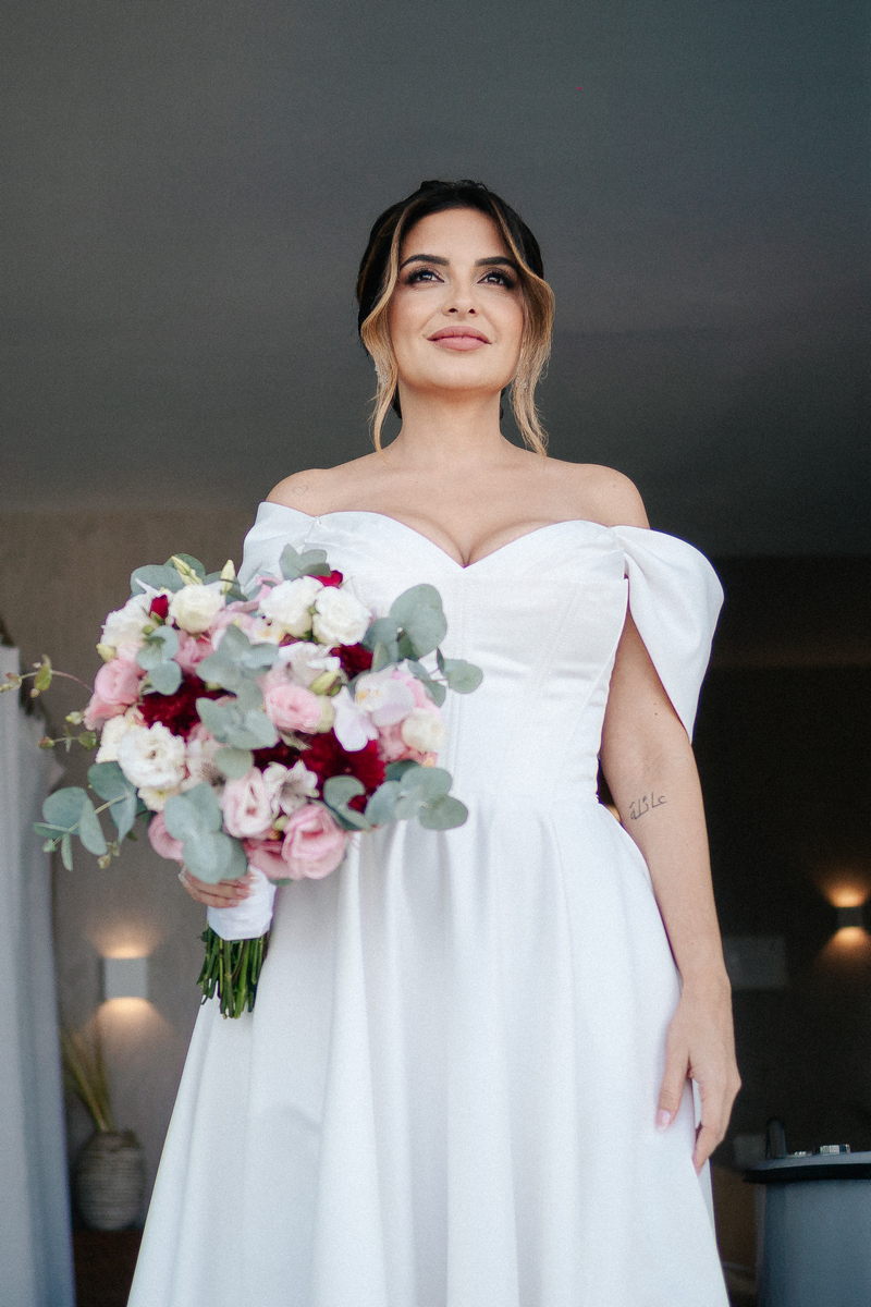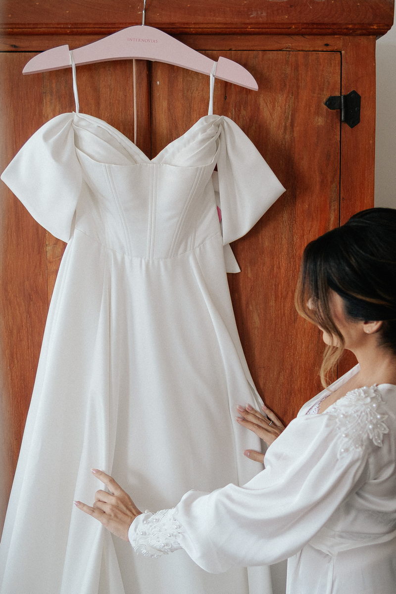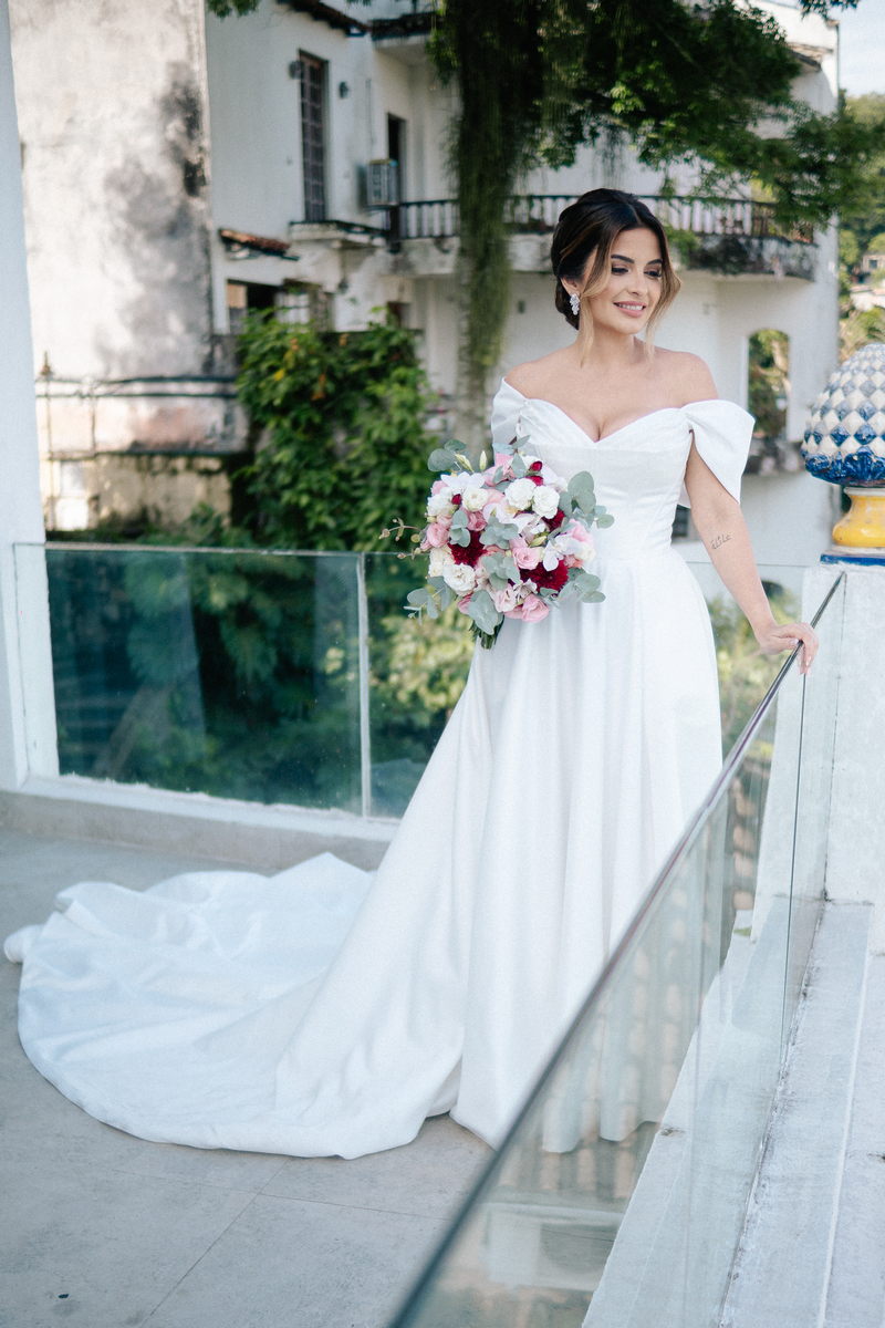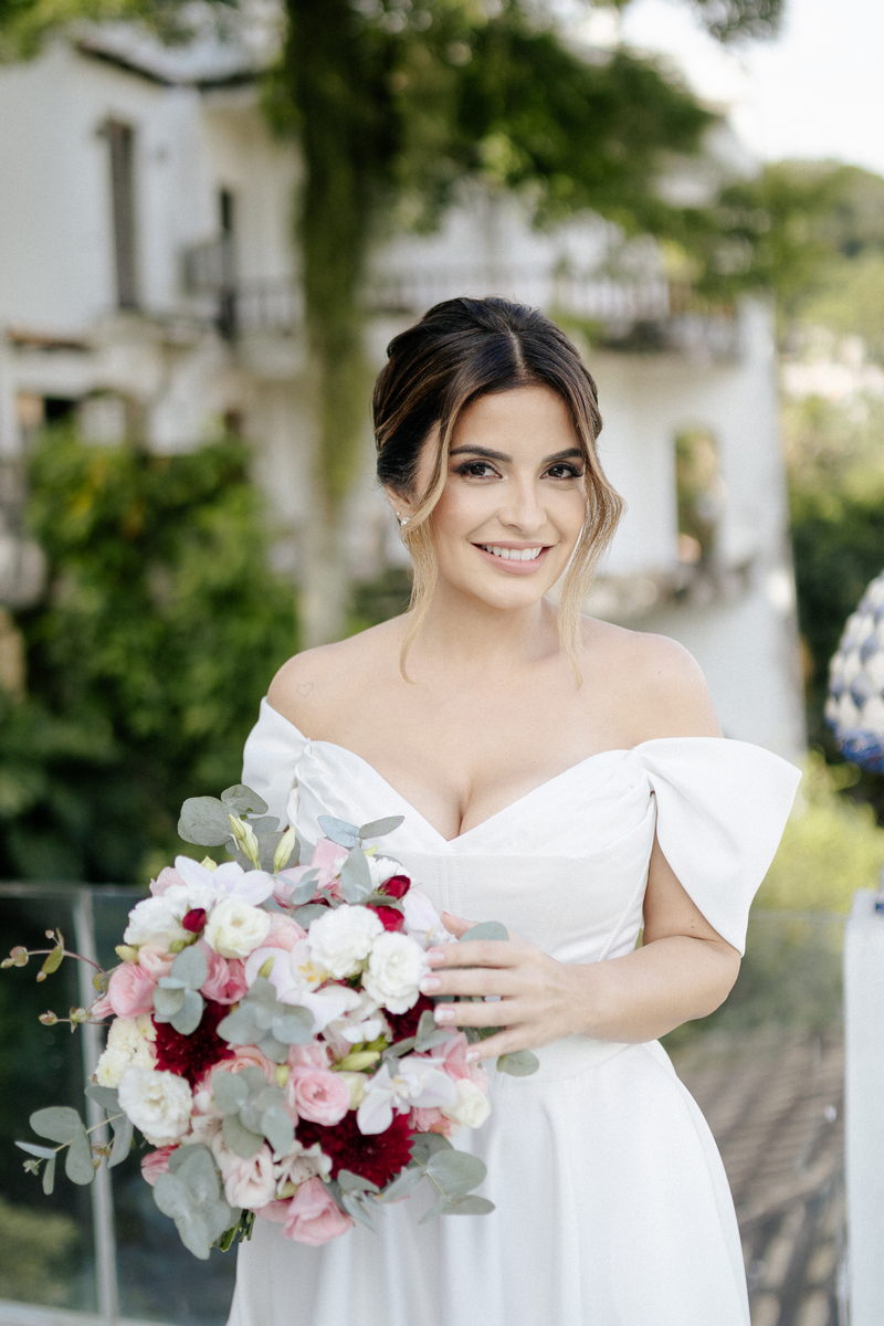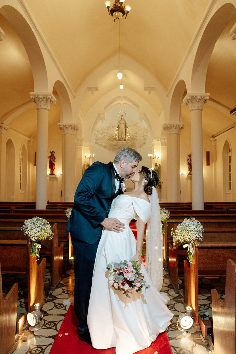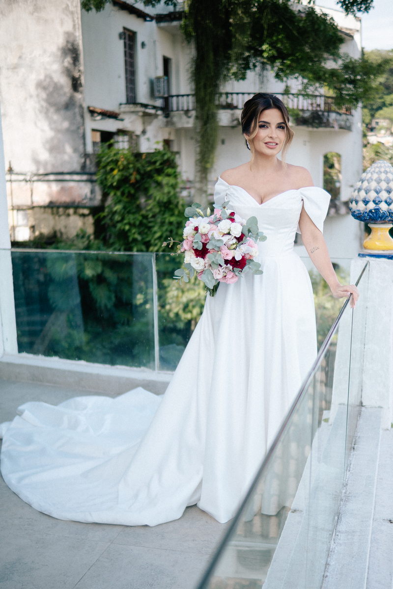 Isabella encantou todos os convidados ao surgir com seu vestido de noiva Internovias, que combinava perfeitamente tradição e contemporaneidade. O modelo minimalista com seu sofisticado decote ombro a ombro, complementado por mangas delicadas trouxe um toque de romantismo. Já a silhueta clássica em A, com a cintura delicadamente marcada valorizou suas curvas, enquanto a saia com com belíssima fenda tornou o seu andar até o altar ainda mais inesquecível. A beleza da noiva ficou por conta da talentosa @carolinemonnerat, que realçou ainda mais a elegância e delicadeza da Isabella. O look equilibrou perfeitamente sofisticação e leveza, ideal para cerimônias como essa, que celebravam o amor em sua forma mais pura.