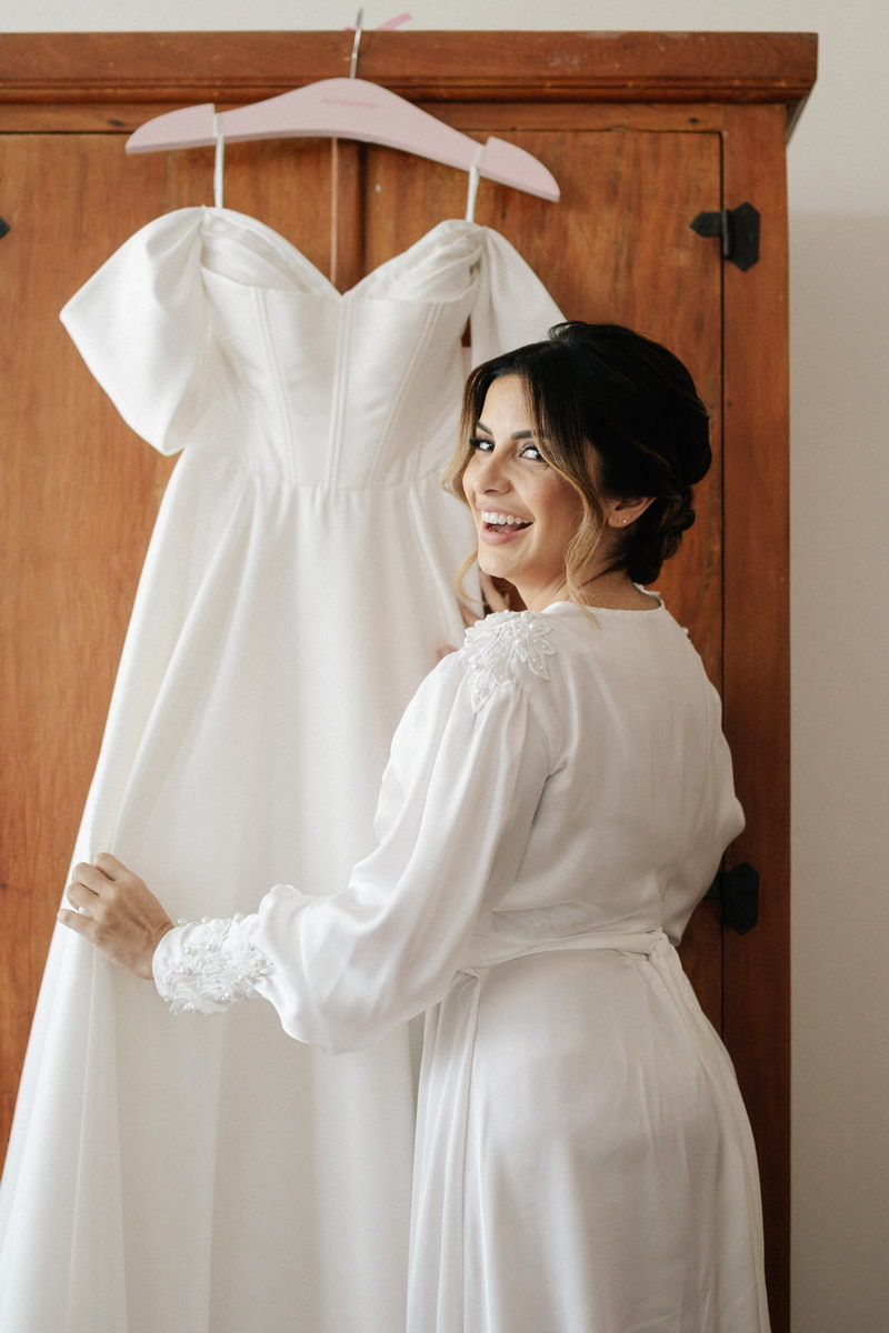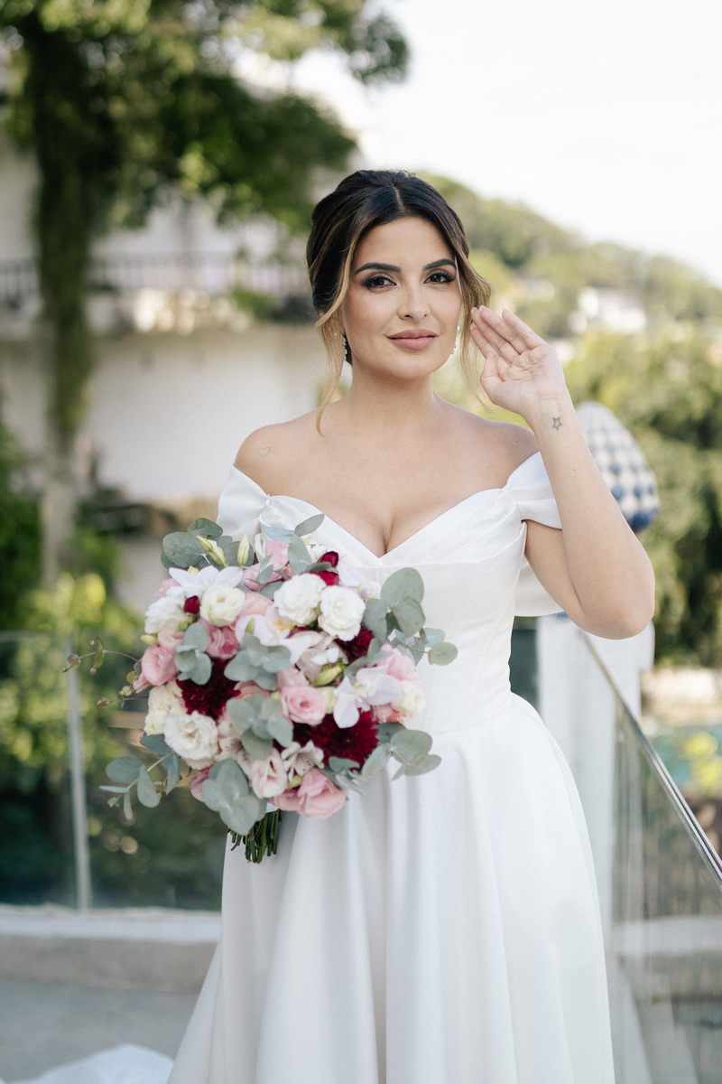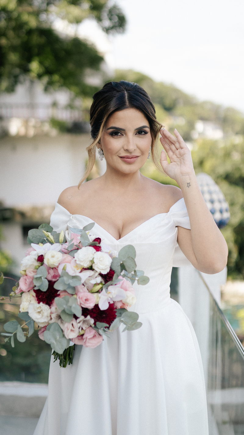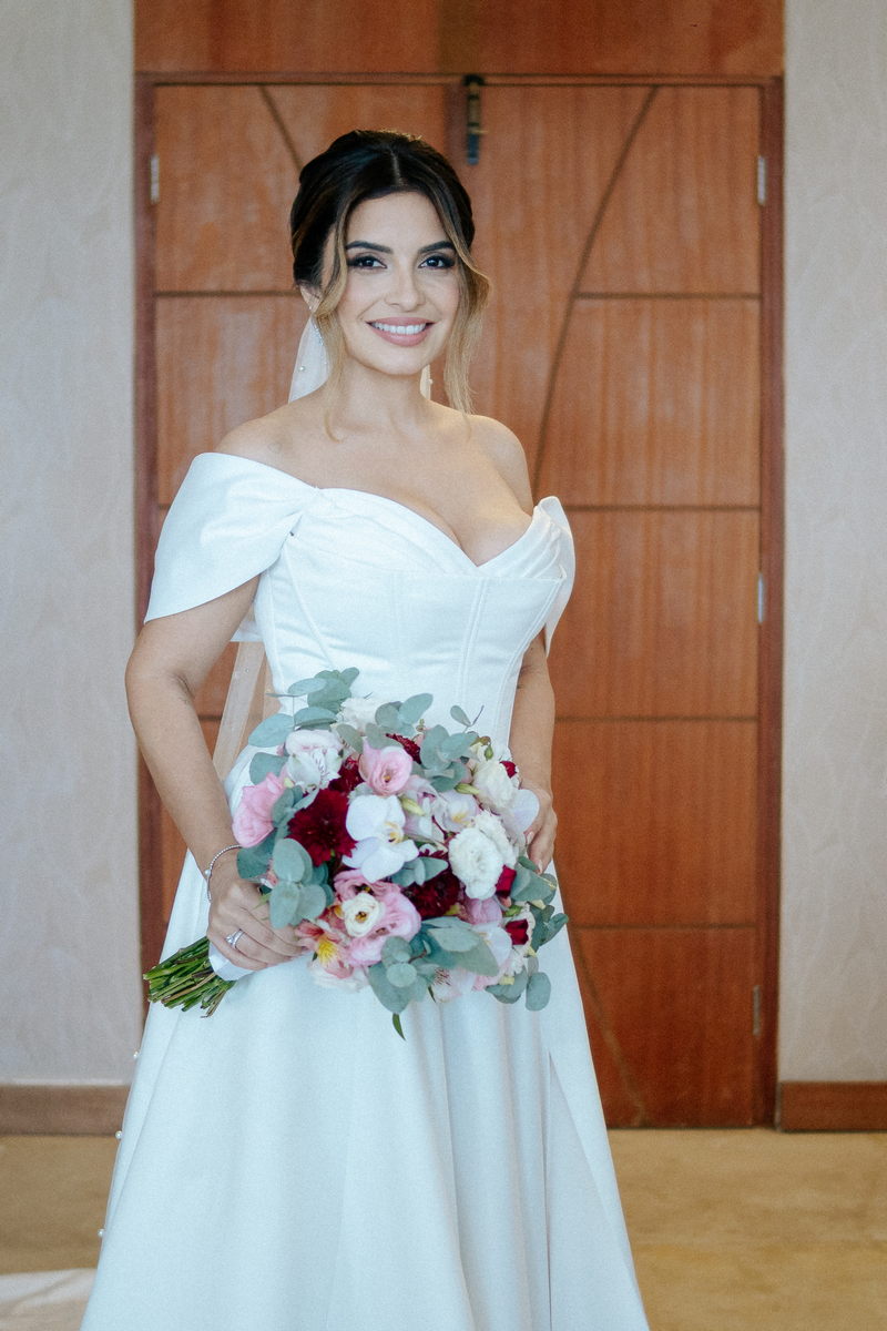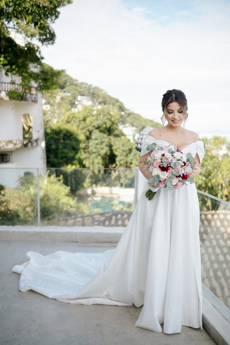 Isabella encantou todos os convidados ao surgir com seu vestido de noiva Internovias, que combinava perfeitamente tradição e contemporaneidade. O modelo minimalista com seu sofisticado decote ombro a ombro, complementado por mangas delicadas trouxe um toque de romantismo. Já a silhueta clássica em A, com a cintura delicadamente marcada valorizou suas curvas, enquanto a saia com com belíssima fenda tornou o seu andar até o altar ainda mais inesquecível. A beleza da noiva ficou por conta da talentosa @carolinemonnerat, que realçou ainda mais a elegância e delicadeza da Isabella. O look equilibrou perfeitamente sofisticação e leveza, ideal para cerimônias como essa, que celebravam o amor em sua forma mais pura.