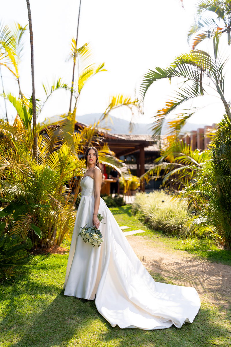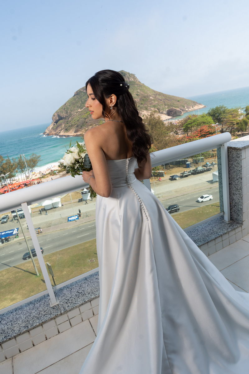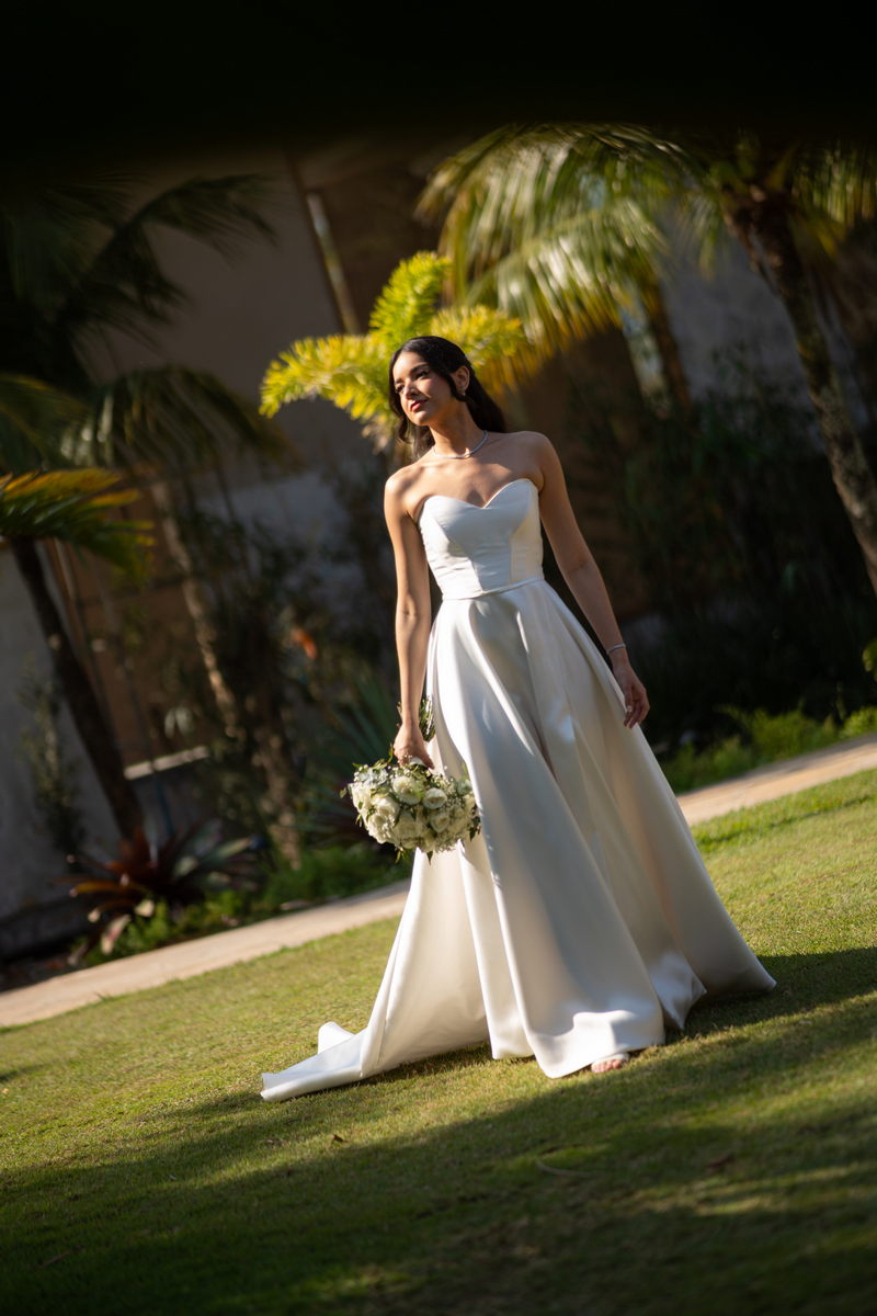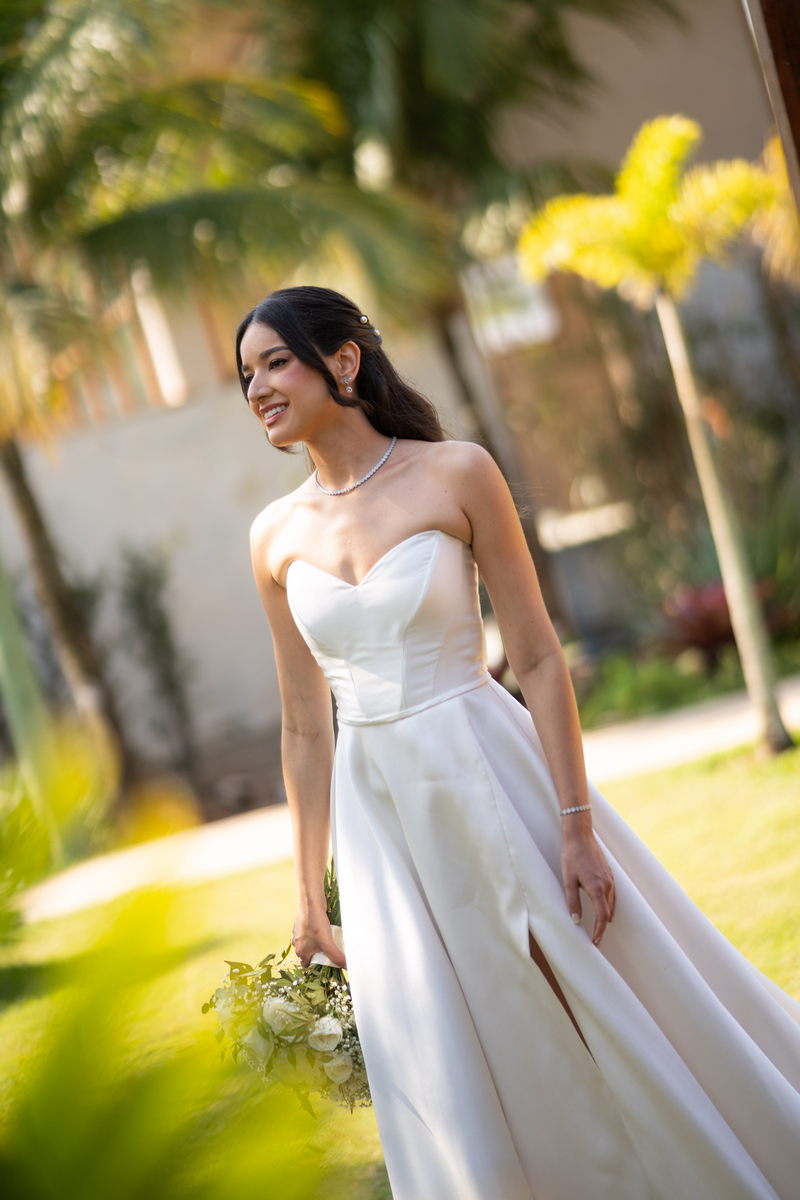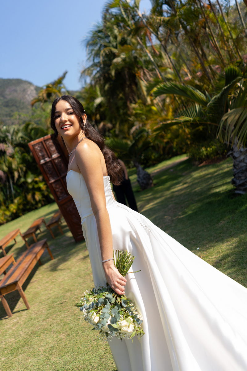 Luisa estava deslumbrante em seu vestido de noiva Internovias! Ela escolheu um modelo que representou perfeitamente a elegância atemporal: uma peça tomara que caia com decote coração, que realçou sua silhueta de maneira impecável. O tecido, delicadamente iluminado pela luz natural, trouxe um brilho sutil e encantador, enquanto a silhueta evasê conferiu um toque clássico e gracioso. O destaque ficou por conta da fenda lateral, que adicionou um ar moderno e sensual ao visual tradicional, e da cauda, que completou o look com uma sofisticação delicada.