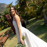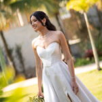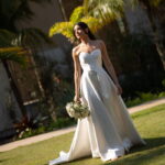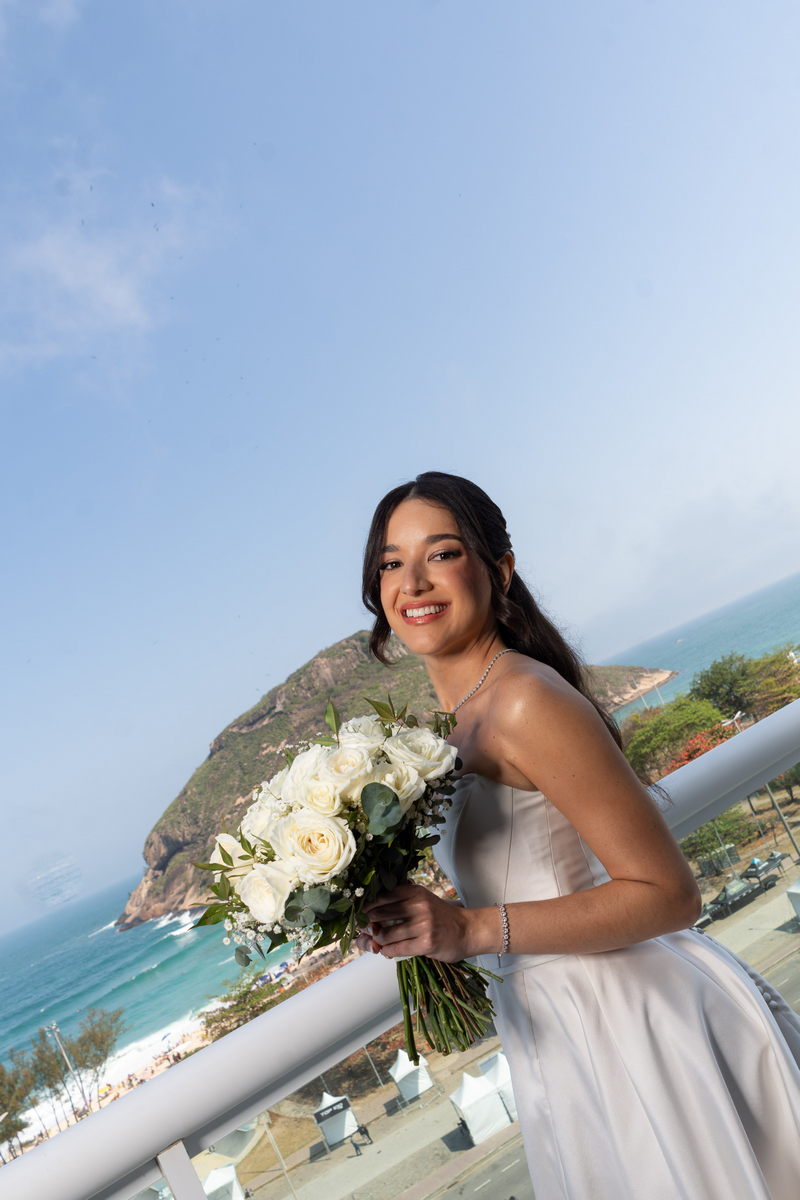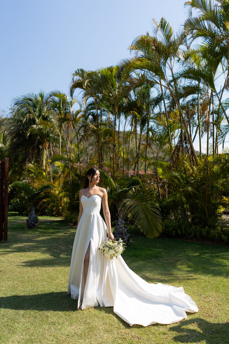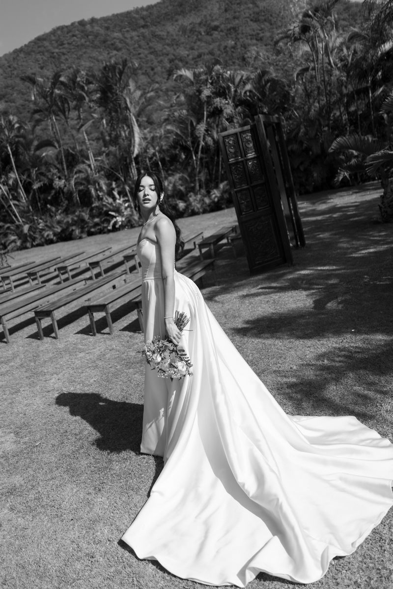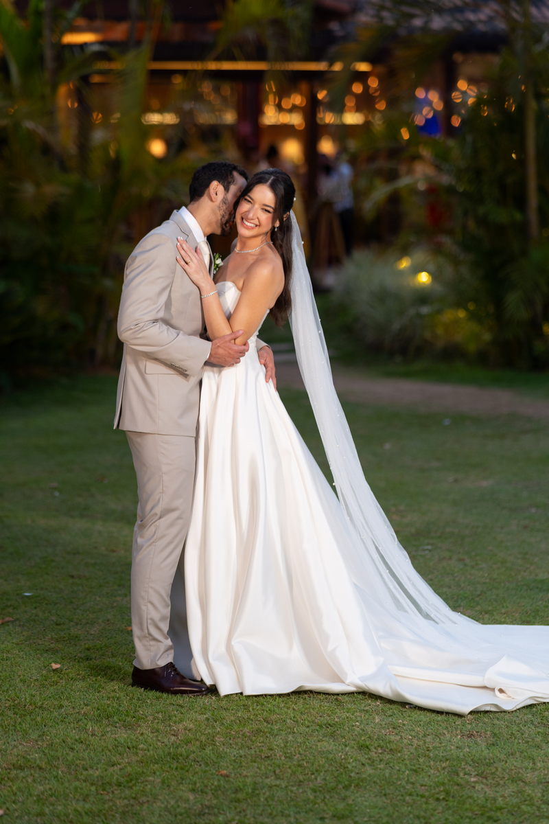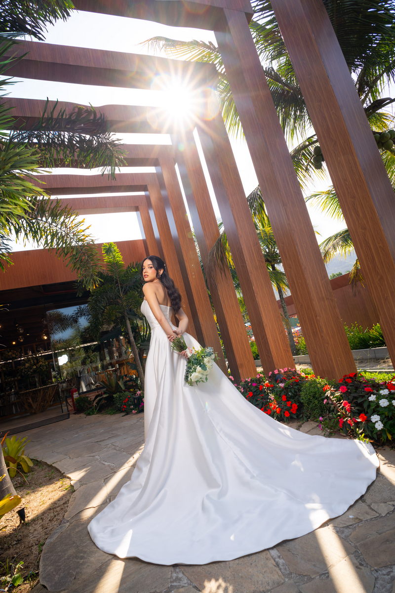 Luisa estava deslumbrante em seu vestido de noiva Internovias! Ela escolheu um modelo que representou perfeitamente a elegância atemporal: uma peça tomara que caia com decote coração, que realçou sua silhueta de maneira impecável. O tecido, delicadamente iluminado pela luz natural, trouxe um brilho sutil e encantador, enquanto a silhueta evasê conferiu um toque clássico e gracioso. O destaque ficou por conta da fenda lateral, que adicionou um ar moderno e sensual ao visual tradicional, e da cauda, que completou o look com uma sofisticação delicada.