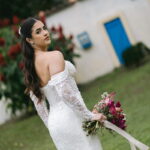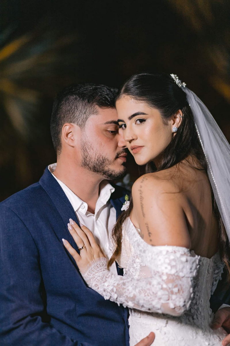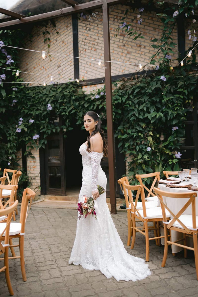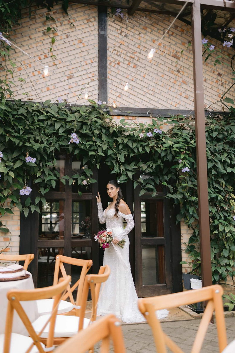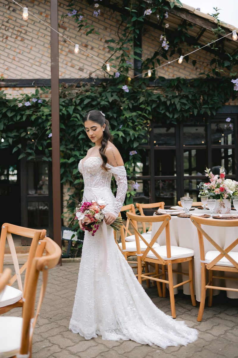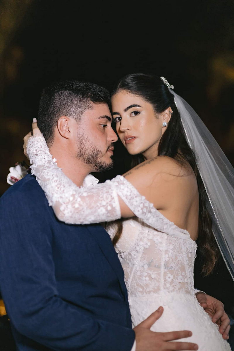 Com sua beleza radiante e sorriso encantador, Louise estava absolutamente deslumbrante neste dia especial, vestindo um modelo sereia da Internovias. O vestido de noiva, confeccionado em renda delicada, abraçou cada curva de seu corpo com perfeição. A peça apresentava um decote coração profundo e sofisticado, complementado por mangas caídas e delicadas, além de mangas longas removíveis, que criaram um visual único e elegante. A renda trabalhada por toda a peça conferiu textura e movimento, enquanto a silhueta se abria em uma cauda deslumbrante, que parecia dançar a cada passo da noiva.