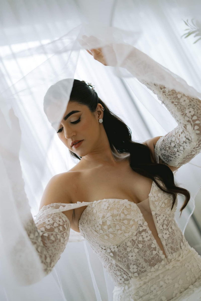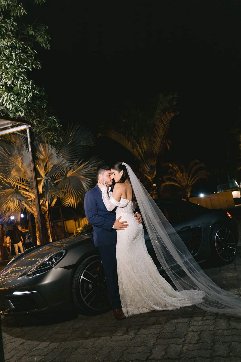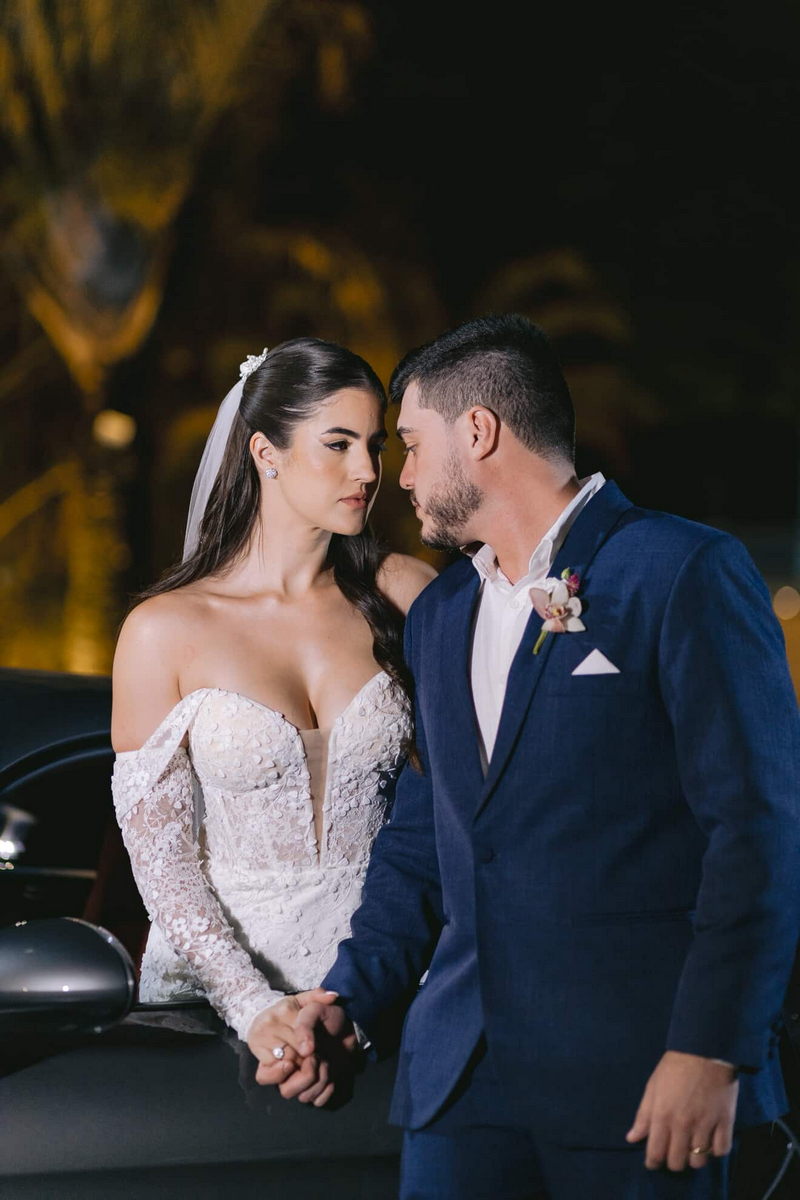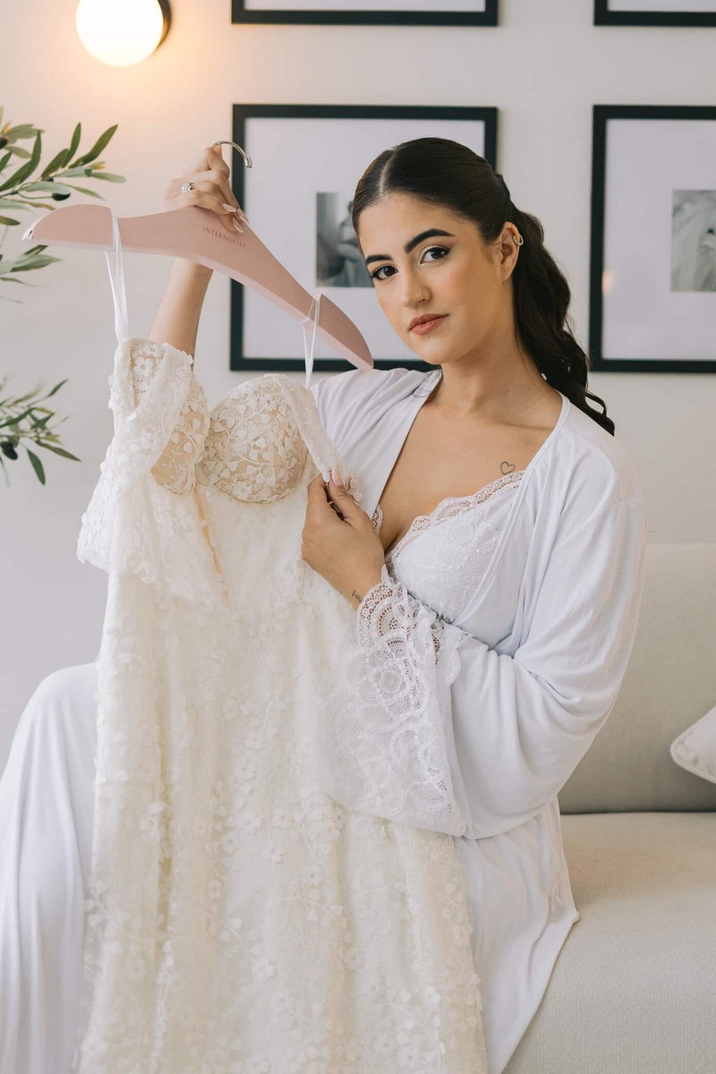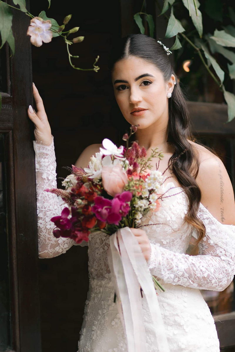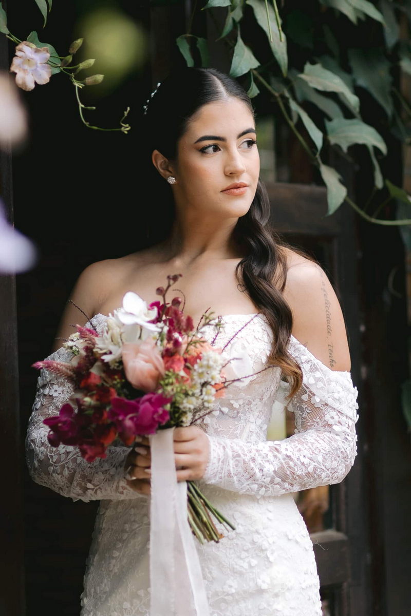 Com sua beleza radiante e sorriso encantador, Louise estava absolutamente deslumbrante neste dia especial, vestindo um modelo sereia da Internovias. O vestido de noiva, confeccionado em renda delicada, abraçou cada curva de seu corpo com perfeição. A peça apresentava um decote coração profundo e sofisticado, complementado por mangas caídas e delicadas, além de mangas longas removíveis, que criaram um visual único e elegante. A renda trabalhada por toda a peça conferiu textura e movimento, enquanto a silhueta se abria em uma cauda deslumbrante, que parecia dançar a cada passo da noiva.