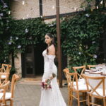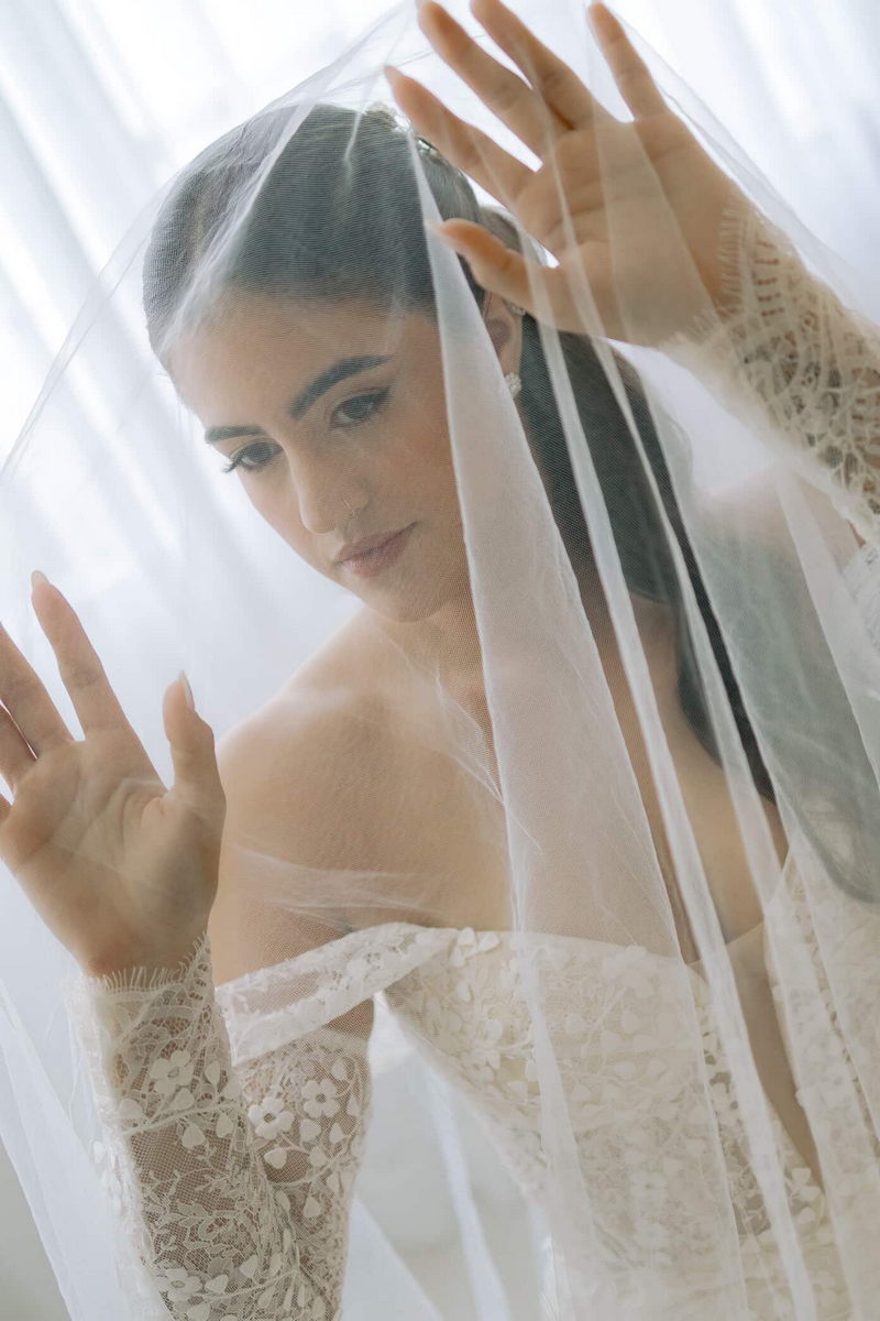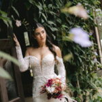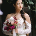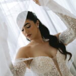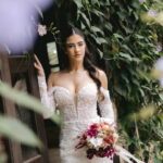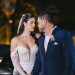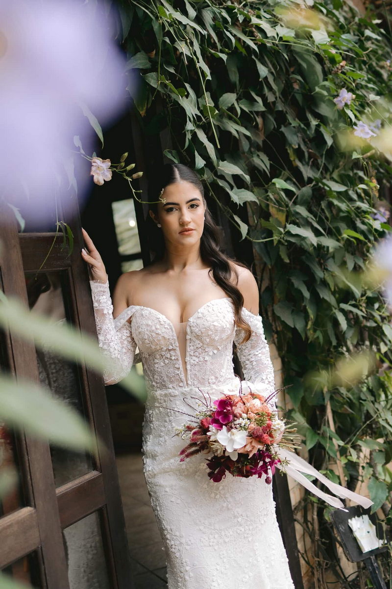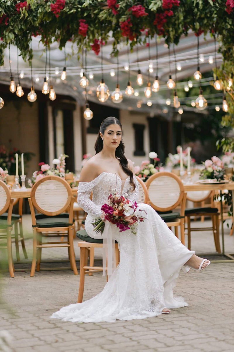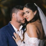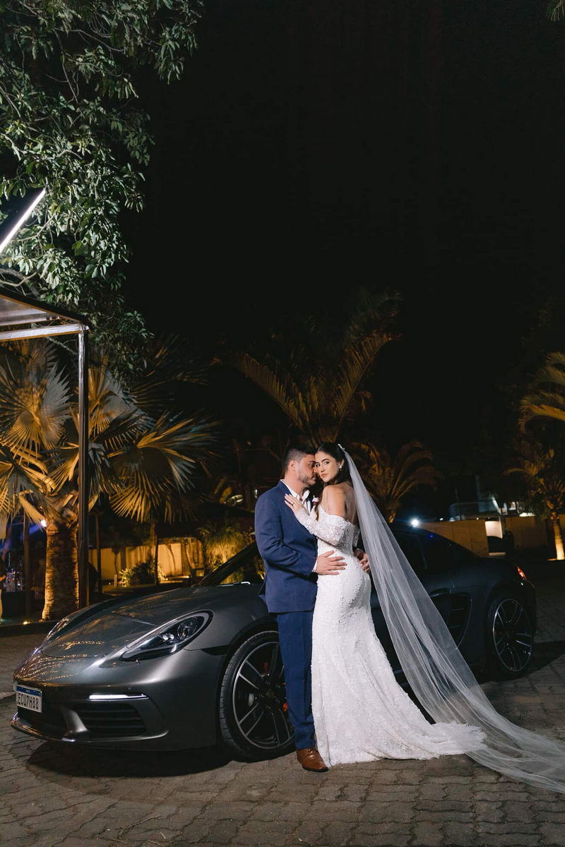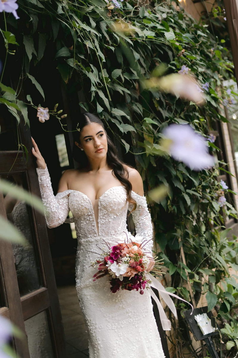 Com sua beleza radiante e sorriso encantador, Louise estava absolutamente deslumbrante neste dia especial, vestindo um modelo sereia da Internovias. O vestido de noiva, confeccionado em renda delicada, abraçou cada curva de seu corpo com perfeição. A peça apresentava um decote coração profundo e sofisticado, complementado por mangas caídas e delicadas, além de mangas longas removíveis, que criaram um visual único e elegante. A renda trabalhada por toda a peça conferiu textura e movimento, enquanto a silhueta se abria em uma cauda deslumbrante, que parecia dançar a cada passo da noiva.