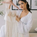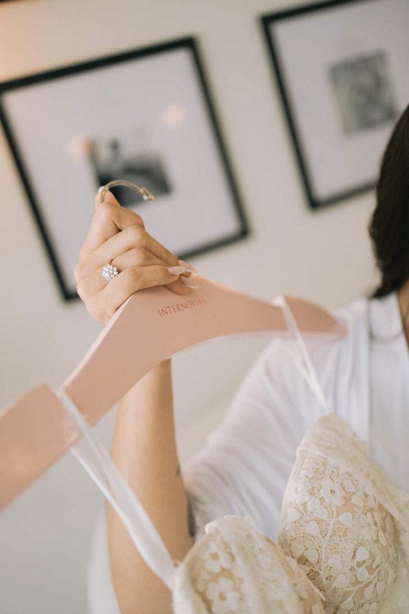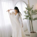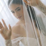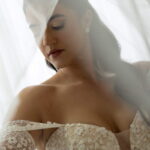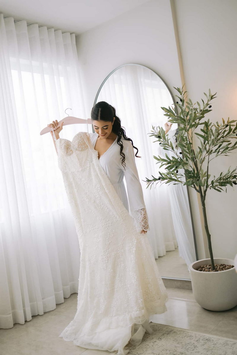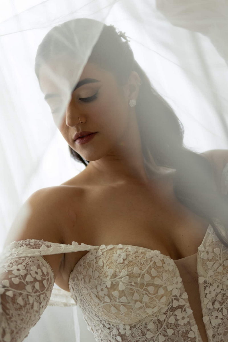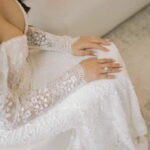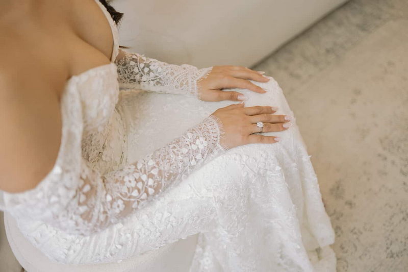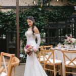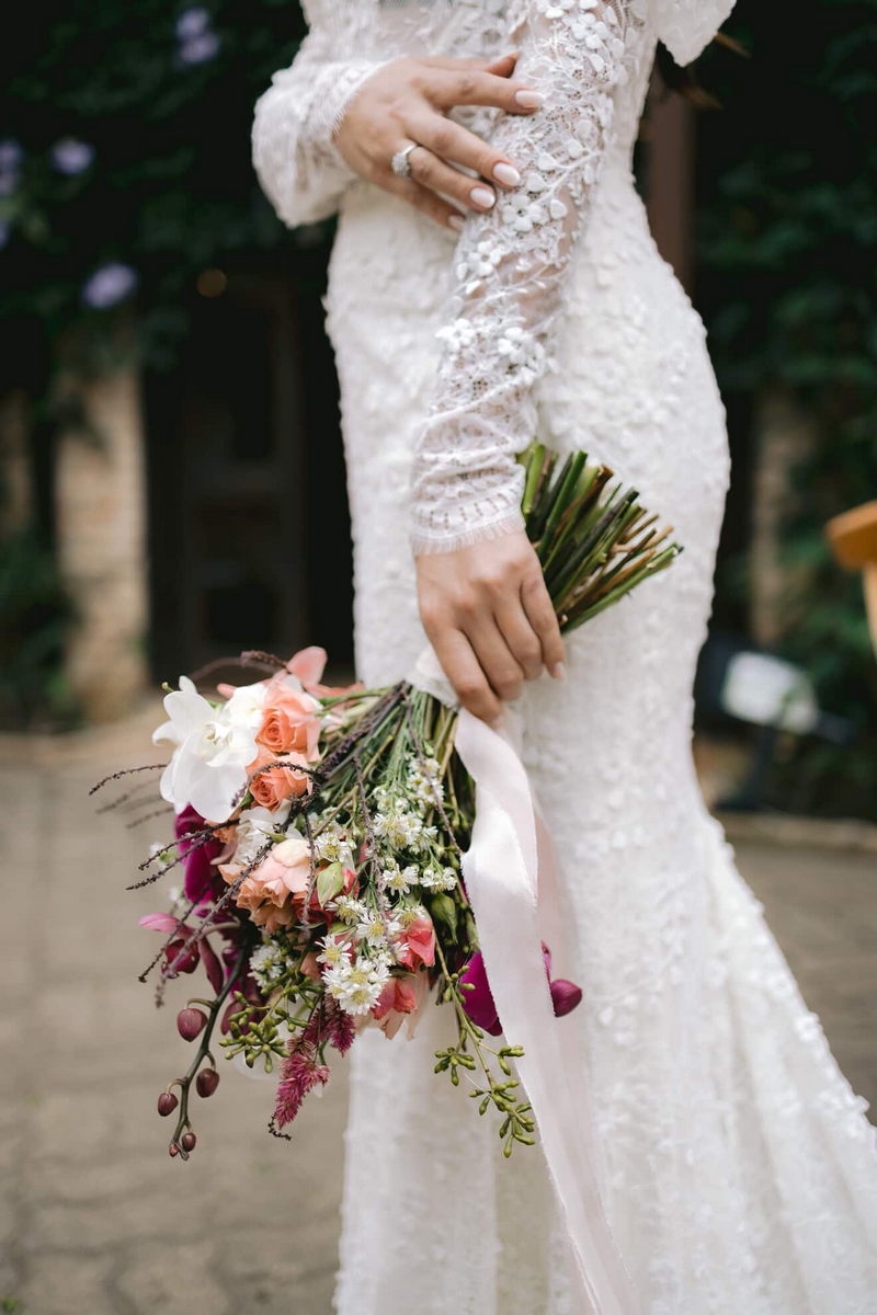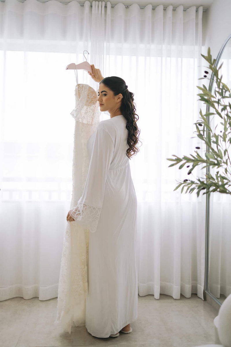 Com sua beleza radiante e sorriso encantador, Louise estava absolutamente deslumbrante neste dia especial, vestindo um modelo sereia da Internovias. O vestido de noiva, confeccionado em renda delicada, abraçou cada curva de seu corpo com perfeição. A peça apresentava um decote coração profundo e sofisticado, complementado por mangas caídas e delicadas, além de mangas longas removíveis, que criaram um visual único e elegante. A renda trabalhada por toda a peça conferiu textura e movimento, enquanto a silhueta se abria em uma cauda deslumbrante, que parecia dançar a cada passo da noiva.