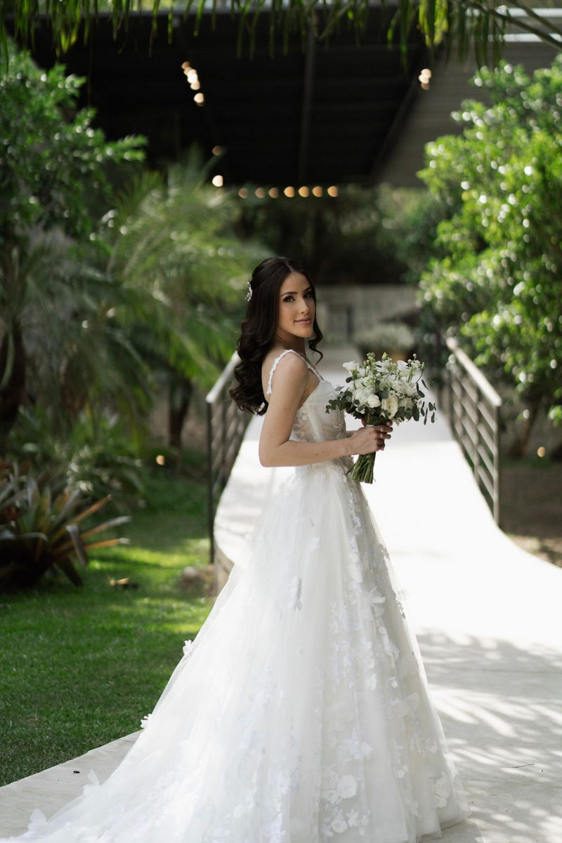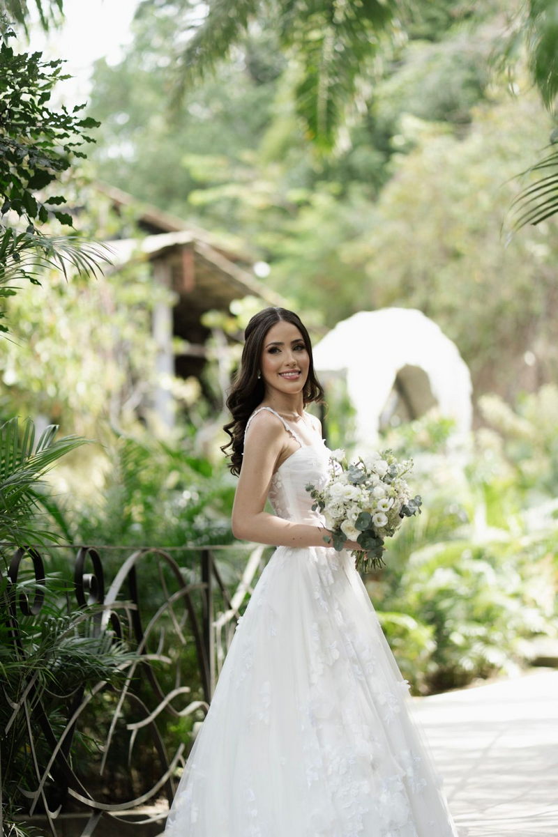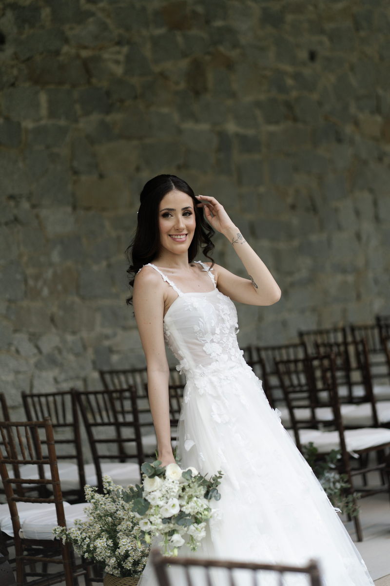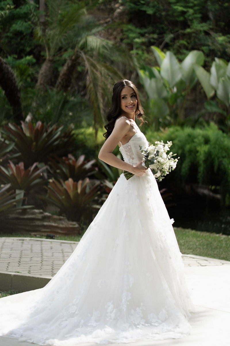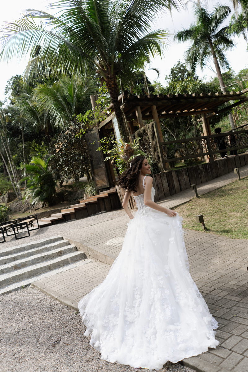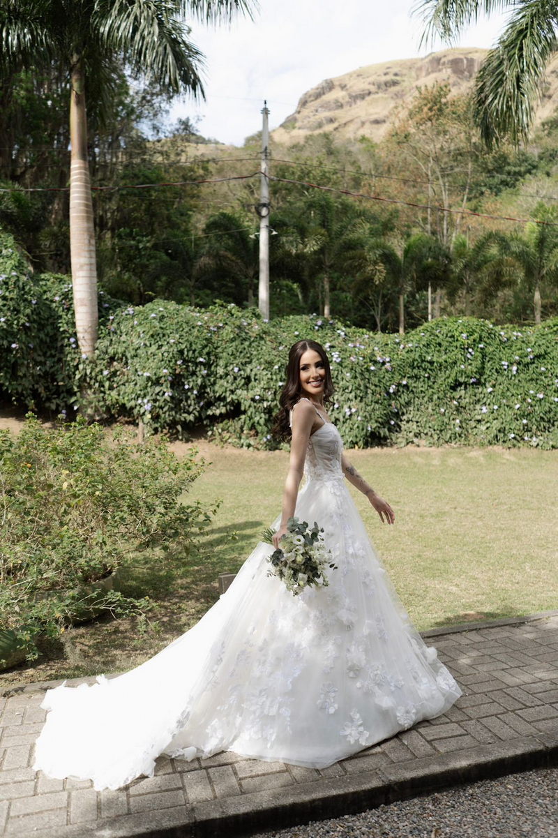 Victoria estava deslumbrante: seu sorriso natural e o brilho no olhar revelavam a felicidade de quem vive um dos dias mais especiais da vida. O vestido de noiva Internovias escolhido por ela era uma verdadeira obra de delicadeza e sofisticação. A peça apresentava aplicações tridimensionais que cobriam toda a extensão do vestido, criando um padrão romântico que dialogava perfeitamente com o cenário natural. Sua linda cauda finalizava o modelo de forma ainda mais encantadora.