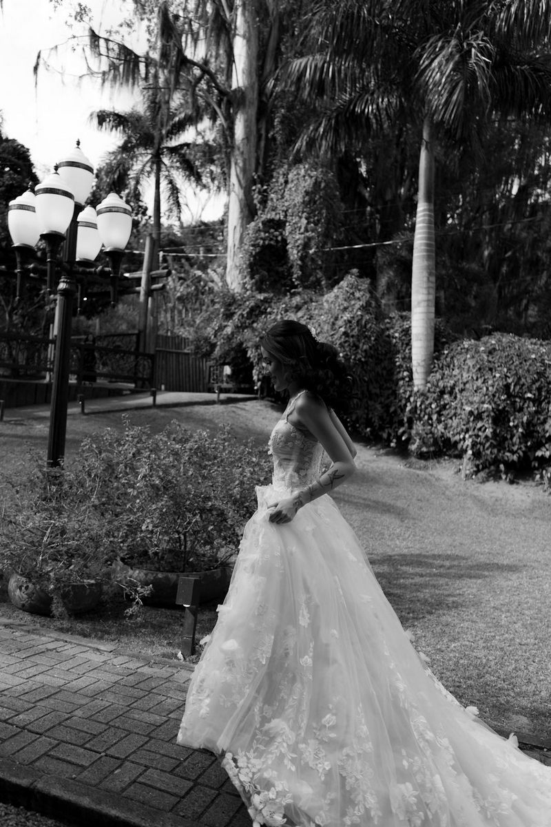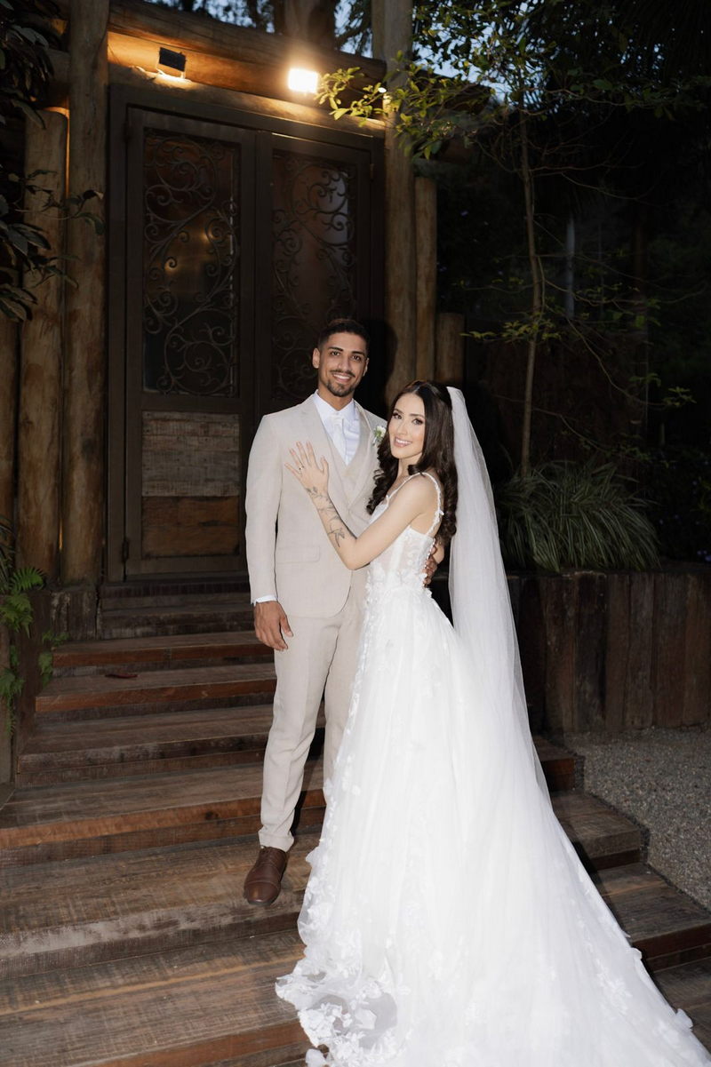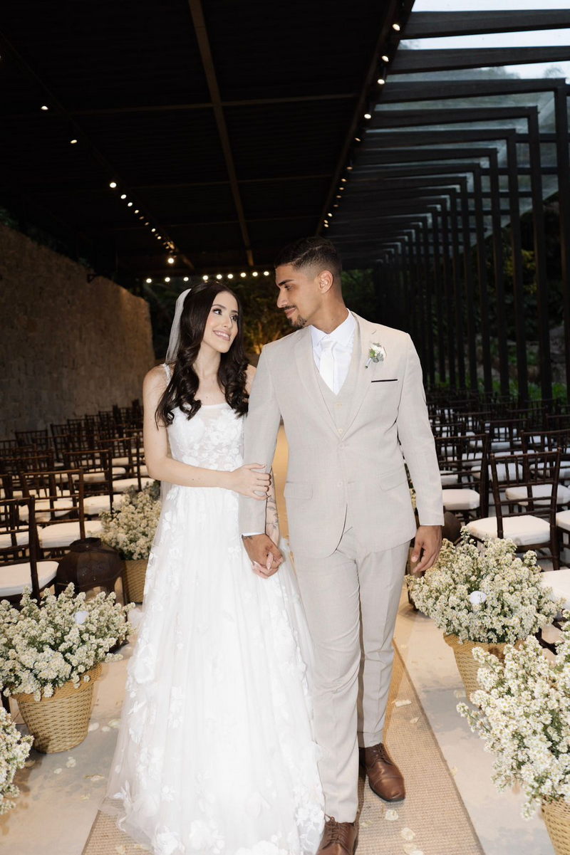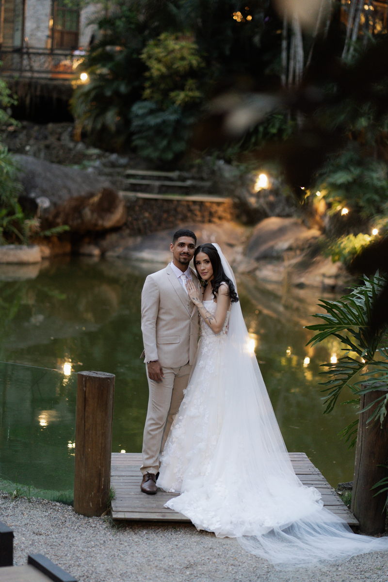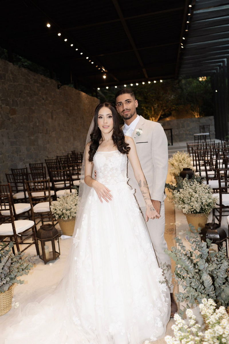 Victoria estava deslumbrante: seu sorriso natural e o brilho no olhar revelavam a felicidade de quem vive um dos dias mais especiais da vida. O vestido de noiva Internovias escolhido por ela era uma verdadeira obra de delicadeza e sofisticação. A peça apresentava aplicações tridimensionais que cobriam toda a extensão do vestido, criando um padrão romântico que dialogava perfeitamente com o cenário natural. Sua linda cauda finalizava o modelo de forma ainda mais encantadora.