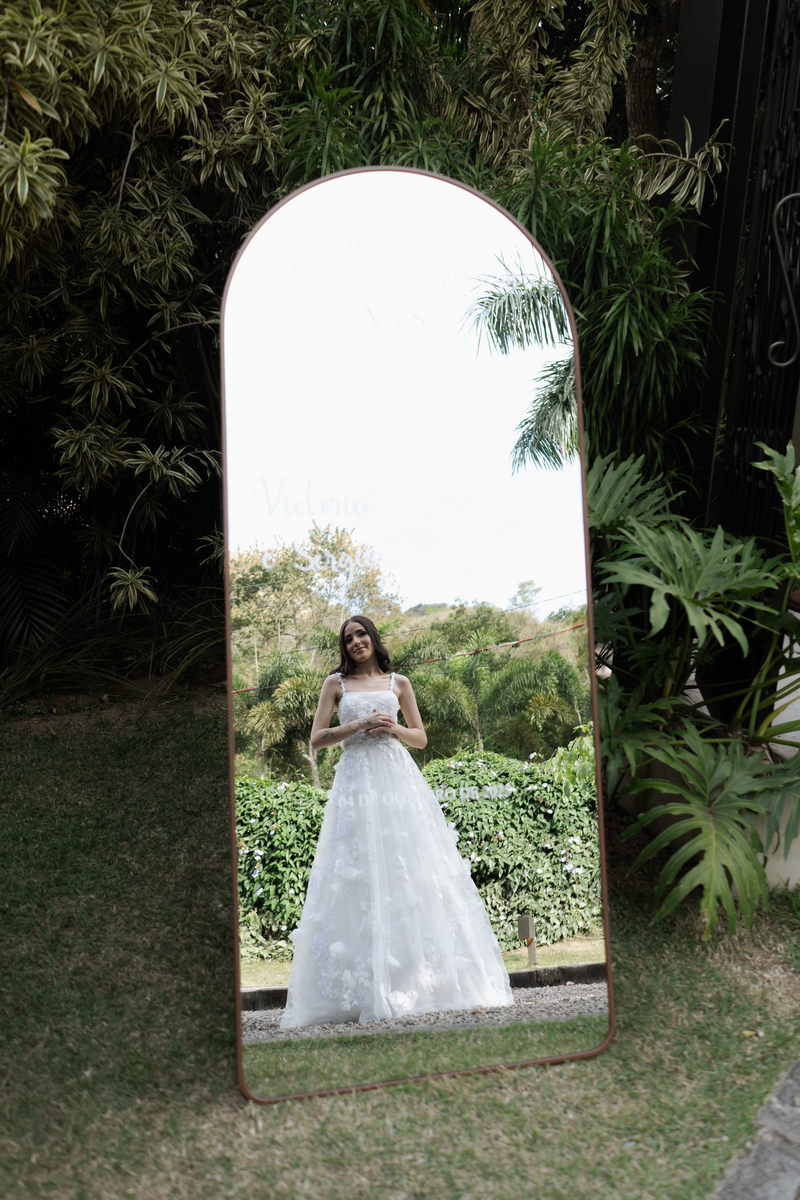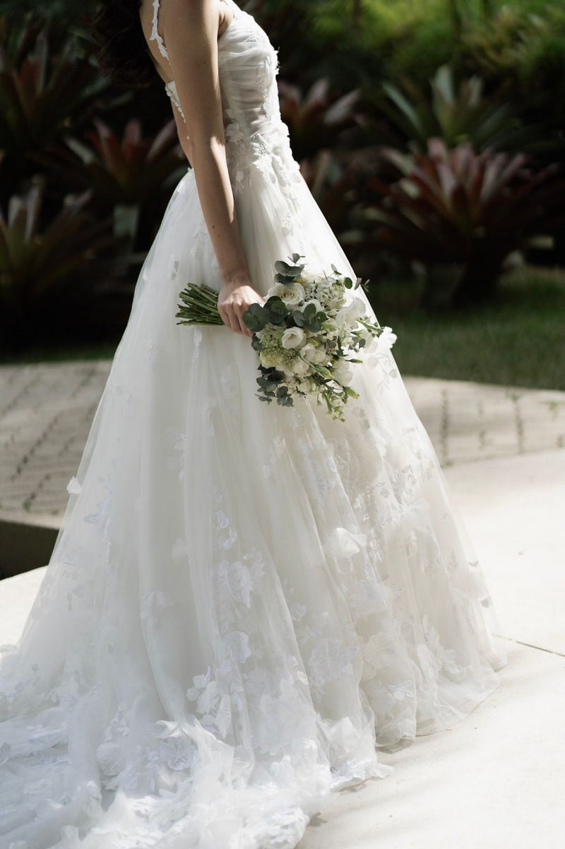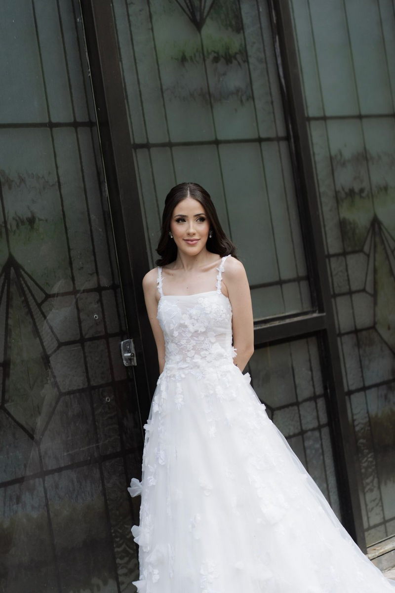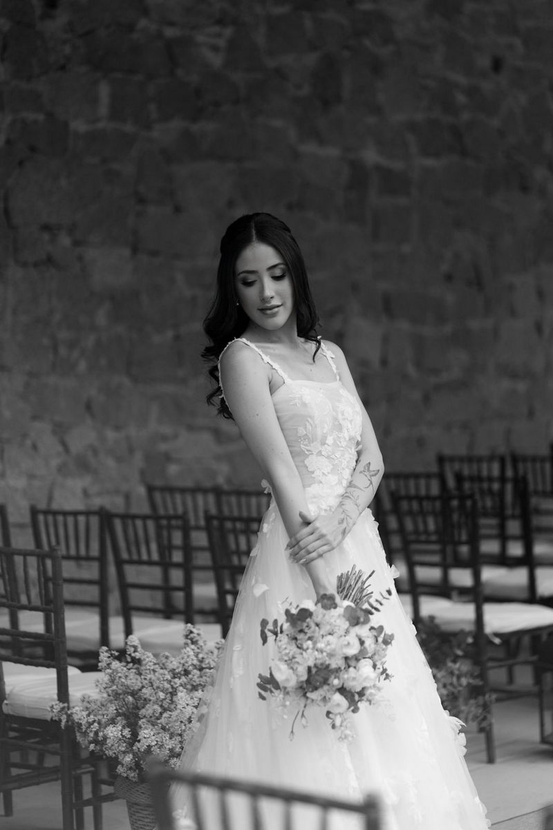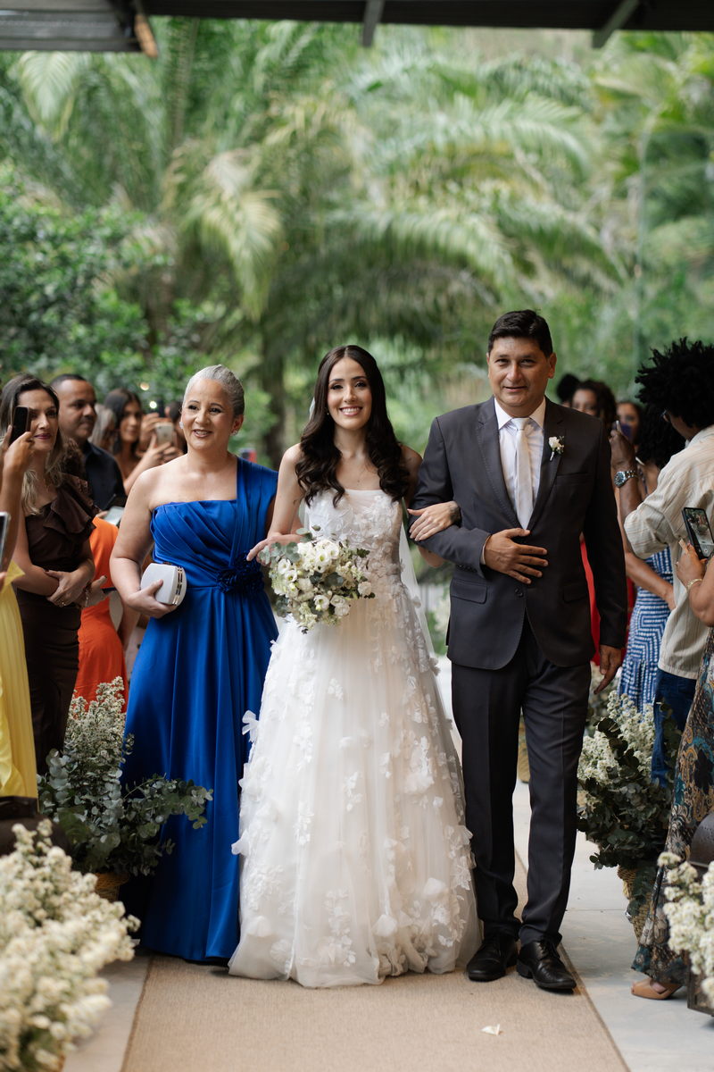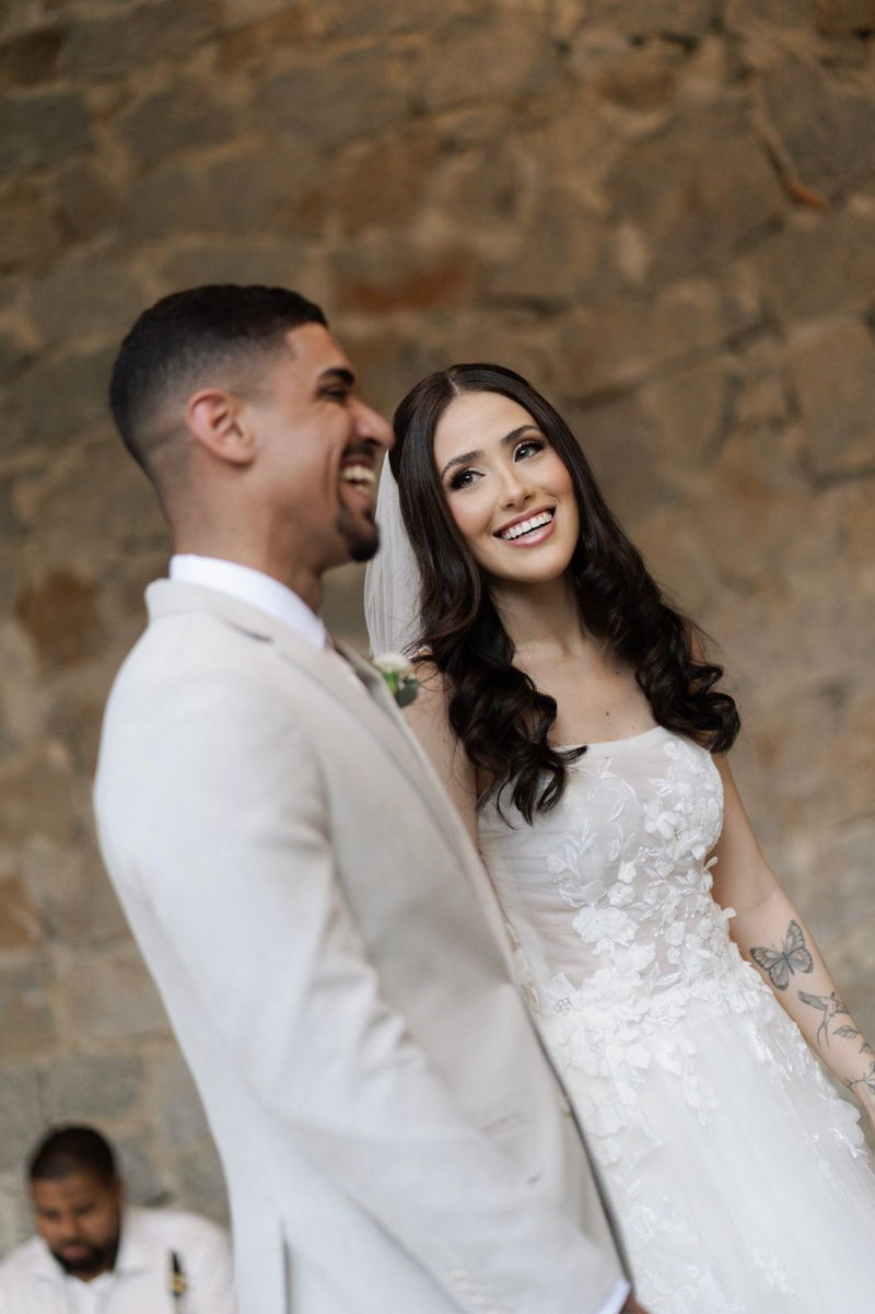 Victoria estava deslumbrante: seu sorriso natural e o brilho no olhar revelavam a felicidade de quem vive um dos dias mais especiais da vida. O vestido de noiva Internovias escolhido por ela era uma verdadeira obra de delicadeza e sofisticação. A peça apresentava aplicações tridimensionais que cobriam toda a extensão do vestido, criando um padrão romântico que dialogava perfeitamente com o cenário natural. Sua linda cauda finalizava o modelo de forma ainda mais encantadora.