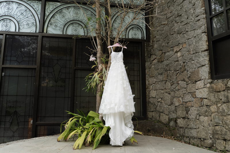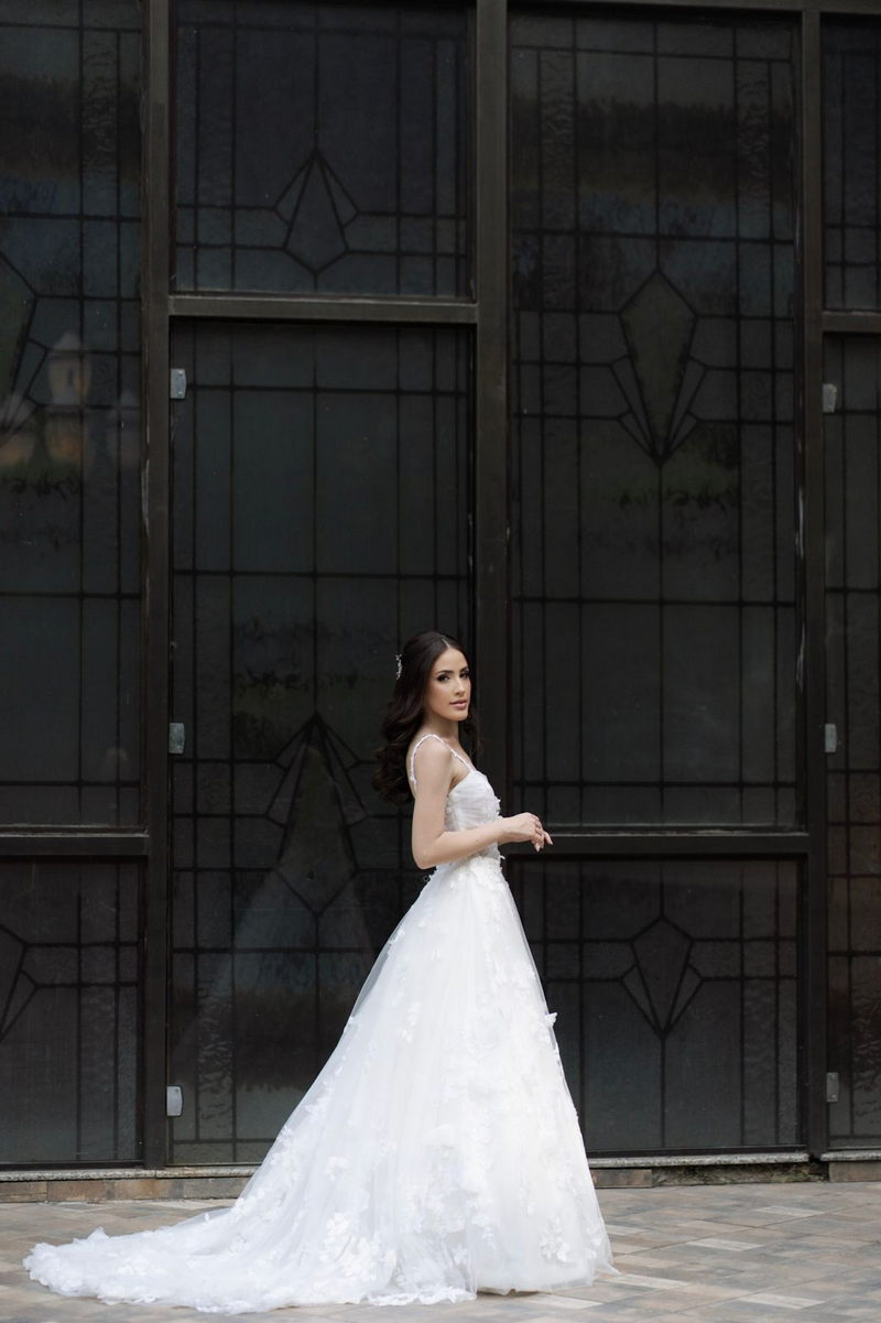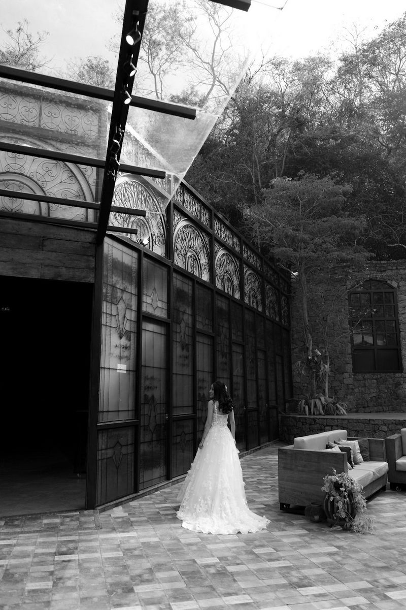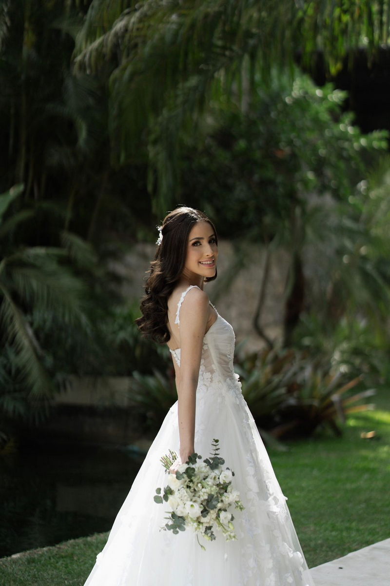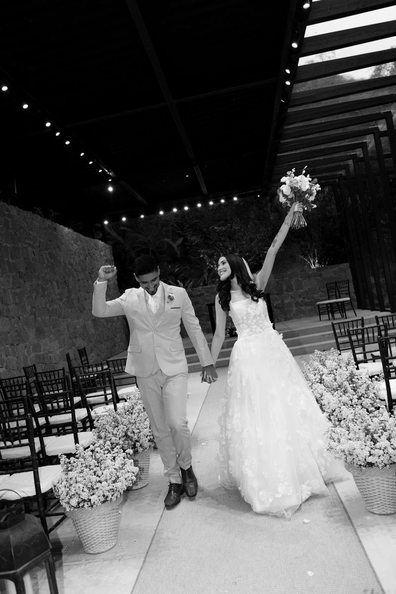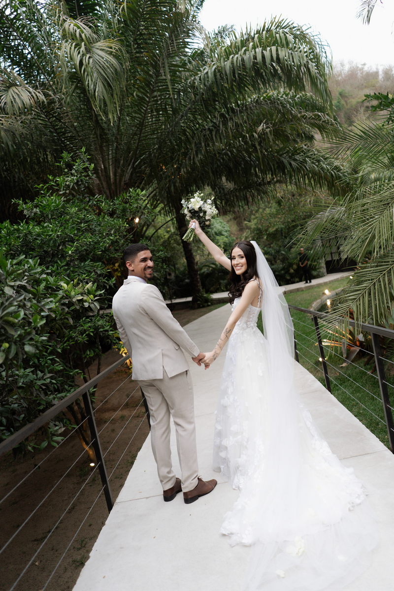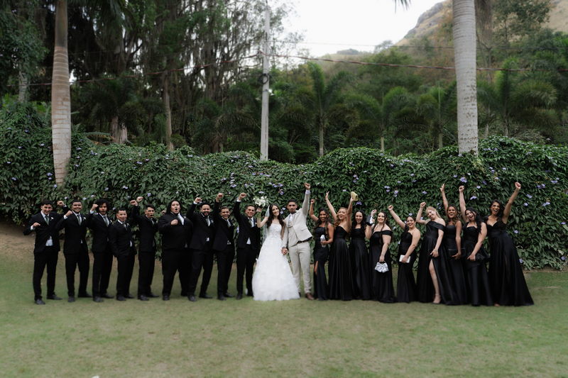 Victoria estava deslumbrante: seu sorriso natural e o brilho no olhar revelavam a felicidade de quem vive um dos dias mais especiais da vida. O vestido de noiva Internovias escolhido por ela era uma verdadeira obra de delicadeza e sofisticação. A peça apresentava aplicações tridimensionais que cobriam toda a extensão do vestido, criando um padrão romântico que dialogava perfeitamente com o cenário natural. Sua linda cauda finalizava o modelo de forma ainda mais encantadora.