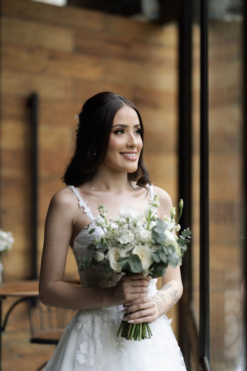 A beleza de Victoria ganhou ainda mais destaque com o trabalho impecável de @sabrinafernandesmake, que criou uma maquiagem e um penteado que realçavam a naturalidade da noiva sem perder a sofisticação necessária para o grande dia.