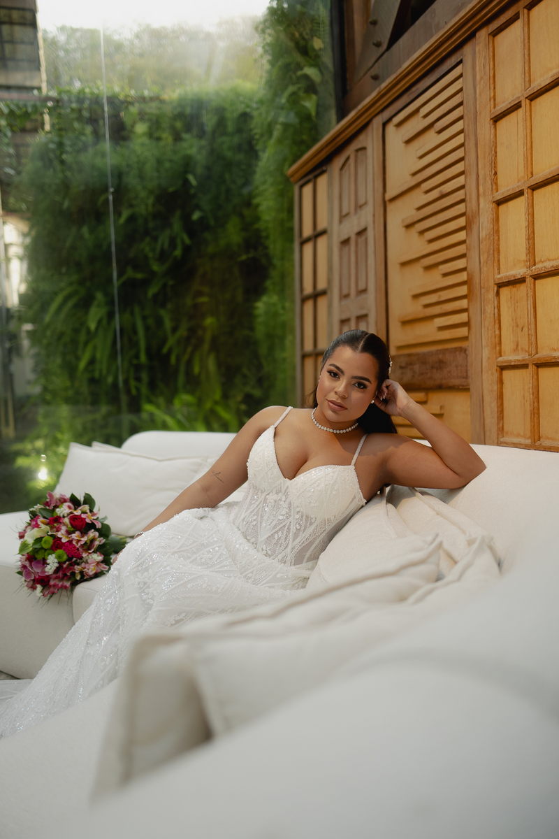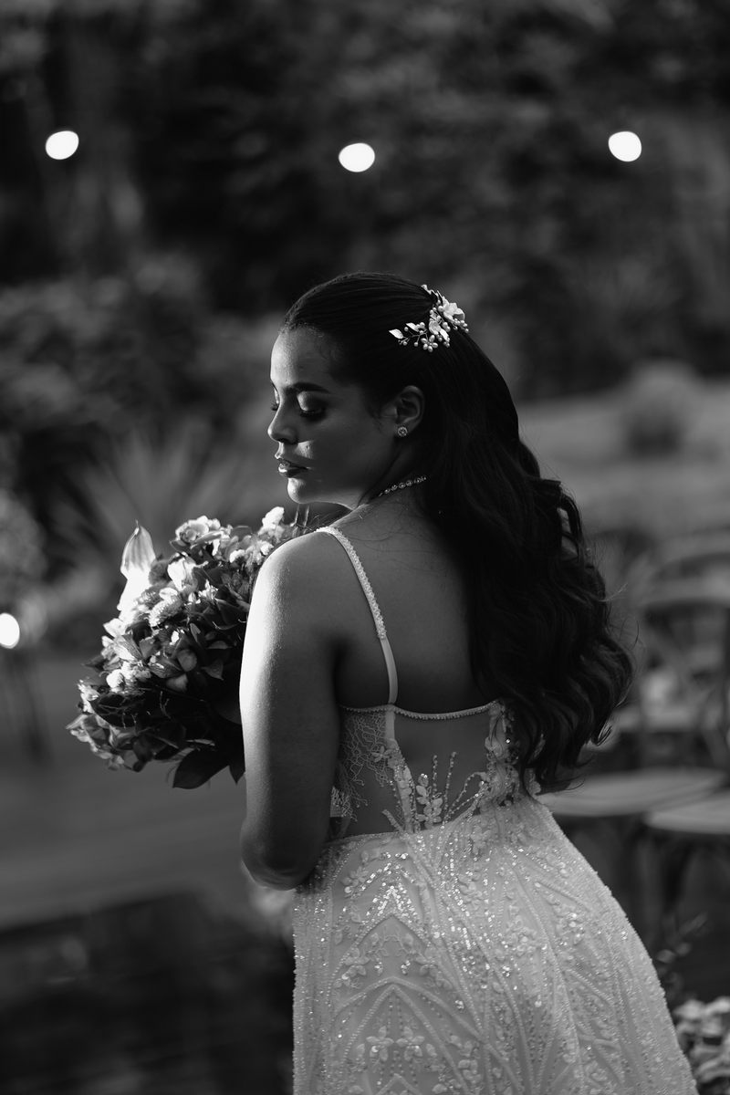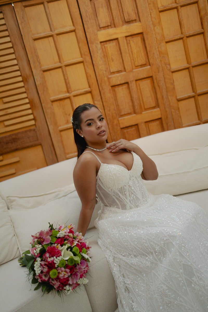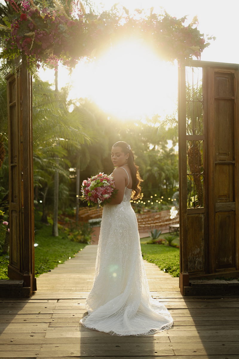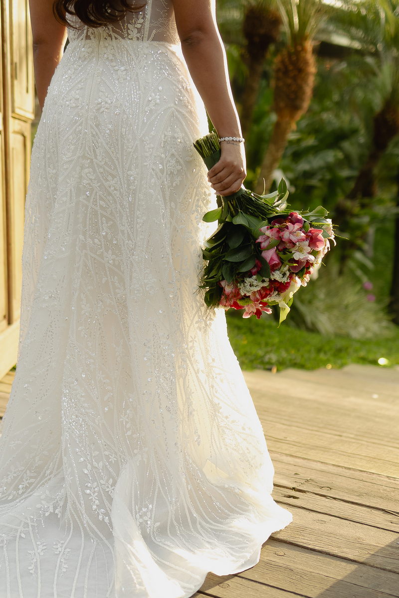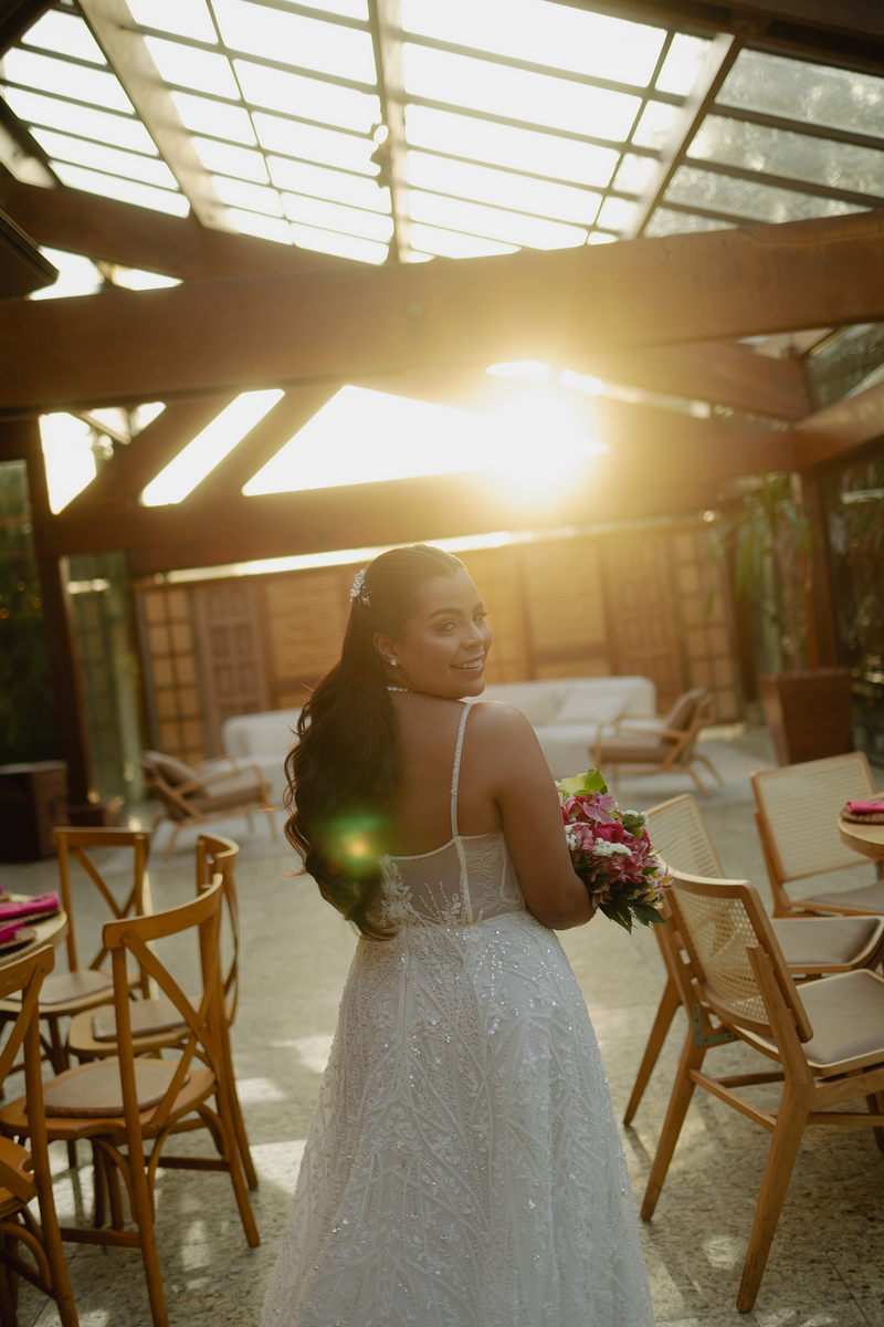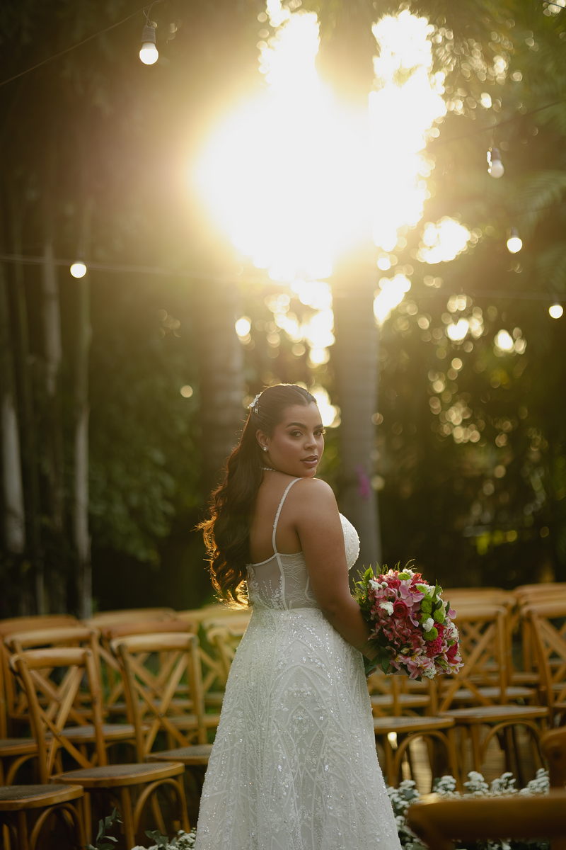 Victoria estava absolutamente deslumbrante, e seu sorriso iluminava o ambiente. Seu vestido de noiva Internovias era a tradução perfeita dessa delicadeza. Com alças finas que emolduravam os ombros de forma sutil, o modelo trazia um trabalho de renda absolutamente belíssimo que cobria toda a peça. A renda, protagonista absoluta do vestido, apresentava um trabalho artesanal impecável, com detalhes com leve brilho e transparência distribuídos harmoniosamente por toda a extensão do tecido. Esse brilho discreto captava a luz de forma suave, criando reflexos delicados que valorizavam ainda mais a sofisticação do bordado. Era um modelo que equilibrava perfeitamente delicadeza e presença, sem exageros, apenas pura elegância.