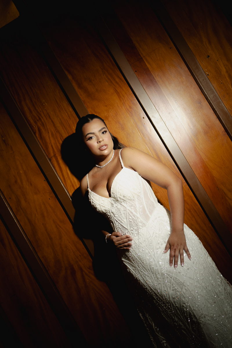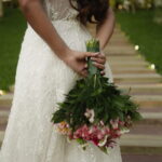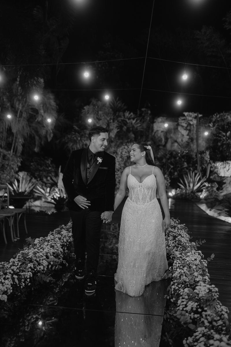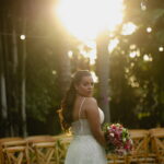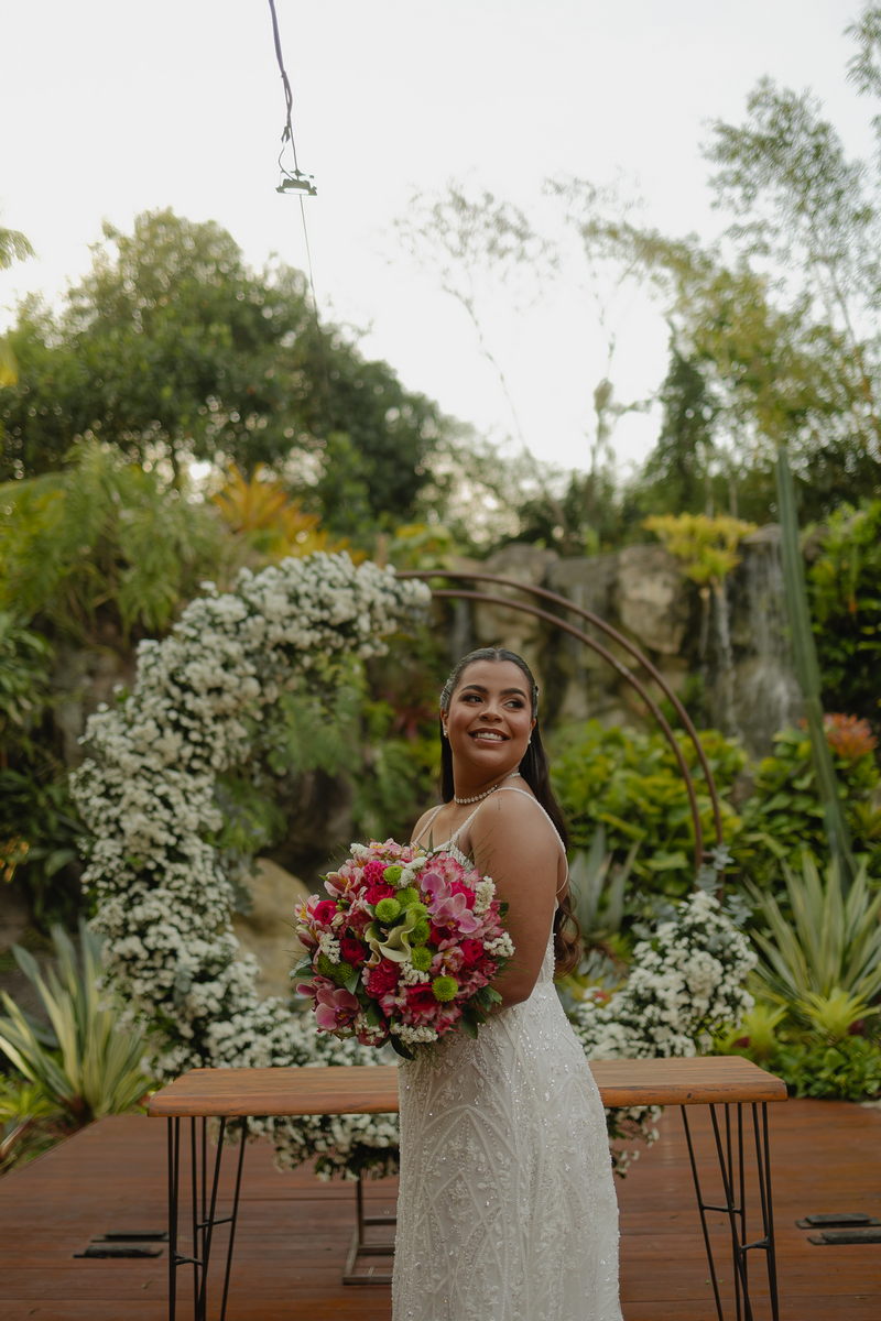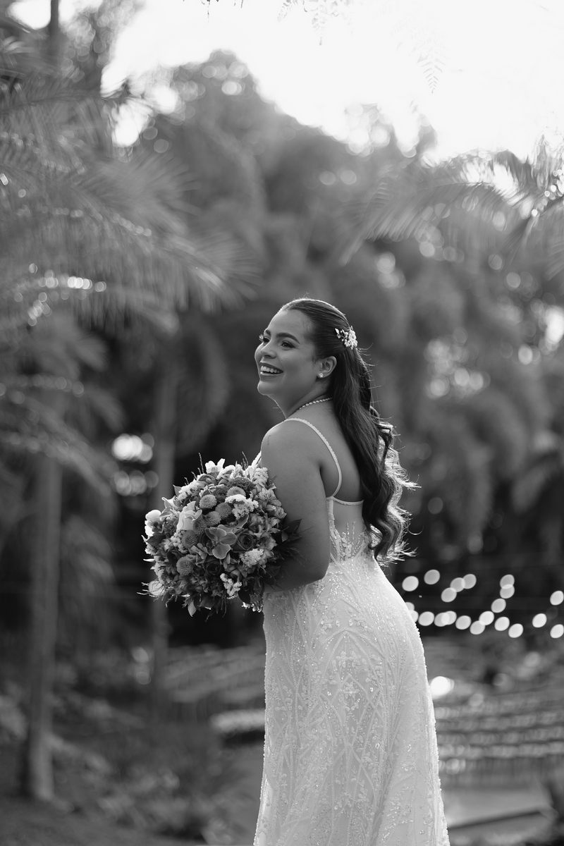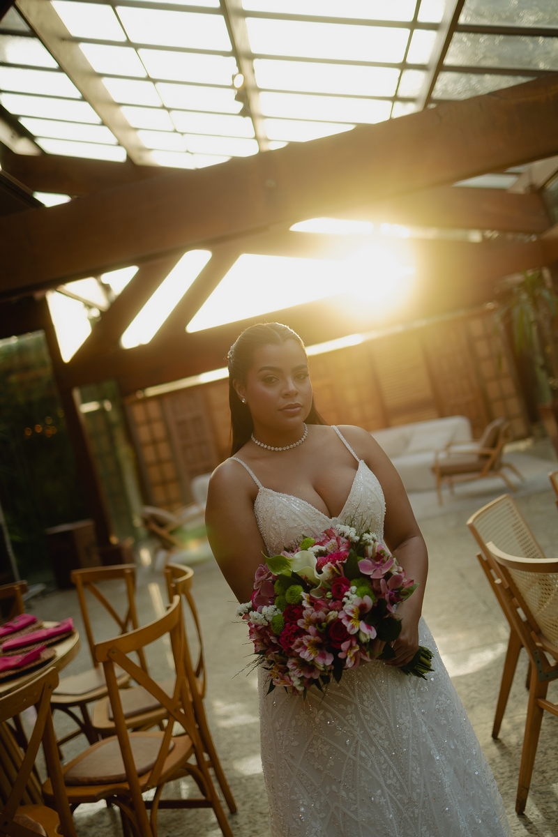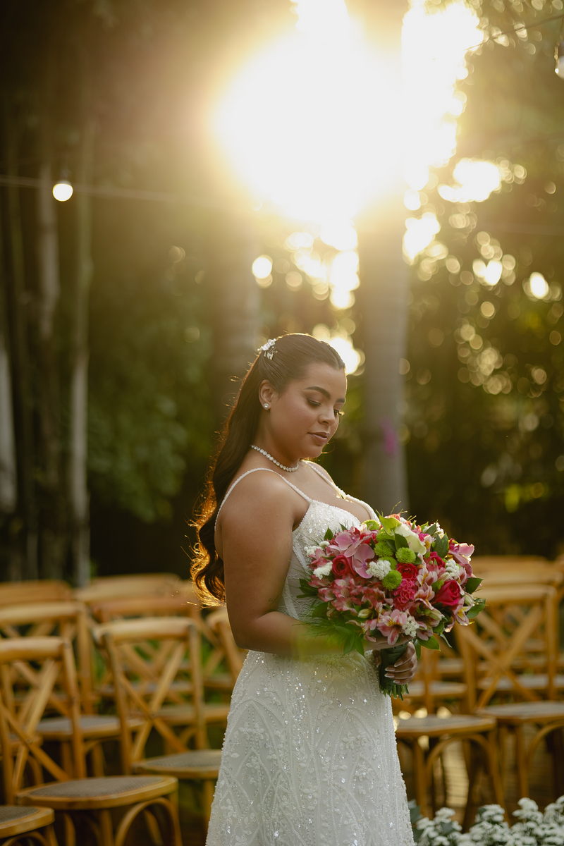Victoria estava absolutamente deslumbrante, e seu sorriso iluminava o ambiente. Seu vestido de noiva Internovias era a tradução perfeita dessa delicadeza. Com alças finas que emolduravam os ombros de forma sutil, o modelo trazia um trabalho de renda absolutamente belíssimo que cobria toda a peça. A renda, protagonista absoluta do vestido, apresentava um trabalho artesanal impecável, com detalhes com leve brilho e transparência distribuídos harmoniosamente por toda a extensão do tecido. Esse brilho discreto captava a luz de forma suave, criando reflexos delicados que valorizavam ainda mais a sofisticação do bordado. Era um modelo que equilibrava perfeitamente delicadeza e presença, sem exageros, apenas pura elegância.